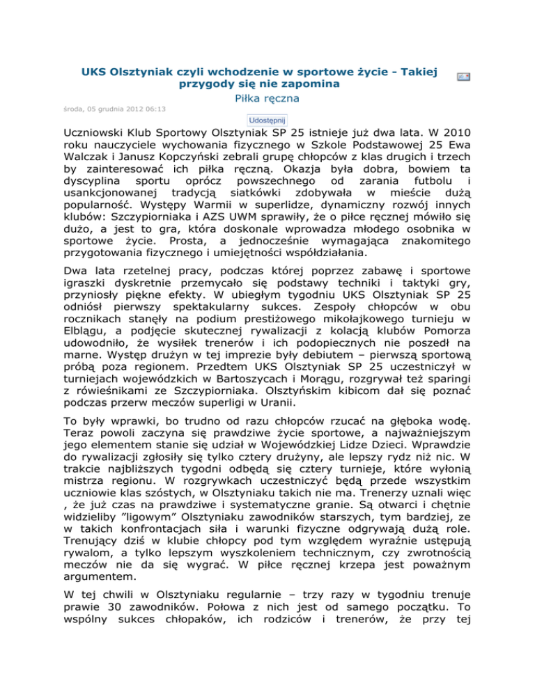 UKS Olsztyniak czyli wchodzenie w sportowe życie - Takiej przygody się nie zapomina Piłka ręczna środa, 05 grudnia 2012 06:13 Udostępnij Uczniowski Klub Sportowy Olsztyniak SP 25 istnieje już dwa lata. W 2010 roku nauczyciele wychowania fizycznego w Szkole Podstawowej 25 Ewa Walczak i Janusz Kopczyński zebrali grupę chłopców z klas drugich i trzech by zainteresować ich piłka ręczną. Okazja była dobra, bowiem ta dyscyplina sportu oprócz powszechnego od zarania futbolu i usankcjonowanej tradycją siatkówki zdobywała w mieście dużą popularność. Występy Warmii w superlidze, dynamiczny rozwój innych klubów: Szczypiorniaka i AZS UWM sprawiły, że o piłce ręcznej mówiło się dużo, a jest to gra, która doskonale wprowadza młodego osobnika w sportowe życie. Prosta, a jednocześnie wymagająca znakomitego przygotowania fizycznego i umiejętności współdziałania. Dwa lata rzetelnej pracy, podczas której poprzez zabawę i sportowe igraszki dyskretnie przemycało się podstawy techniki i taktyki gry, przyniosły piękne efekty. W ubiegłym tygodniu UKS Olsztyniak SP 25 odniósł pierwszy spektakularny sukces. Zespoły chłopców w obu rocznikach stanęły na podium prestiżowego mikołajkowego turnieju w Elblągu, a podjęcie skutecznej rywalizacji z kolacją klubów Pomorza udowodniło, że wysiłek trenerów i ich podopiecznych nie poszedł na marne. Występ drużyn w tej imprezie były debiutem – pierwszą sportową próbą poza regionem. Przedtem UKS Olsztyniak SP 25 uczestniczył w turniejach wojewódzkich w Bartoszycach i Morągu, rozgrywał też sparingi z rówieśnikami ze Szczypiorniaka. Olsztyńskim kibicom dał się poznać podczas przerw meczów superligi w Uranii. To były wprawki, bo trudno od razu chłopców rzucać na głęboka wodę. Teraz powoli zaczyna się prawdziwe życie sportowe, a najważniejszym jego elementem stanie się udział w Wojewódzkiej Lidze Dzieci. Wprawdzie do rywalizacji zgłosiły się tylko cztery drużyny, ale lepszy rydz niż nic. W trakcie najbliższych tygodni odbędą się cztery turnieje, które wyłonią mistrza regionu. W rozgrywkach uczestniczyć będą przede wszystkim uczniowie klas szóstych, w Olsztyniaku takich nie ma. Trenerzy uznali więc , że już czas na prawdziwe i systematyczne granie. Są otwarci i chętnie widzieliby ”ligowym” Olsztyniaku zawodników starszych, tym bardziej, ze w takich konfrontacjach siła i warunki fizyczne odgrywają dużą role. Trenujący dziś w klubie chłopcy pod tym względem wyraźnie ustępują rywalom, a tylko lepszym wyszkoleniem technicznym, czy zwrotnością meczów nie da się wygrać. W piłce ręcznej krzepa jest poważnym argumentem. W tej chwili w Olsztyniaku regularnie – trzy razy w tygodniu trenuje prawie 30 zawodników. Połowa z nich jest od samego początku. To wspólny sukces chłopaków, ich rodziców i trenerów, że przy tej konkurencji innych dyscyplin nie tylko sportowych klub rozwija się i wyznacza sobie nowe cele. Współpraca z rodzicami ma dziś ogromne znaczenie. To nie tylko kwestia utrzymania dyscypliny i konsekwencji w pracy treningowej, to również nieoceniona pomoc w sprawach organizacyjnych, choćby tak prozaicznych jak wyjazdy na mecze i turnieje. Tu nie ma wielkiej filozofii. Zawsze znajdzie się kilku chętnych rodziców, którzy samochodami prywatnymi zawiozą chłopców na mecze. Ukształtowały się właściwe relacje, stworzył się swoisty team. To fantastycznie, że rodzice uświadomili sobie, że wychowanie przez sport jest znakomitym pomysłem na wejście w dorosłość. Plany Olsztyniaka są ambitne. Może uda się stworzyć w Zespole Szkół klasy sportowe, które pozwoliłyby z jednej strony zintensyfikować szkolenie, z drugiej zachować jego ciągłość, bo przecież najważniejsze by młodzież została przy sporcie w każdym momencie edukacji od podstawówki po maturę. To jasne, że teoria nie zawsze znajduje przełożenie w praktyce, a często ambitne zamierzenia trafiają na ogromne przeszkody – przede wszystkim finansowe. Ale bez stawiania sobie nowych wyzwań, nie ma postępu. SP 25 będąca częścią całości Zespołu Szkół, który ze względu na swój potencjał młodzieży i lokalizacje w centrum wielkiego osiedla ma bardzo szeroka ofertę sportową. Piłkarze ręczni są jedną z najmłodszych sekcji, starają się jednak dbać o wizerunek swojej „budy” tak jak siatkarze, szermierze, tenisiści stołowi i siłacze z Herkulesa. Wszyscy znaleźli tam swoje miejsce, każdy szanuje kolegów z innych dyscyplin, bo tak naprawdę reprezentują na zawodach sportowych szkołę. Nie raz trudno się pomieścić na obiektach, a przypadku szczypiornistów sprawa komplikuje się jeszcze bardziej. Sala, w której trenują nie jest pełnowymiarowa. Można to tolerować podczas zajęć szkoleniowych, ale już rozgrywanie oficjalnych meczów nie wchodzi w rachubę, trzeba szukać pełnowymiarowego obiektu. A tych w Olsztynie jest jak na lekarstwo. Jakie są najbliższe plany Olsztyniaka? Oprócz wspominanej ligi, udział w kolejnych turniejach. Już w najbliższą sobotę w Uranii odbędzie się I Turniej Handball o Puchar MPEC (rocznik 2001 i młodsi). Olsztyniak zmierzy swe siły z lokalnymi rywalami ze Szczypiorniaka, przyjadą też zespoły z Bartoszyc i Morąga. Potem udział w turniejach w: Ciechanowie, Elblągu, może gdzieś na Pomorzu (podczas ostatniego turnieju nawiązano kilka interesujących kontaktów), kolejny obóz letni. Rozpoczyna się prawdziwe sportowe życie, w którym nie brakuje wyrzeczeń, ale to wspaniała przygoda. Pamięta się ją przez długie lata…