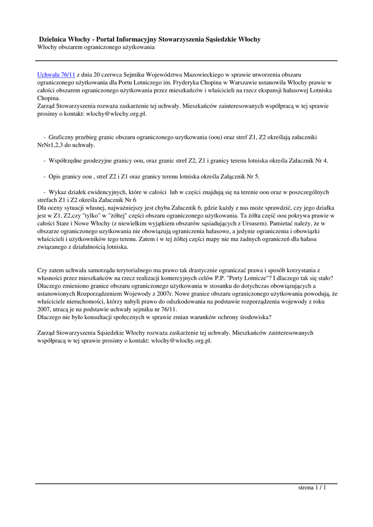 Dzielnica Włochy - Portal Informacyjny Stowarzyszenia Sąsiedzkie Włochy Włochy obszarem ograniczonego użytkowania Uchwała 76/11 z dnia 20 czerwca Sejmiku Województwa Mazowieckiego w sprawie utworzenia obszaru ograniczonego użytkowania dla Portu Lotniczego im. Fryderyka Chopina w Warszawie ustanowiła Włochy prawie w całości obszarem ograniczonego użytkowania przez mieszkańców i właścicieli na rzecz ekspansji hałasowej Lotniska Chopina. Zarząd Stowarzyszenia rozważa zaskarżenie tej uchwały. Mieszkańców zainteresowanych współpracą w tej sprawie prosimy o kontakt: [email protected]. - Graficzny przebieg granic obszaru ograniczonego uzytkowania (oou) oraz stref Z1, Z2 określają załaczniki NrNr1,2,3 do uchwały. - Współrzędne geodezyjne granicy oou, oraz granic stref Z2, Z1 i granicy terenu lotniska określa Załacznik Nr 4. - Opis granicy oou , stref Z2 i Z1 oraz granicy terenu lotniska określa Załącznik Nr 5. - Wykaz działek ewidencyjnych, które w całości lub w części znajdują się na terenie oou oraz w poszczególnych strefach Z1 i Z2 określa Załacznik Nr 6 Dla oceny sytuacji własnej, najważniejszy jest chyba Załacznik 6, gdzie każdy z nas może sprawdzić, czy jego działka jest w Z1, Z2,czy "tylko" w "żółtej" części obszaru ograniczonego użytkowania. Ta żółta część oou pokrywa prawie w całości Stare i Nowe Włochy (z niewielkim wyjątkiem obszarów sąsiadujących z Ursusem). Pamietać należy, że w obszarze ograniczonego uzytkowania nie obowiązują ograniczenia hałasowe, a jedynie ograniczenia i obowiązki właścicieli i użytkowników tego terenu. Zatem i w tej żółtej części mapy nie ma żadnych ograniczeń dla hałasu związanego z działalnością lotniska. Czy zatem uchwała samorządu terytorialnego ma prawo tak drastycznie ograniczać prawa i sposób korzystania z własności przez mieszkańców na rzecz realizacji komercyjnych celów P.P. "Porty Lotnicze"? I dlaczego tak się stało? Dlaczego zmieniono granice obszaru ograniczonego użytkowania w stosunku do dotychczas obowiązujących a ustanowionych Rozporządzeniem Wojewody z 2007r. Nowe granice obszaru ograniczonego użytkowania powodują, że właściciele nieruchomości, którzy nabyli prawo do odszkodowania na podstawie rozporządzenia wojewody z roku 2007, utracą je na podstawie uchwały sejmiku nr 76/11. Dlaczego nie było konsultacji społecznych w sprawie zmian warunków ochrony środowiska? Zarząd Stowarzyszenia Sąsiedzkie Włochy rozważa zaskarżenie tej uchwały. Mieszkańców zainteresowanych współpracą w tej sprawie prosimy o kontakt: [email protected]. strona 1 / 1