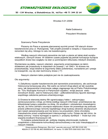 STOWARZYSZENIE EKOLOGICZNE 50 -134 Wrocław, ul.Białoskórnicza 26, tel/fax +48 71 344 22 64 Wrocław 5.01.2009r Rafał Dutkiewicz Prezydent Wrocławia Szanowny Panie Prezydencie Piszemy do Pana w sprawie planowanej wycinki ponad 100 starych drzewkasztanowców przy ul. Wyścigowej. Taki projekt powstał w związku z rozpoczynanym remontem tej ulicy, którego to celu nie kwestionujemy. Według naszych informacji pierwotnie nie było w planie aż takiej skali wyrębu wiekowych, cennych drzew. W ostatnim czasie pojawiła się jednak koncepcja wycięcia wszystkich drzew bez względu na stan (z pominięciem kilkunastu młodych drzewek). Wymieniane są słabe, naszym zdaniem. argumenty przemawiające za takim działaniem jak przeszkody w dojazdach do posesji ( od 1945 r. te drzewa nie przeszkadzały, wizja lokalne te argumenty słabo potwierdza), rozrastanie pni i presja na krawężniki, czy zły stan techniczny drzew ( !?) Naszym zdaniem takie podejście jest nie do zaakceptowania. Oto argumenty: 1) Zabytkowy szpaler kasztanowców jest wprawdzie przerzedzony, ale zachowuje historyczną kompozycję ulicy. Nie warto za remont drogi płacić aż tak wysokiej ceny, jak bezpowrotne zniszczenie całego ciągnącego się od Parku Południowego do Toru Wyścigów Konnych w Partynicach szpaleru wciąż jeszcze wielu dorodnych drzew. Jest to historyczny ślad – półtorakilometrowy łącznik dawnego wspólnego założenia parkowo-urbanistycznego. 2) Drzewa te stanowią istotny filtr ograniczający hałas i zatrzymujący zanieczyszczenia z drogi, po której według naszych informacji przemieszcza się kilkadziesiąt tysięcy pojazdów na dobę. Ze smutkiem i zdziwieniem dowiadujemy się też, że mimo zamiaru usunięcia większości drzew nie przewiduje się podczas prawie półtorarocznego remontu kapitalnego drogi budowy ekranów akustycznych (ani nawet zarezerwowania pod nie terenu na przyszłość), które chroniłyby mieszkańców przed uciążliwościami intensywnego ruchu. Dzieje się tak mimo, że takiej ochrony można wymagać w oparciu o przepisy dyrektyw i może być ona wsparta środkami finansowymi UE. To kolejne potwierdzenie jak politykę miejską zdominowało myślenie urzędników o dobrostanie komunikacji samochodowej a nie ludzi mieszkających w naszym mieście. Stowarzyszenie Ekologiczne „Eko-Unia”, www.eko-unia.org.pl, NIP 954 19 80 345, REGON 27 25 705 48, KRS 0000003647, Nr konta: 73 1050 1575 1000 0022 9367 2750, STOWARZYSZENIE EKOLOGICZNE 50 -134 Wrocław, ul.Białoskórnicza 26, tel/fax +48 71 344 22 64 3) Szpaler kasztanowców jest istotnym elementem ekosystemu miejskiego, na który składają się też inne tereny zielone. Mamy szereg dowodów na nadmierną łatwość wycinania starych drzew i robienia betonowych studni miejskich i w to miejsce niekiedy sadzenia młodych, które tę samą funkcję ekologiczną będą wypełniały dopiero za lat kilkadziesiąt. Ewentualne cięcia sanitarno pielęgnacyjne w stosunku do tych starych drzew zastępuje się ich całkowitą wycinką lub szkodliwymi ostrymi cięciami przekształcającymi stare korony drzew w szpalerach w nowe nieestetyczne potworki. 4) Należy zwrócić uwagę na rozwiązania alternatywne, jak na przykład likwidacja pasa rozdzielczego i odsunięcie zewnętrznych krawężników od kasztanowców, a właściwie ich powrót do pozycji sprzed 1969 roku. To podczas dokonanej wtedy przebudowy poszerzono jezdnie przybliżając je o pół metra do drzew. Na sąsiednim, wylotowym odcinku Karkonoskiej ani pasa rozdzielczego ani nawet bariery rozdzielającej nie ma, choć natężenie ruchu i szybkości samochodów są tam jeszcze większe niż na ulicy Wyścigowej. Nie kwestionujemy zamiaru wycięcia niektórych drzew, chorych lub uniemożliwiających modernizację jezdni, który może zapewnić istotną poprawę bezpieczeństwa komunikacyjnego. Postulujemy jednak weryfikację całego zamierzenia dotyczącego wycięcia ponad 100 kasztanowców oraz jeszcze raz całego projektu remontu ( patrz wyżej pkt. 4). Proponujemy poddanie kwalifikacji i ocenie stanu tych drzew przez specjalistów ( dendrologów). Prosimy Pana Prezydenta o interwencję i weryfikację projektu remontu ul. Wyścigowej związanego z wycinaniem całego szpaleru starych i zabytkowych kasztanowców. Przy okazji zwracamy się z prośbą, aby Pan Prezydent spowodował, by przyszłe projekty rozbudowy czy modernizacji naszego miasta były opracowywane i konsultowane przy udziale ekspertów i obywateli z fachowym przygotowaniem w zakresie zabytków, kształtowania zieleni, ekologii środowiska miejskiego oraz dendrologii. Wspólnie z inżynierami i technikami powinni oni rozważnie kształtować przyszłość naszego miasta. Od takiej współpracy zależeć będą warunki życia w nim następnych pokoleń, prawdopodobnie wystawionych na skutki m.in. nasilających się letnich upałów. Warto pamiętać, że na przykład w 2003r. w Europie Zachodniej upały spowodowały falę zgonów ok. 70 000 ludzi starszych, głównie w dużych miastach. Radosław Gawlik Prezes Stowarzyszenia Ekologicznego Eko-Unia Stowarzyszenie Ekologiczne „Eko-Unia”, www.eko-unia.org.pl, NIP 954 19 80 345, REGON 27 25 705 48, KRS 0000003647, Nr konta: 73 1050 1575 1000 0022 9367 2750,