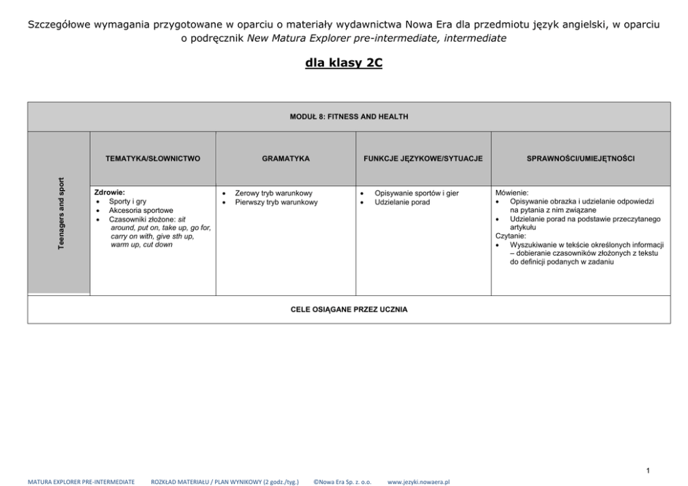 Szczegółowe wymagania przygotowane w oparciu o materiały wydawnictwa Nowa Era dla przedmiotu język angielski, w oparciu o podręcznik New Matura Explorer pre-intermediate, intermediate dla klasy 2C MODUŁ 8: FITNESS AND HEALTH Teenagers and sport TEMATYKA/SŁOWNICTWO Zdrowie: Sporty i gry Akcesoria sportowe Czasowniki złożone: sit around, put on, take up, go for, carry on with, give sth up, warm up, cut down FUNKCJE JĘZYKOWE/SYTUACJE GRAMATYKA Zerowy tryb warunkowy Pierwszy tryb warunkowy Opisywanie sportów i gier Udzielanie porad SPRAWNOŚCI/UMIEJĘTNOŚCI Mówienie: Opisywanie obrazka i udzielanie odpowiedzi na pytania z nim związane Udzielanie porad na podstawie przeczytanego artykułu Czytanie: Wyszukiwanie w tekście określonych informacji – dobieranie czasowników złożonych z tekstu do definicji podanych w zadaniu CELE OSIĄGANE PRZEZ UCZNIA 1 MATURA EXPLORER PRE-INTERMEDIATE ROZKŁAD MATERIAŁU / PLAN WYNIKOWY (2 godz./tyg.) ©Nowa Era Sp. z. o.o. www.jezyki.nowaera.pl MATERIAŁ JĘZYKOWY/ SPRAWNOŚCI SŁOWNICTWO Poziom podstawowy Uczeń: Poziom ponadpodstawowy Uczeń: zna nazwy najpopularniejszych sportów i gier oraz akcesoriów z nimi związanych pamięta większość poznanych czasowników złożonych i poprawnie łączy je z właściwą definicją ma bogaty zasób słownictwa z dziedziny sportów i gier stosuje we własnych wypowiedziach poznane czasowniki złożone; uzupełnia luki w zdaniach właściwymi czasownikami złożonymi GRAMATYKA zna zasady dotyczące budowy zdań w zerowym i pierwszym trybie warunkowym, rozumie różnice pomiędzy nimi i w miarę poprawnie stosuje te konstrukcje w praktyce rozumie różnice pomiędzy zerowym a pierwszym trybem warunkowym i poprawnie stosuje te konstrukcje w praktyce MÓWIENIE w miarę poprawnie opisuje obrazek i odpowiada na pytania z nim związane udziela prostych porad na podstawie przeczytanego artykułu szczegółowo opisuje obrazek i odpowiada na pytania z nim związane udziela bardziej złożonych porad, poprawnie wykorzystując poznane słownictwo i konstrukcje językowe rozumie sens ogólny przeczytanego artykułu i wykorzystując kontekst, dopasowuje część wytłuszczonych w nim czasowników złożonych do podanych definicji rozumie sens przeczytanego artykułu i wykorzystując kontekst, poprawnie dopasowuje wytłuszczone w nim czasowniki złożone do podanych definicji CZYTANIE Medical alternatives TEMATYKA/SŁOWNICTWO Zdrowie: Medycyna ludowa, tradycyjne i alternatywne sposoby leczenia FUNKCJE JĘZYKOWE/SYTUACJE GRAMATYKA Pierwszy tryb warunkowy unless Udzielanie porad SPRAWNOŚCI/UMIEJĘTNOŚCI Czytanie: Dopasowywanie pytań do akapitów Słuchanie: Test wielokrotnego wyboru Mówienie: Rozmowa ogólna na temat medycyny alternatywnej i jej skuteczności CELE OSIĄGANE PRZEZ UCZNIA 2 MATURA EXPLORER PRE-INTERMEDIATE ROZKŁAD MATERIAŁU / PLAN WYNIKOWY (2 godz./tyg.) ©Nowa Era Sp. z. o.o. www.jezyki.nowaera.pl MATERIAŁ JĘZYKOWY/ SPRAWNOŚCI Poziom podstawowy Uczeń: Poziom ponadpodstawowy Uczeń: SŁOWNICTWO zna i stosuje w praktyce podstawowe słownictwo związane z zapobieganiem chorobom i leczeniem ma bogaty zasób słownictwa związanego z zapobieganiem chorobom i leczeniem GRAMATYKA rozumie znaczenie wyrazu unless, w zadaniu polegającym na wyborze pomiędzy if a unless przeważnie dokonuje właściwego wyboru, ale ma problemy ze stosowaniem tych wyrazów w praktyce rozumie różnicę pomiędzy wyrazami if a unless w zdaniach warunkowych i poprawnie używa tych wyrazów we własnych wypowiedziach CZYTANIE rozumie sens ogólny przeczytanego tekstu o krioterapii i w miarę poprawnie dopasowuje pytania do poszczególnych akapitów rozumie sens ogólny przeczytanego tekstu o krioterapii i bezbłędnie dopasowuje pytania do poszczególnych akapitów SŁUCHANIE rozumie sens ogólny wysłuchanej rozmowy, ale niekiedy ma problemy z wyborem właściwej odpowiedzi spośród podanych możliwości rozumie sens ogólny wysłuchanej rozmowy i wybiera właściwe odpowiedzi spośród podanych możliwości MÓWIENIE w prostych słowach włącza się do ogólnej dyskusji na temat medycyny alternatywnej i jej skuteczności bierze czynny udział w ogólnej dyskusji na temat medycyny alternatywnej i jej skuteczności Medical problems TEMATYKA/SŁOWNICTWO GRAMATYKA Zdrowie: Choroby i dolegliwości Objawy Diagnoza FUNKCJE JĘZYKOWE/SYTUACJE Wizyta u lekarza: Uzyskiwanie i udzielanie informacji na temat dolegliwości Formułowanie diagnozy Udzielanie porad: radzenie, ostrzeganie SPRAWNOŚCI/UMIEJĘTNOŚCI Słuchanie: Wyszukiwanie w tekście określonych informacji – uzupełnianie tabelki; uzupełnianie luk w zdaniach zgodnie z nagraniem Mówienie: Uzyskiwanie i udzielanie informacji na temat dolegliwości – dialog pomiędzy lekarzem a pacjentem Pisanie: Notatka Strona internetowa z poradami dla odwiedzających Polskę Wymowa: Ćwiczenie akcentu zdaniowego CELE OSIĄGANE PRZEZ UCZNIA 3 MATURA EXPLORER PRE-INTERMEDIATE ROZKŁAD MATERIAŁU / PLAN WYNIKOWY (2 godz./tyg.) ©Nowa Era Sp. z. o.o. www.jezyki.nowaera.pl MATERIAŁ JĘZYKOWY/ SPRAWNOŚCI Poziom podstawowy Uczeń: Poziom ponadpodstawowy Uczeń: SŁOWNICTWO zna i stosuje w praktyce podstawowe słownictwo związane z chorobami, urazami i objawami zna i stosuje w praktyce różnorodne słownictwo związane z chorobami, ich objawami i urazami SŁUCHANIE potrafi częściowo wyszukać w wysłuchanym tekście określone informacje i uzupełnić nimi tabelkę w miarę poprawnie uzupełnia luki w zdaniach zgodnie z nagraniem potrafi poprawnie wyszukać określone informacje i uzupełnić nimi tabelkę uzupełnia luki w zdaniach zgodnie z nagraniem posługując się bogatym zasobem słownictwa i struktur językowych, bierze udział w dialogu pomiędzy lekarzem a pacjentem, uzyskując informacje i udzielając ich na temat dolegliwości, objawów, diagnozy; udziela szczegółowych porad dotyczących leczenia pisze poprawną notatkę na podstawie podanego wzoru, wykorzystuje 