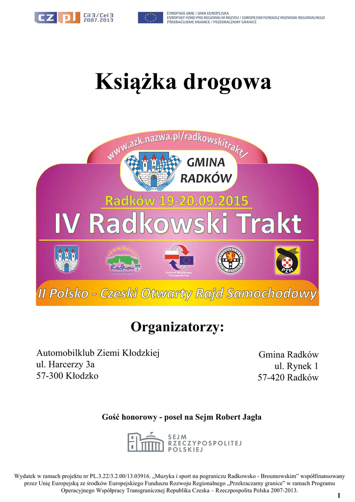 Książka drogowa Organizatorzy: Automobilklub Ziemi Kłodzkiej ul. Harcerzy 3a 57-300 Kłodzko Gmina Radków ul. Rynek 1 57-420 Radków Gość honorowy - poseł na Sejm Robert Jagła Wydatek w ramach projektu nr PL.3.22/3.2.00/13.03916. „Muzyka i sport na pograniczu Radkowsko - Broumowskim” współfinansowany przez Unię Europejską ze środków Europejskiego Funduszu Rozwoju Regionalnego „Przekraczamy granice” w ramach Programu Operacyjnego Współpracy Transgranicznej Republika Czeska – Rzeczpospolita Polska 2007-2013. 1 KSIĄŻKA DROGOWA Konkursowa Jazda Samochodem IV „Radkowski Trakt” Witamy na Konkursowej Jeździe Samochodem – III „Radkowski Trakt” Książka drogowa została opracowana w miesiącu sierpniu i odzwierciedla stan oznakowania dróg z tego okresu. Książka drogowa zawiera komplet informacji o trasie Konkursowej Jazdy Samochodem. Życzymy pomyślnej i bezpiecznej Konkursowej Jazdy Samochodem Dyrektor rajdu Burmistrz Miasta i Gminy Radków Marek Niewiadomy Jan Bednarczyk SPEED LIMITS 140 kph – highways 100 kph – motorways 90 kph – other Road 50 kph – buildings area OGRANICZENIA PRĘDKOŚCI 140 km/h – autostrady 100 km/h – drogi ekspresowe 90 km/h – pozostałe drogi 50 km/h – teren zabudowany TELEPHON TELEFONY POLICE 997 POLICJA 997 FIRE 998 STRAŻ POŻARNA 998 EMERGENCY 999 EUROPEAN EMERGENCY NUMBER 112 Director rally EUROPEJSKI NUMER RATUNKOWY 112 Dyrektor rajdu 667400642 Assistant Director of Security POGOTOWIE RATUNKOWE 999 695989202 Opracowanie trasy i książki drogowej: 667400642 Asyst. Dyr. ds. bezpieczeństwa 695989202 Gmina Radków – Komendant Straży Miejskiej w Radkowie Leszek Dorszewski 2 Procedura bezpieczeństwa. 1. Każdy zawodnik (uczestnik) zobowiązany jest do znajomości „ Procedury Bezpieczeństwa” w razie wypadku na próbie (Procedura Bezpieczeństwa w Rajdach Samochodowych- 2015 PZM z dn. 22.01.2015r.) 2. Zielony znak „OK.” pokazuje się gdy poszkodowani nie potrzebują pomocy. 3. Czerwony znak „SOS” pokazuje się gdy poszkodowani potrzebują pomocy. 4. W razie wypadku wymagającego pilnej interwencji ratunkowej (nie tylko medycznej), czerwony znak „SOS” musi być w miarę możliwości natychmiast pokazany następnym nadjeżdżającym samochodom i każdemu helikopterowi, jeżeli ten próbuje interweniować. Czynności te dotyczą także wypadków, w których poszkodowani są widzowie (publiczność). 5. Każda załoga: • której pokazano czerwony znak „SOS” lub, • gdy widzi samochód który doznał wypadku i nie jest wystawiony znak „OK.” lub, • która widzi że poszkodowane są osoby trzecie ( publiczność, osoby funkcyjne rajdu) Musi natychmiast zatrzymać się w celu udzielenia pomocy !!! 6. Załoga, która jako pierwsza znajdzie się w miejscu wypadku, po zatrzymaniu się obejmuje koordynowanie akcją ratunkową w następujący sposób: 6.1Pierwszy z jej członków „Koordynator 1”: • Ocenia stan poszkodowanych osób – pod względem konieczności akcji podtrzymującej życie i innej pomocy przed medycznej. Jeśli jest więcej osób wymagających pomocy- włącza do akcji osoby postronne (o ile są). • Ocenia stan bezpieczeństwa auta- pod względem możliwości pogłębienia się skutków wypadku (np. zapalenie, obsunięcie lub zawalenie, utonięcie załogi, incydent z udziałem następnej załogi itp.) Wykonuje lub zaleca wykonanie niezbędnych czynności zabezpieczających. • Jeżeli posiada telefon podejmuje próbę kontaktu poprzez numer alarmowy – 695989202 i relacjonuje przebieg wydarzeń tj: potwierdza zatrzymanie rajdu w miejscu wypadku, podaje numer startowy poszkodowanych, określa zakres niezbędnej pomocy, jak najbardziej precyzyjnie określa miejsce wypadku (odległość od startu, pozycja z książki drogowej, charakterystyczne cechy terenu, znaki i tablice drogowe, inne). 6.2Drugi z jej członków, „Koordynator 2”,dokładnie w tym samym czasie: • Pokazuje czerwony znak „SOS” następnej załodze, po jej zatrzymaniu przekazuje jej wszystkie informacje o wypadku i wysyła ją do najbliższego punktu radiowego. • Ustawia czerwony trójkąt odblaskowy. • Zatrzymuje wszystkie kolejne załogi. 6.3W momencie przybycia Kierownika Zabezpieczenia próby bądź profesjonalnych ratowników, Koordynatorzy przekazują kierowanie akcją ratownicza, podporządkowując się ich poleceniom. 7.W przypadku zatrzymania samochodu na trasie próby, czerwony trójkąt odblaskowy musi być ustawiony w dobrze widocznym miejscu w odległości, co najmniej 50 m za samochodem. 3 Procedura bezpieczeństwa. 7.1 Dotyczy to każdego przypadku zatrzymania się na próbie, nie tylko związanego z Procedura Bezpieczeństwa, ale np. wymiany koła, naprawy samochodu itp. trójkąt musi być wystawiony nawet wtedy, gdy zatrzymany samochód znajduje się poza drogą. Jeżeli zatrzymanie nie wymaga pomocy, obligatoryjnie musi być wystawiony Zielony znak „OK.” 8. Każda załoga rezygnująca z udziału w rajdzie musi niezwłocznie zgłosić rezygnację do Organizatora, tel.: 695989202 lub 667400642. 9. Każda załoga, która zrezygnowała z udziału w rajdzie zobowiązana jest pozostawić swoją kartę drogową w najbliższym punkcie kontrolnym tak szybko jak jest to możliwe. 4 5 Trasa próby szybkościowej nr 1 i 2 Legenda: - trasa rajdu. - kierunek jazdy. 6 7 Trasa próby szybkościowej nr 3,6 i 9 Legenda: - trasa rajdu. - kierunek jazdy. 8 Trasa próby szybkościowej nr 4, 7 i 10 Legenda: - trasa rajdu. - kierunek jazdy. 9 Trasa próby szybkościowej nr 5, 8 i 11. Legenda: - trasa rajdu. - kierunek jazdy. 10 19 września 2015 r. - SOBOTA PKC PRÓBA PKC 0 PKC 1 Ps 1 PKC 1A PKC 1B PKC 2 Ps 2 PKC 2A CZAS ODJAZDU 1 ZAŁOGI DŁUGOŚĆ PRÓBY ODLEGŁOŚĆ DO PKC DŁUGOŚĆ ODCINKA CZAS PRZEJAZDU Radków-Rynek - START Radków ul.Ogrodowa SUPER SPECIAL RADKÓW 1 Radków – parking ul. Chrobrego KOMASACJA Radków – parking ul. Chrobrego Radków ul.Ogrodowa ----1,2 --- --0,05 -