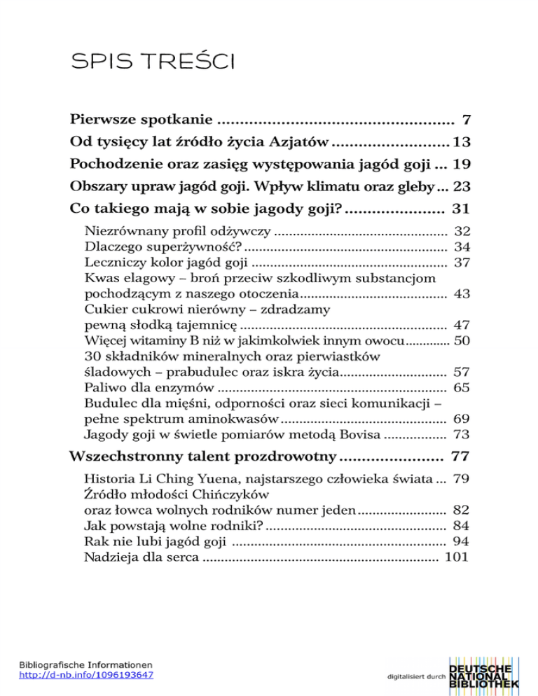 SPIS TREŚCI P ierw sze s p o tk a n ie ............................................................... 7 Od tysięcy lat źródło życia A zjatów ·························· 13 P ochodzenie oraz zasięg w ystępow ania jagód g o ji... 19 Obszary upraw jagód goji. Wpływ klimatu oraz gleby··. 23 Co tak iego mają w sobie jagody goji? ······················ 31 N iezrów nany profil odżyw czy.................................................. 32 Dlaczego superżyw nosc?........................................................... 34 Leczniczy kolor jagód g o ji......................................................... 37 Kwas elagowy broń przeciw szkodliwym substancjom p o c h o d z ą c y z naszego otoczenia........................................... 43 C ukier c u b w i nierówny - zdradzam y pew ną słodką taje m n ic ę ............................................................ 47 Więcej witammy B i w ] a á á o l w í e k к у ш owocu············· 50 30 składników m ineralnych oraz pierw iastków śladow ych —prabudulec oraz iskra życia··.······.···········.····.·· 5 / Paliwo dla enzym ów ................................................................... 65 B udulec dla m ięsni,odpom osci oraz sieci kom unikacji — pefoe spektrum am inokw asów ................................................ 69 Jagody goji w świetle pom iarów m etodą B ovisa................. 73 一 W szechstronny talent prozdrow otny....................... 77 H istoria Li Ching Yuena, najstarszego człowieKa ś w ia ta ... 79 Zrodło m łodości Chińczyków oraz fowca wolnych rodników 82 Ja k pow stają wolne ro d n ik i? ..................................................... 84 Rak nie lubi jagód goji …···…·····………···…·………··…··…···…… 94 Nadzieja dla s e rc a ..................................................................... 101 Bodziec do działania oraz ekw ipunek dla jednostek bojowych naszego układu odpornościow ego..................... Jagoda łagodząca stany zapalne oraz artretyzm .·····.········ Jagoda n ie z ^ M e w skazana dla d W sparcie w od ch u d zan iu ....................................................... Nowe Zycie dla w ątroby............................................................ Prom yk św iatła dla oczu.......................................................... O chrona skory od wew nątrz................................................... Jagoda szczęścia........................................................................ Czy jagody goji to skuteczny środek n a potencję? ······.····· 105 113 118 125 127 131 137 140 144 H istoria zw iązana z faiijącymi w łaściw ościam i jagód goji............................................................................. 151 O ptym alna dzienna porcja jagód goji ................... 161 Sm oothie goji Sb alili 1 inn e przepisy kulinarne z w ykorzystaniem jagód g o ji........................................ 1 63 Smoothie goji S h a lili................................................................ 164 Wyroby z jagód goji - od kaw y goji po likier goji··· 1 67 Jagody goji dla z w ie rz ą t.......................................................... 171 Opis rosliny, która obdarza nas jagodam i goji ······ 1 73 Sto im ion rośliny g o j i ..................................................... 1 7 7 Jagody goji z w łasn ego o g ro d u .................................... 181 Pielęgnacja fazew ów goji......................................................... 185 Zbiór i obróbka jagód g o ji..................................................... 1 8 6 K ilka m yśli na z a k o ń c z e n ie .......................................... 193 Ź ródła.................................................................................... 195 O a u to ra c h .......................................................................... 1 9 7 B ibliografia......................................................................... 1 9 9