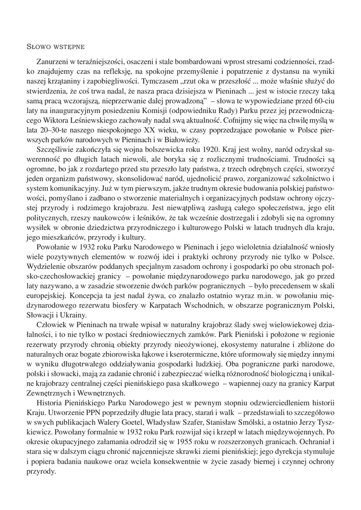 SŁOWO WSTE˛PNE Zanurzeni w teraźniejszości, osaczeni i stale bombardowani wprost stresami codzienności, rzadko znajdujemy czas na refleksje˛, na spokojne przemyślenie i popatrzenie z dystansu na wyniki naszej krza˛taniny i zapobiegliwości. Tymczasem „rzut oka w przeszłość ... może właśnie służyć do stwierdzenia, że coś trwa nadal, że nasza praca dzisiejsza w Pieninach ... jest w istocie rzeczy taka˛ sama˛ praca˛ wczorajsza˛, nieprzerwanie dalej prowadzona˛” – słowa te wypowiedziane przed 60-ciu laty na inauguracyjnym posiedzeniu Komisji (odpowiedniku Rady) Parku przez jej przewodnicza˛cego Wiktora Leśniewskiego zachowały nadal swa˛ aktualność. Cofnijmy sie˛ wie˛c na chwile˛ myśla˛ w lata 20–30-te naszego niespokojnego XX wieku, w czasy poprzedzaja˛ce powołanie w Polsce pierwszych parków narodowych w Pieninach i w Białowieży. Szcze˛śliwie zakończyła sie˛ wojna bolszewicka roku 1920. Kraj jest wolny, naród odzyskał suwerenność po długich latach niewoli, ale boryka sie˛ z rozlicznymi trudnościami. Trudności sa˛ ogromne, bo jak z rozdartego przed stu przeszło laty państwa, z trzech odre˛bnych cze˛ści, stworzyć jeden organizm państwowy, skonsolidować naród, ujednolicić prawo, zorganizować szkolnictwo i system komunikacyjny. Już w tym pierwszym, jakże trudnym okresie budowania polskiej państwowości, pomyślano i zadbano o stworzenie materialnych i organizacyjnych podstaw ochrony ojczystej przyrody i rodzimego krajobrazu. Jest niewa˛tpliwa˛ zasługa˛ całego społeczeństwa, jego elit politycznych, rzeszy naukowców i leśników, że tak wcześnie dostrzegali i zdobyli sie˛ na ogromny wysiłek w obronie dziedzictwa przyrodniczego i kulturowego Polski w latach trudnych dla kraju, jego mieszkańców, przyrody i kultury. Powołanie w 1932 roku Parku Narodowego w Pieninach i jego wieloletnia działalność wniosły wiele pozytywnych elementów w rozwój idei i praktyki ochrony przyrody nie tylko w Polsce. Wydzielenie obszarów poddanych specjalnym zasadom ochrony i gospodarki po obu stronach polsko-czechosłowackiej granicy – powołanie mie˛dzynarodowego parku narodowego, jak go przed laty nazywano, a w zasadzie stworzenie dwóch parków pogranicznych – było precedensem w skali europejskiej. Koncepcja ta jest nadal żywa, co znalazło ostatnio wyraz m.in. w powołaniu mie˛dzynarodowego rezerwatu biosfery w Karpatach Wschodnich, w obszarze pogranicznym Polski, Słowacji i Ukrainy. Człowiek w Pieninach na trwałe wpisał w naturalny krajobraz ślady swej wielowiekowej działalności, i to nie tylko w postaci średniowiecznych zamków. Park Pieniński i położone w regionie rezerwaty przyrody chronia˛ obiekty przyrody nieożywionej, ekosystemy naturalne i zbliżone do naturalnych oraz bogate zbiorowiska ła˛kowe i kserotermiczne, które uformowały sie˛ mie˛dzy innymi w wyniku długotrwałego oddziaływania gospodarki ludzkiej. Oba pograniczne parki narodowe, polski i słowacki, maja˛ za zadanie chronić i zabezpieczać wielka˛ różnorodność biologiczna˛ i unikalne krajobrazy centralnej cze˛ści pienińskiego pasa skałkowego – wapiennej oazy na granicy Karpat Zewne˛trznych i Wewne˛trznych. Historia Pienińskiego Parku Narodowego jest w pewnym stopniu odzwierciedleniem historii Kraju. Utworzenie PPN poprzedziły długie lata pracy, starań i walk – przedstawiali to szczegółowo w swych publikacjach Walery Goetel, Władysław Szafer, Stanisław Smólski, a ostatnio Jerzy Tyszkiewicz. Powołany formalnie w 1932 roku Park rozwijał sie˛ i krzepł w latach mie˛dzywojennych. Po okresie okupacyjnego załamania odrodził sie˛ w 1955 roku w rozszerzonych granicach. Ochraniał i stara sie˛ w dalszym cia˛gu chronić najcenniejsze skrawki ziemi pienińskiej; jego dyrekcja stymuluje i popiera badania naukowe oraz wciela konsekwentnie w życie zasady biernej i czynnej ochrony przyrody. 4 K. Zarzycki – Słowo wste˛pne Naste˛pny okres w historii PPN wyznacza rok 1964, kiedy to zatwierdzono koncepcje˛ budowy Zespołu Zbiorników Wodnych Czorsztyn-Niedzica i Sromowce Wyżne. Znaczenie tej inwestycji dla gospodarki wodnej kraju i bezpieczeństwa regionu omówił ostatnio Jerzy Łaniewski (1992). Jednakże inwestycje wodne w dolinie Dunajca zagroziły walorom przyrodniczym Parku i kulturowym całego regionu pienińskiego. Wywołały burzliwe dyskusje i społeczne protesty. Uszczuplona została bowiem powierzchnia PPN, asfaltowa szosa Krośnica – Sromowce Ka˛ty odcie˛ła zachodnia˛ cze˛ść Parku poddanej silnej antropopresji. Całkowitemu zniszczeniu uległy cenne lasy łe˛gowe w dolinie Dunajca, naruszone zostały drzewostany świerkowe i jodłowe w sa˛siedztwie przyszłych zbiorników. Na znacznych obszarach zostały zaburzone dotychczasowe warunki środowiskowe u granic Parku. Jednocześnie wzrósł nacisk urbanizacyjny na Park, zwie˛kszyło sie˛ zanieczyszczenie ekosystemów wodnych i la˛dowych, gwałtownym przemianom ulegaja˛ zbiorowiska ła˛kowe, torfowiskowe i leśne. Z okazji 60-lecia powołania Słowackiego Rezerwatu Przyrodniczego w Pieninach i Parku Narodowego w Pieninach, staraniem Dyrekcji i Rady Naukowej PPN zorganizowano Sesje˛ pt. „Pograniczne Parki Narodowe – problemy ochrony i rozwoju” (29–30.06.1992 r. Szczawnica, 1–2.07.1992 r. Czerwony Klasztor). Celem naszej Sesji było przedstawienie aktualnego stanu PPN oraz rozpatrzenie w gronie kompetentnych i zainteresowanych osób, reprezentuja˛cych władze centralne, wojewódzkie i gminne, a także przedstawicieli miejscowej społeczności, sa˛siadów PPN, wiele kwestii o podstawowym znaczeniu dla regionu: • czy Pieniński Park Narodowy spełnił i czy może nadal spełniać zadania dla których został • • • • powołany? czy skutecznie chroni zasoby przyrody i kultury, czy właściwie propaguje idee ochrony przyrody i środowiska przyrodniczego? jaki jest rzeczywisty stan – „kondycja” Parku z koń