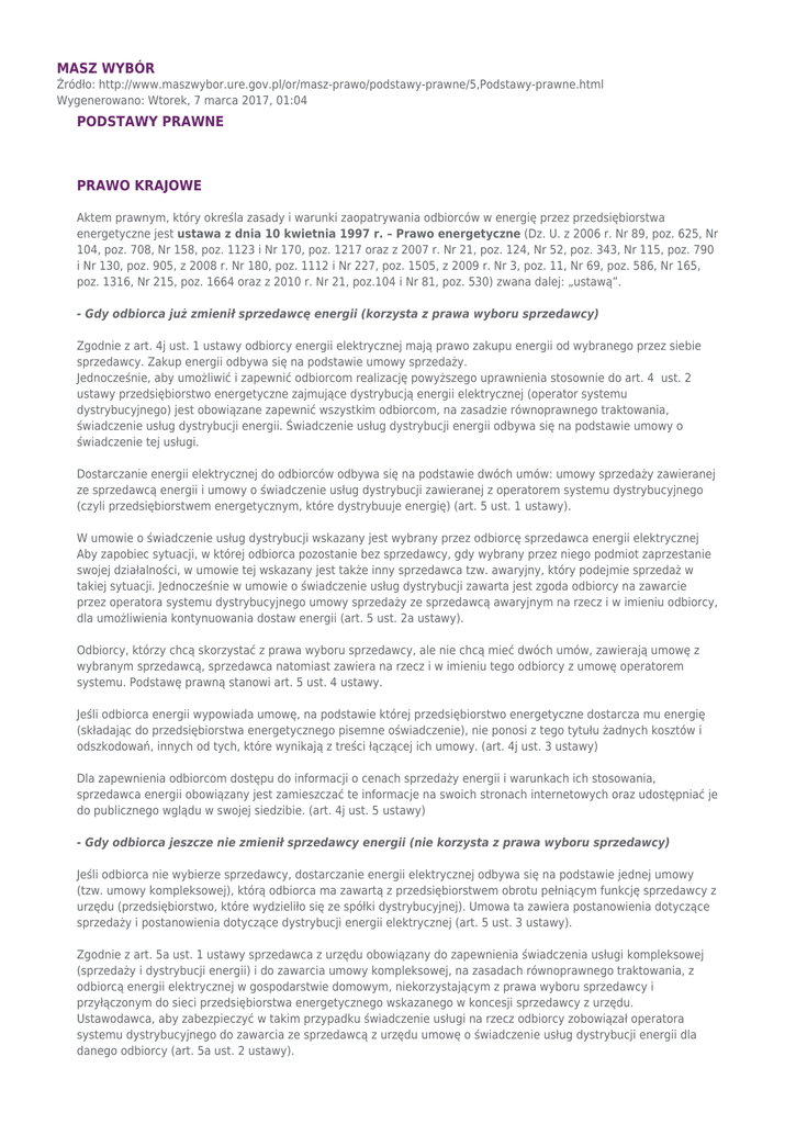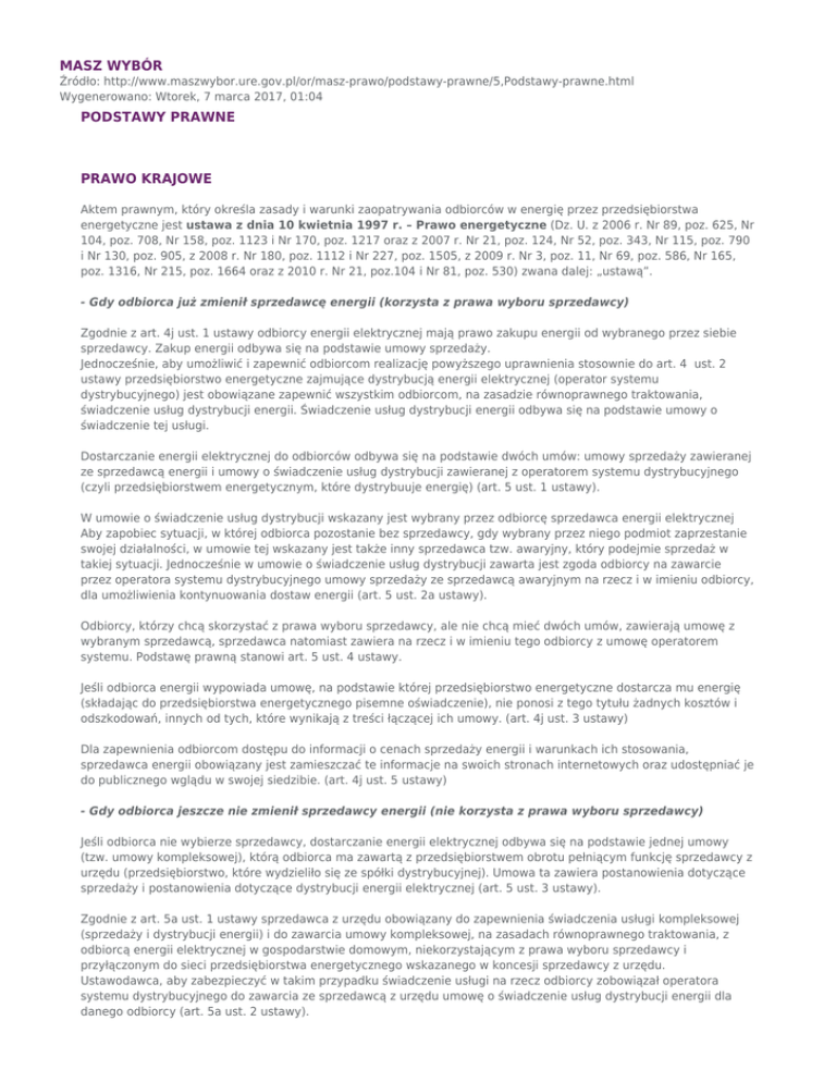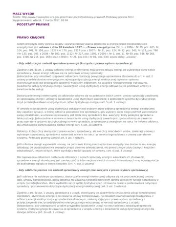 MASZ WYBÓR Źródło: http://www.maszwybor.ure.gov.pl/or/masz-prawo/podstawy-prawne/5,Podstawy-prawne.html Wygenerowano: Wtorek, 7 marca 2017, 01:04 PODSTAWY PRAWNE PRAWO KRAJOWE Aktem prawnym, który określa zasady i warunki zaopatrywania odbiorców w energię przez przedsiębiorstwa energetyczne jest ustawa z dnia 10 kwietnia 1997 r. – Prawo energetyczne (Dz. U. z 2006 r. Nr 89, poz. 625, Nr 104, poz. 708, Nr 158, poz. 1123 i Nr 170, poz. 1217 oraz z 2007 r. Nr 21, poz. 124, Nr 52, poz. 343, Nr 115, poz. 790 i Nr 130, poz. 905, z 2008 r. Nr 180, poz. 1112 i Nr 227, poz. 1505, z 2009 r. Nr 3, poz. 11, Nr 69, poz. 586, Nr 165, poz. 1316, Nr 215, poz. 1664 oraz z 2010 r. Nr 21, poz.104 i Nr 81, poz. 530) zwana dalej: „ustawą”. - Gdy odbiorca już zmienił sprzedawcę energii (korzysta z prawa wyboru sprzedawcy) Zgodnie z art. 4j ust. 1 ustawy odbiorcy energii elektrycznej mają prawo zakupu energii od wybranego przez siebie sprzedawcy. Zakup energii odbywa się na podstawie umowy sprzedaży. Jednocześnie, aby umożliwić i zapewnić odbiorcom realizację powyższego uprawnienia stosownie do art. 4 ust. 2 ustawy przedsiębiorstwo energetyczne zajmujące dystrybucją energii elektrycznej (operator systemu dystrybucyjnego) jest obowiązane zapewnić wszystkim odbiorcom, na zasadzie równoprawnego traktowania, świadczenie usług dystrybucji energii. Świadczenie usług dystrybucji energii odbywa się na podstawie umowy o świadczenie tej usługi. Dostarczanie energii elektrycznej do odbiorców odbywa się na podstawie dwóch umów: umowy sprzedaży zawieranej ze sprzedawcą energii i umowy o świadczenie usług dystrybucji zawieranej z operatorem systemu dystrybucyjnego (czyli przedsiębiorstwem energetycznym, które dystrybuuje energię) (art. 5 ust. 1 ustawy). W umowie o świadczenie usług dystrybucji wskazany jest wybrany przez odbiorcę sprzedawca energii elektrycznej Aby zapobiec sytuacji, w której odbiorca pozostanie bez sprzedawcy, gdy wybrany przez niego podmiot zaprzestanie swojej działalności, w umowie tej wskazany jest także inny sprzedawca tzw. awaryjny, który podejmie sprzedaż w takiej sytuacji. Jednocześnie w umowie o świadczenie usług dystrybucji zawarta jest zgoda odbiorcy na zawarcie przez operatora systemu dystrybucyjnego umowy sprzedaży ze sprzedawcą awaryjnym na rzecz i w imieniu odbiorcy, dla umożliwienia kontynuowania dostaw energii (art. 5 ust. 2a ustawy). Odbiorcy, którzy chcą skorzystać z prawa wyboru sprzedawcy, ale nie chcą mieć dwóch umów, zawierają umowę z wybranym sprzedawcą, sprzedawca natomiast zawiera na rzecz i w imieniu tego odbiorcy z umowę operatorem systemu. Podstawę prawną stanowi art. 5 ust. 4 ustawy. Jeśli odbiorca energii wypowiada umowę, na podstawie której przedsiębiorstwo energetyczne dostarcza mu energię (składając do przedsiębiorstwa energetycznego pisemne oświadczenie), nie ponosi z tego tytułu żadnych kosztów i odszkodowań, innych od tych, które wynikają z treści łączącej ich umowy. (art. 4j ust. 3 ustawy) Dla zapewnienia odbiorcom dostępu do informacji o cenach sprzedaży energii i warunkach ich stosowania, sprzedawca energii obowiązany jest zamieszczać te informacje na swoich stronach internetowych oraz udostępniać je do publicznego wglądu w swojej siedzibie. (art. 4j ust. 5 ustawy) - Gdy odbiorca jeszcze nie zmienił sprzedawcy energii (nie korzysta z prawa wyboru sprzedawcy) Jeśli odbiorca nie wybierze sprzedawcy, dostarczanie energii elektrycznej odbywa się na podstawie jednej umowy (tzw. umowy kompleksowej), którą odbiorca ma zawartą z przedsiębiorstwem obrotu pełniącym funkcję sprzedawcy z urzędu (przedsiębiorstwo, które wydzieliło się ze spółki dystrybucyjnej). Umowa ta zawiera postanowienia dotyczące sprzedaży i postanowienia dotyczące dystrybucji energii elektrycznej (art. 5 ust. 3 ustawy). Zgodnie z art. 5a ust. 1 ustawy sprzedawca z urzędu obowiązany do zapewnienia świadczenia usługi kompleksowej (sprzedaży i dystrybucji energii) i do zawarcia umowy kompleksowej, na zasadach równoprawnego traktowania, z odbiorcą energii elektrycznej w gospodarstwie domowym, niekorzystającym z prawa wyboru sprzedawcy i przyłączonym do sieci przedsiębiorstwa energetycznego wskazanego w koncesji sprzedawcy z urzędu. Ustawodawca, aby zabezpieczyć w takim przypadku świadczenie usługi na rzecz odbiorcy zobowiązał operatora systemu dystrybucyjnego do zawarcia ze sprzedawcą z urzędu umowę o świadczenie usług dystrybucji energii dla danego odbiorcy (art. 5a ust. 2 ustawy). - Odmowa zawarcia umowy W przypadku odmowy zawarcia m. in. umowy o świadczenie usług dystrybucji energii, a w przypadku odbiorców w gospodarstwie domowym, niekorzystających z prawa wyboru sprzedawcy – umowy sprzedaży lub umowy kompleksowej oraz w sytuacji nieuzasadnionego wstrzymania dostarczania energii elektrycznej rozstrzyga Prezes Urzędu Regulacji Energetyki. Postępowanie administracyjne o rozstrzygnięcie takiego sporu może być wszczęte jedynie na wniosek strony (odbiorcy) (art. 8 ust. 1 ustawy). - Operator systemu dystrybucyjnego (OSD) Operator systemu dystrybucyjnego to przedsiębiorstwo energetyczne zajmujące się transportem energii sieciami dystrybucyjnymi w celu dostarczenia ich odbiorcom. Jest ono odpowiedzialne za ruch sieciowy w systemie elektroenergetycznym, bieżące i długookresowe bezpieczeństwo funkcjonowania tego systemu, eksploatację, konserwację, remonty oraz niezbędną rozbudowę sieci dystrybucyjnej (art. 3 pkt 25 ustawy). Jeśli odbiorca spełnia warunki techniczne przyłączenia do sieci dystrybucyjnej operator systemu nie może odmówić świadczenia tych usług. Operator systemu działa zgodnie z Instrukcją Ruchu i Eksploatacji Sieci Dystrybucyjnej, która określa szczegółowe warunki korzystania z sieci dystrybucyjnych przez ich użytkowników oraz warunki i sposób prowadzenia ruchu, eksploatacji i planowania rozwoju sieci. Treść Instru