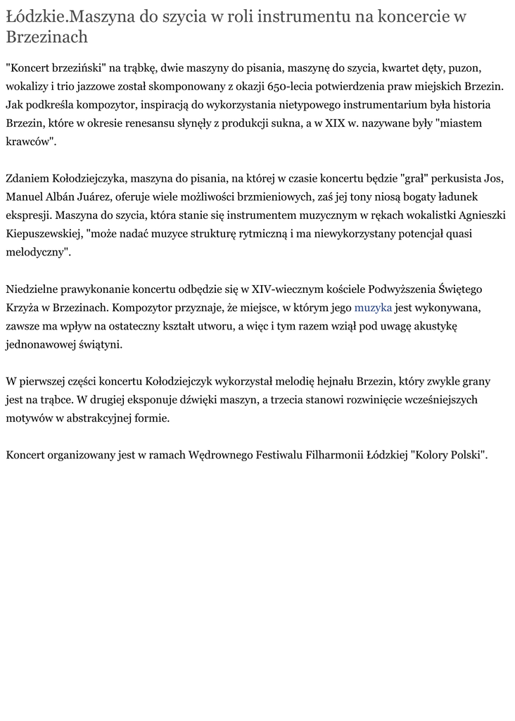 Łódzkie.Maszyna do szycia w roli instrumentu na koncercie w Brzezinach "Koncert brzeziński" na trąbkę, dwie maszyny do pisania, maszynę do szycia, kwartet dęty, puzon, wokalizy i trio jazzowe został skomponowany z okazji 650-lecia potwierdzenia praw miejskich Brzezin. Jak podkreśla kompozytor, inspiracją do wykorzystania nietypowego instrumentarium była historia Brzezin, które w okresie renesansu słynęły z produkcji sukna, a w XIX w. nazywane były "miastem krawców". Zdaniem Kołodziejczyka, maszyna do pisania, na której w czasie koncertu będzie "grał" perkusista Jos, Manuel Albán Juárez, oferuje wiele możliwości brzmieniowych, zaś jej tony niosą bogaty ładunek ekspresji. Maszyna do szycia, która stanie się instrumentem muzycznym w rękach wokalistki Agnieszki Kiepuszewskiej, "może nadać muzyce strukturę rytmiczną i ma niewykorzystany potencjał quasi melodyczny". Niedzielne prawykonanie koncertu odbędzie się w XIV-wiecznym kościele Podwyższenia Świętego Krzyża w Brzezinach. Kompozytor przyznaje, że miejsce, w którym jego muzyka jest wykonywana, zawsze ma wpływ na ostateczny kształt utworu, a więc i tym razem wziął pod uwagę akustykę jednonawowej świątyni. W pierwszej części koncertu Kołodziejczyk wykorzystał melodię hejnału Brzezin, który zwykle grany jest na trąbce. W drugiej eksponuje dźwięki maszyn, a trzecia stanowi rozwinięcie wcześniejszych motywów w abstrakcyjnej formie. Koncert organizowany jest w ramach Wędrownego Festiwalu Filharmonii Łódzkiej "Kolory Polski".