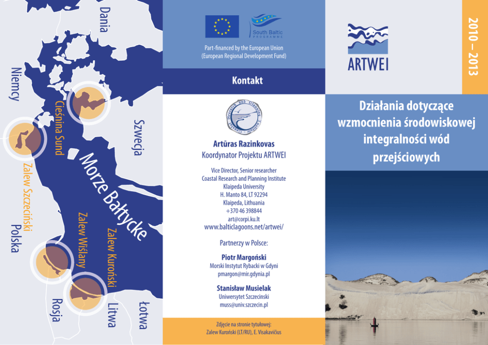 • Kontakt Artūras Razinkovas Koordynator Projektu ARTWEI Vice Director, Senior researcher Coastal Research and Planning Institute Klaipeda University H. Manto 84, LT 92294 Klaipeda, Lithuania +370 46 398844 [email protected] www.balticlagoons.net/artwei/ Partnerzy w Polsce: Piotr Margoński Morski Instytut Rybacki w Gdyni [email protected] Stanisław Musielak Uniwersytet Szczecinski [email protected] Zdjęcie na stronie tytułowej: Zalew Kuroński (LT/RU), E. Visakavičius 2010 – 2013 Part-financed by the European Union (European Regional Development Fund) Działania dotyczące wzmocnienia środowiskowej integralności wód przejściowych ARTWEI - Action for the Reinforcement of the Transitional Waters’ Environmental Integrity Wstęp. Cel projektu Wody przejściowe łączące zlewnie rzek z obszarami morskimi mają szczególne znaczenie dla ekologicznego stanu Morza Bałtyckiego. Europejska Polityka Wodna oraz Ramowa Dyrektywa Wodna Unii Europejskiej określają wytyczne dla zarządzania zlewniowego, natomiast obszary morskie zarządzane są w ramach Planowania Przestrzennego Obszarów Morskich. Dla wprowadzenia w życie powyższych zasad oraz zapewnienie odpowiedniej integralności ekologicznej wód przejściowych, konieczna jest transgraniczna współpraca lokalnych i regionalnych organizacji i instytucji, obywateli oraz polityków. ARTWEI odnosi się do czterech transgranicznych regionów na obszarze Bałtyku Południowego: • • • • Zalewu Kurońskiego (LT/RU), Zalewu Wiślanego (RU/PL), Zalewu Szczecińskiego (PL/DE), Cieśniny Oresund (DK/SE). Projekt ARTWEI jest współfinansowany przez Program Południowy Bałtyk 2007–2013. Partnerem wiodącym w projekcie jest Uniwersytet w Kłajpedzie, natomiast pozostali uczestnicy to pięciu partnerów z Litwy, Niemiec, Polski oraz Szwecji. Partnerzy projektu • ARTWEI będzie opierał się na dotychczasowym doświadczeniu Unii Europejskiej oraz doświadczeniu międzynarodowych sieci współpracy w obrębie Morza Bałtyckiego. ARTWEI wypracuje metody efektywnego zarządzania wodami przejściowymi na poziomie lokalnym i regionalnym, z dwóch perspektyw: 1. współpracy transgranicznej; 2. środowiskowej integralności zlewni rzek – wód przejściowych – otwartego morza. Czas trwania projektu: Marzec 2010 - Luty 2013 Całkowity budżet: 1,4 milliona Euro • • • • • • Partner Wiodący - Coastal Research and Planning Institute, Klaipeda University (Litwa) Partner 1 - EUCC Baltic Office (Litwa) Partner 2 - EUCC - Coastal Union Germany (Niemcy) Partner 3 - Morski Instytut Rybacki w Gdyni (Polska) Partner 4 - Uniwersytet Szczeciński (Polska) Partner 5 - World Maritime University (Sweden) Współpraca ze strony rosyjskiej - Atlantic Branch of P.P. Shirshov Institute of Oceanology (Kaliningrad) Foto: Zalew Wiślany (RU/PL), P. Margoński W ramach projektu zostaną wypracowane i zatwierdzone w formie Kodeksu Postępowania i Dobrych Praktyk konkretne wnioski i rekomendacje pozwalające na trwałe wzmocnienie integralności środowiskowej wód przejściowych. W celu ułatwienia interaktywnej wymiany wiedzy i informacji pomiędzy oraz wewnątrz Grup Interesariuszy poszczególnych akwenów transgranicznych, stworzona zostanie internetowa, wielojęzyczna platforma stosująca WebGIS oraz inne nowoczesne narzędzia informacji i komunikacji. Projekt będzie korzystał z działań edukacyjnych dot. środowiska, w formie transgranicznego dialogu, tematycznych konkursów fotograficznych oraz systemu informacji publicznej. Foto: Zalew Kuroński (LT/RU), E. Visakavičius Foto: Cieśnina Sund (DK/SE), J. Ericsson