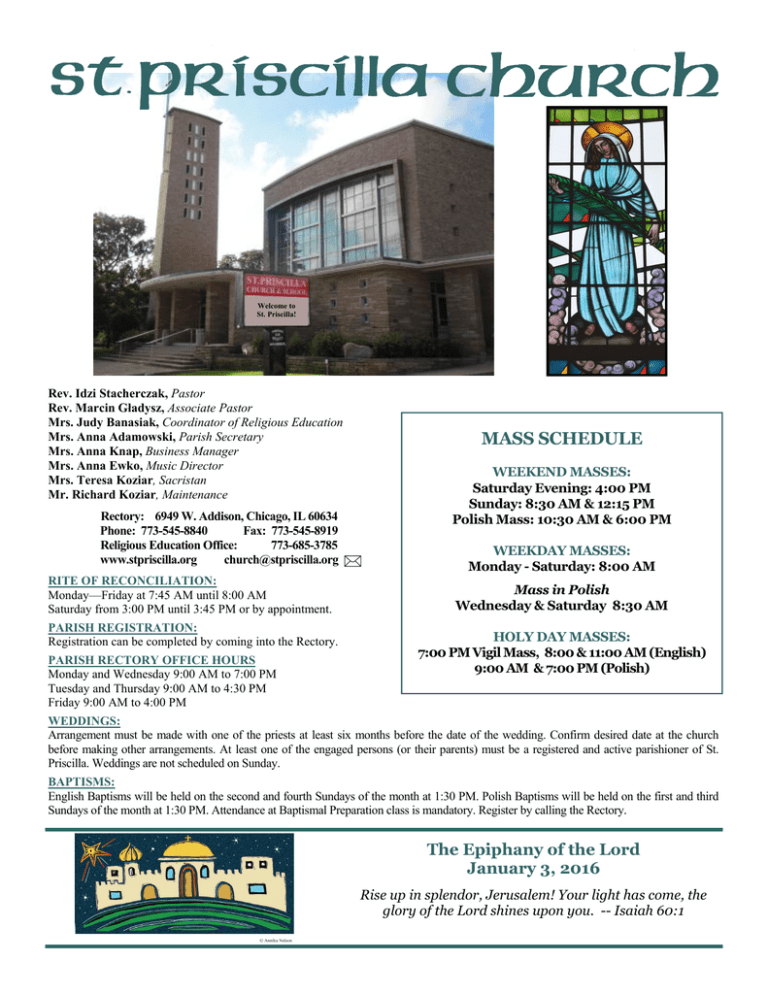 Welcome to St. Priscilla! Rev. Idzi Stacherczak, Pastor Rev. Marcin Gładysz, Associate Pastor Mrs. Judy Banasiak, Coordinator of Religious Education Mrs. Anna Adamowski, Parish Secretary Mrs. Anna Knap, Business Manager Mrs. Anna Ewko, Music Director Mrs. Teresa Koziar, Sacristan Mr. Richard Koziar, Maintenance Rectory: 6949 W. Addison, Chicago, IL 60634 Phone: 773-545-8840 Fax: 773-545-8919 Religious Education Office: 773-685-3785 www.stpriscilla.org [email protected] RITE OF RECONCILIATION: Monday—Friday at 7:45 AM until 8:00 AM Saturday from 3:00 PM until 3:45 PM or by appointment. PARISH REGISTRATION: Registration can be completed by coming into the Rectory. PARISH RECTORY OFFICE HOURS Monday and Wednesday 9:00 AM to 7:00 PM Tuesday and Thursday 9:00 AM to 4:30 PM Friday 9:00 AM to 4:00 PM MASS SCHEDULE WEEKEND MASSES: Saturday Evening: 4:00 PM Sunday: 8:30 AM & 12:15 PM Polish Mass: 10:30 AM & 6:00 PM WEEKDAY MASSES: Monday - Saturday: 8:00 AM Mass in Polish Wednesday & Saturday 8:30 AM HOLY DAY MASSES: 7:00 PM Vigil Mass, 8:00 & 11:00 AM (English) 9:00 AM & 7:00 PM (Polish) WEDDINGS: Arrangement must be made with one of the priests at least six months before the date of the wedding. Confirm desired date at the church before making other arrangements. At least one of the engaged persons (or their parents) must be a registered and active parishioner of St. Priscilla. Weddings are not scheduled on Sunday. BAPTISMS: English Baptisms will be held on the second and fourth Sundays of the month at 1:30 PM. Polish Baptisms will be held on the first and third Sundays of the month at 1:30 PM. Attendance at Baptismal Preparation class is mandatory. Register by calling the Rectory. The Epiphany of the Lord January 3, 2016 Rise up in splendor, Jerusalem! Your light has come, the glory of the Lord shines upon you. -- Isaiah 60:1 PageTwoJanuary3,2016 THE EPIPHANY OF THE LORD (3) 8:30 — +Aurea Saez - 3rd Death Ann. (Daughter & Family) 10:30— O radość w wieczności dla: +Dominik Kalinowski (Żona i dzieci) +Franciszek Szymański (Rodzina) +Józef Łepkowski (Rodzina) +Czesława Jędryczka (Córka z Rodziną) 12:15— +Pietro Massanisso (Family) 6:00 — Za parafian św. Pryscylli / St. Priscilla Parishioners #4 MONDAY (4) St. Elizabeth Ann Seton, Religious 8:00 — Blessings for Ackermann Family (Family) +Zbigniew Muszak (Daughter & Family) TUESDAY (5) St. John Neumann, Bishop 8:00 — +Anna Zagajewska - 10th Death Anniversary (Daughter) WEDNESDAY (6) Christmas Weekday 8:00 — +Otto Ackermann (Daughter) ++Mary & Frank Schultz (Denise DuPlantis) 8:30 — Za parafian św. Pryscylli / St. Priscilla Parishioners #5 William Balog—Joe Bargi—Lorraine Belokon—Evelyn Cademartrie—Maria Ceglarek—Jan Drożdż—Jean Hanisko—Jennifer Hebda—Dorothy Heck—Marian Henaghan—Andrew Jennings—Carrie Kacen—Marie Kane—Thaddeus Kapica—Janet Kaplan—Kazimiera Karwowska— Zuzanna Karwowska-Rafało—Maureen Kearney— Chester Kmiec—Helen Kumiega—Maria Lech—Peter Leyden—Mary Lund—Mary Lynch—Michael Manczko—Barbara McDonald—Mike Muka—Vince Munday— Antoni Nierzejewski—Carol Niewinski—Frank Niewinski—John Nowik—Stefan Nowik—Stevie V. Nowik—Anna Oracz—Henry Orry—Joseph Rath— Marge Reavis—Alice Reckmann—Augusto Sandoval—Norbert Schultz—Melvin Spejcher— Helen Sterling—Melvin Spejcher—Gina Swensen— Helen Toporek—Roger Vlasos—Jola Wolfe—Carla and Adam—Virginia Zyburt THURSDAY (7) Christmas Weekday 8:00 — +Trinidad Reyes (Reyes Family) FRIDAY (8) Christmas Weekday 8:00 — +Lourdes Reyes (Reyes Family) +Florinda Paulina Osseliere (Jenkins Family) +Raimundo Ferreira (Jenkins Family) +Wasington Luis Ferreira (Jenkins Family) +Jose Raimundo Ferreira (Jenkins Family) +Ana Jenkins (Jenkins Family) SATURDAY (9) Christmas Weekday 8:00 — St. Priscilla Parishioners / Za parafian św. Pryscylli #6 8:30 — Za parafian św. Pryscylli / St. Priscilla Parishioners #7 4:00 — +Donna Nabor (Sulak Family) +Catherine Kapka (Mr. & Mrs. R. Drzewiecki) +Lorraine DuPlaintis (Denise) +Annunciato Greco (Philomena) +Bernice Hujar (Hujar Family) +Patrick White (Una-Wife) +Aidan Biggins - Birthday Remembrance (Family) If you would like to have a name added or removed from our Parish “Pray For…” sick list, please call the rectory at 773-545-8840 ext. 221. Thank you! Youth meetings are held every Friday at 6:30 pm. Meetings are now held below the church. Youth of all ages are welcome. Bring a joyful heart and the Holy Bible! Spotkania Młodzieży odbywają się w każdy piątek o godz. 6:30 wieczorem pod kościołem. Młodzieży w każdym wieku są mile widziane. Przynieś radosne serce i Pismo Święte! Please remember that if you would like to request an intention for a weekend Mass, you must request it AT LEAST ONE WEEK BEFORE the scheduled date. Prosimy pamiętać, aby zamówić intencję na Mszę św. w niedzielę, należy przyjść do kancelarii parafialnej przynajmniej tydzień wcześniej. W sytuacji nadzwyczajnej, należy bezpośrednio załatwiać intencję z Księdzem w zakrystii przed Mszą św. The Epiphany of the Lord PageThree PageFourJanuary3,2016 We would like to sincerely thank the wonderful group of parishioners who came out to help us decorate for the Christmas Season. Almost 20 parishioners dedicated their time and talents to decorate the inside of our Church. We are grateful to these parishioners and we hope everyone enjoys the lights, flowers and banners. God Bless you all! Please enjoy the pictures of our volunteers working hard. Names of those who volunteered are posted below. We apologize for any misspellings your name or if your name is missing. Rev. Marcin Gładysz - Anna Adamowski Megan Adamowski - Teresa Koziar Ryszard Koziar - Anna Ewko - Maxine Poore - Robert Poore - Angelina Jager Anna Harmata - Karol Harmata - Klara Harmata - Roman Harmata - Theresa Harmata - Ewa Wawiórko - Antoni Niemczyk - Mieczysław Ziobro - Kazimierz