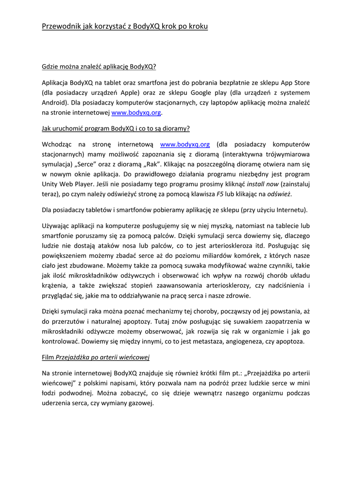 Przewodnik jak korzystać z BodyXQ krok po kroku Gdzie można znaleźć aplikację BodyXQ? Aplikacja BodyXQ na tablet oraz smartfona jest do pobrania bezpłatnie ze sklepu App Store (dla posiadaczy urządzeń Apple) oraz ze sklepu Google play (dla urządzeń z systemem Android). Dla posiadaczy komputerów stacjonarnych, czy laptopów aplikację można znaleźć na stronie internetowej www.bodyxq.org. Jak uruchomić program BodyXQ i co to są dioramy? Wchodząc na stronę internetową www.bodyxq.org (dla posiadaczy komputerów stacjonarnych) mamy możliwość zapoznania się z dioramą (interaktywna trójwymiarowa symulacja) „Serce” oraz z dioramą „Rak”. Klikając na poszczególną dioramę otwiera nam się w nowym oknie aplikacja. Do prawidłowego działania programu niezbędny jest program Unity Web Player. Jeśli nie posiadamy tego programu prosimy kliknąć install now (zainstaluj teraz), po czym należy odświeżyć stronę za pomocą klawisza F5 lub klikając na odśwież. Dla posiadaczy tabletów i smartfonów pobieramy aplikację ze sklepu (przy użyciu Internetu). Używając aplikacji na komputerze posługujemy się w niej myszką, natomiast na tablecie lub smartfonie poruszamy się za pomocą palców. Dzięki symulacji serca dowiemy się, dlaczego ludzie nie dostają ataków nosa lub palców, co to jest arterioskleroza itd. Posługując się powiększeniem możemy zbadać serce aż do poziomu miliardów komórek, z których nasze ciało jest zbudowane. Możemy także za pomocą suwaka modyfikować ważne czynniki, takie jak ilość mikroskładników odżywczych i obserwować ich wpływ na rozwój chorób układu krążenia, a także zwiększać stopień zaawansowania arteriosklerozy, czy nadciśnienia i przyglądać się, jakie ma to oddziaływanie na pracę serca i nasze zdrowie. Dzięki symulacji raka można poznać mechanizmy tej choroby, począwszy od jej powstania, aż do przerzutów i naturalnej apoptozy. Tutaj znów posługując się suwakiem zaopatrzenia w mikroskładniki odżywcze możemy obserwować, jak rozwija się rak w organizmie i jak go kontrolować. Dowiemy się między innymi, co to jest metastaza, angiogeneza, czy apoptoza. Film Przejażdżka po arterii wieńcowej Na stronie internetowej BodyXQ znajduje się również krótki film pt.: „Przejażdżka po arterii wieńcowej” z polskimi napisami, który pozwala nam na podróż przez ludzkie serce w mini łodzi podwodnej. Można zobaczyć, co się dzieje wewnątrz naszego organizmu podczas uderzenia serca, czy wymiany gazowej. Przewodnik jak korzystać z BodyXQ krok po kroku Konkursy BodyXQ Można również wziąć udział w naszych konkursach, m.in. w Konkursie na Globalny Esej Szkolny lub uczestniczyć w Szkolnym Projekcie Ogrodniczym – więcej informacji na naszej stronie www.bodyxq.org W razie dodatkowych pytań można skorzystać z mapy na dole strony, by skontaktować się z Lokalnym Ambasadorem Zdrowia.