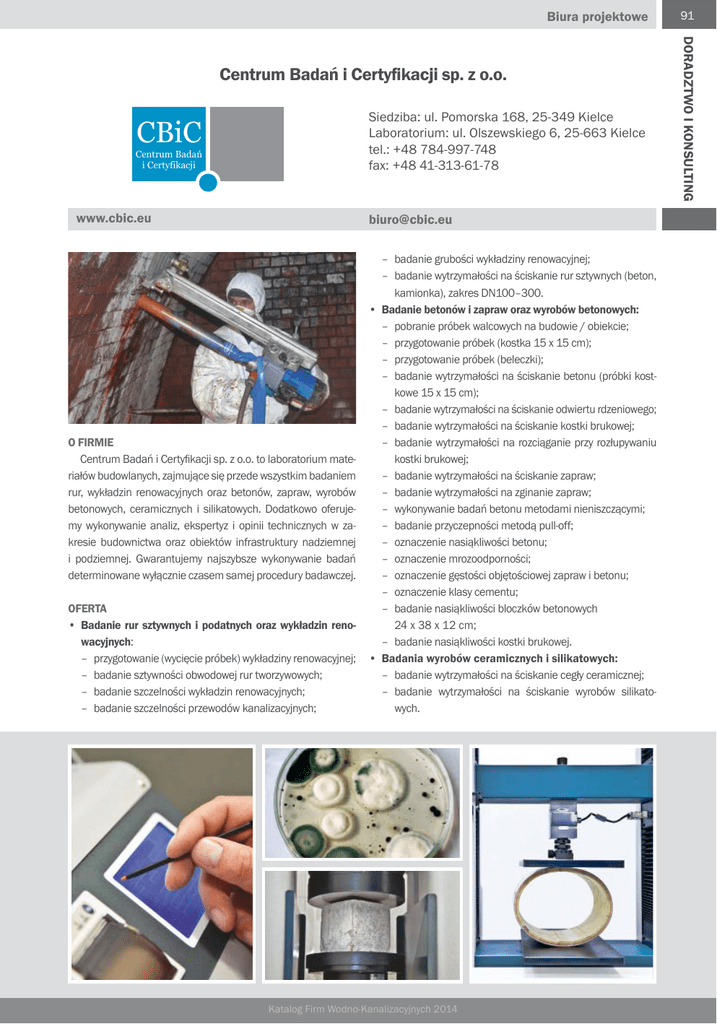 Biura projektowe Siedziba: ul. Pomorska 168, 25-349 Kielce Laboratorium: ul. Olszewskiego 6, 25-663 Kielce tel.: +48 784-997-748 fax: +48 41-313-61-78 CBiC &HQWUXP%DGDĔ i Certyfikacji www.cbic.eu [email protected] O FIRMIE Centrum Badań i Certyfikacji sp. z o.o. to laboratorium materiałów budowlanych, zajmujące się przede wszystkim badaniem rur, wykładzin renowacyjnych oraz betonów, zapraw, wyrobów betonowych, ceramicznych i silikatowych. Dodatkowo oferujemy wykonywanie analiz, ekspertyz i opinii technicznych w zakresie budownictwa oraz obiektów infrastruktury nadziemnej i podziemnej. Gwarantujemy najszybsze wykonywanie badań determinowane wyłącznie czasem samej procedury badawczej. OFERTA • Badanie rur sztywnych i podatnych oraz wykładzin renowacyjnych: – przygotowanie (wycięcie próbek) wykładziny renowacyjnej; – badanie sztywności obwodowej rur tworzywowych; – badanie szczelności wykładzin renowacyjnych; – badanie szczelności przewodów kanalizacyjnych; – badanie grubości wykładziny renowacyjnej; – badanie wytrzymałości na ściskanie rur sztywnych (beton, kamionka), zakres DN100–300. • Badanie betonów i zapraw oraz wyrobów betonowych: – pobranie próbek walcowych na budowie / obiekcie; – przygotowanie próbek (kostka 15 x 15 cm); – przygotowanie próbek (beleczki); – badanie wytrzymałości na ściskanie betonu (próbki kostkowe 15 x 15 cm); – badanie wytrzymałości na ściskanie odwiertu rdzeniowego; – badanie wytrzymałości na ściskanie kostki brukowej; – badanie wytrzymałości na rozciąganie przy rozłupywaniu kostki brukowej; – badanie wytrzymałości na ściskanie zapraw; – badanie wytrzymałości na zginanie zapraw; – wykonywanie badań betonu metodami nieniszczącymi; – badanie przyczepności metodą pull-off; – oznaczenie nasiąkliwości betonu; – oznaczenie mrozoodporności; – oznaczenie gęstości objętościowej zapraw i betonu; – oznaczenie klasy cementu; – badanie nasiąkliwości bloczków betonowych 24 x 38 x 12 cm; – badanie nasiąkliwości kostki brukowej. • Badania wyrobów ceramicznych i silikatowych: – badanie wytrzymałości na ściskanie cegły ceramicznej; – badanie wytrzymałości na ściskanie wyrobów silikatowych. Katalog Firm Wodno-Kanalizacyjnych 2014 DORADZTWO I KONSULTING Centrum Badań i Certyfikacji sp. z o.o. 91