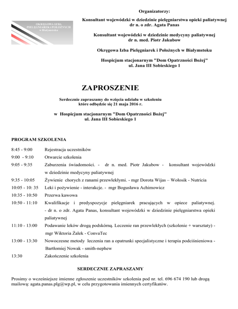 Organizatorzy: Konsultant wojewódzki w dziedzinie pielęgniarstwa opieki paliatywnej dr n. o zdr. Agata Panas Konsultant wojewódzki w dziedzinie medycyny paliatywnej dr n. med. Piotr Jakubow Okręgowa Izba Pielęgniarek i Położnych w Białymstoku Hospicjum stacjonarnym "Dom Opatrzności Bożej" ul. Jana III Sobieskiego 1 ZAPROSZENIE Serdecznie zapraszamy do wzięcia udziału w szkoleniu które odbędzie się 21 maja 2016 r. w Hospicjum stacjonarnym "Dom Opatrzności Bożej" ul. Jana III Sobieskiego 1 PROGRAM SZKOLENIA 8:45 - 9:00 Rejestracja uczestników 9:00 - 9:10 Otwarcie szkolenia 9:05 - 9:35 Zaburzenia świadomości. - dr n. med. Piotr Jakubow - konsultant wojewódzki w dziedzinie medycyny paliatywnej 9:35 - 10:05 Żywienie chorych z ranami przewlekłymi. - mgr Dorota Wijas – Wołosik - Nutricia 10:05 - 10: 35 Leki i pożywienie - interakcje. - mgr Bogusława Achimowicz 10:35 - 10:50 Przerwa kawowa 10:50 - 11:10 Kwalifikacje i predyspozycje pielęgniarek pracujących w opiece paliatywnej. - dr n. o zdr. Agata Panas, konsultant wojewódzki w dziedzinie pielęgniarstwa opieki paliatywnej 11:10 - 13:00 Podawanie leków drogą podskórną. Leczenie ran przewlekłych (szkolenie + warsztaty) mgr Wiktoria Żalek - ConvaTec 13:00 - 13:30 Nowoczesne metody leczenia ran a opatrunki specjalistyczne i terapia podciśnieniowa Bartłomiej Nowak - smith-nephew 13:30 Zakończenie szkolenia SERDECZNIE ZAPRASZAMY Prosimy o wcześniejsze imienne zgłoszenie uczestników szkolenia pod nr. tel. 696 674 190 lub drogą mailową: [email protected], w celu przygotowania imiennych certyfikatów.