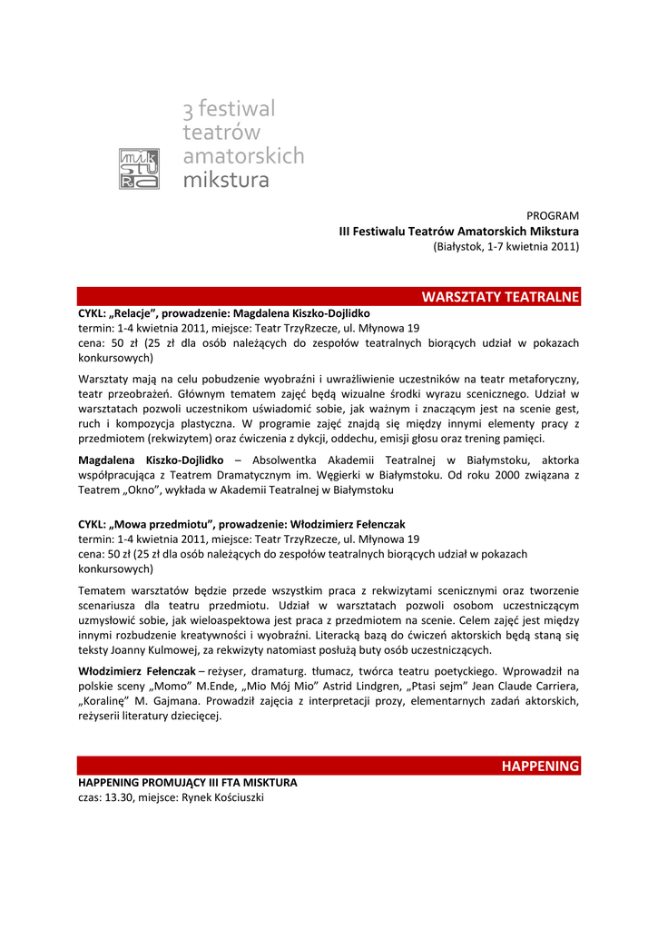 PROGRAM III Festiwalu Teatrów Amatorskich Mikstura (Białystok, 1-7 kwietnia 2011) WARSZTATY TEATRALNE CYKL: „Relacje”, prowadzenie: Magdalena Kiszko-Dojlidko termin: 1-4 kwietnia 2011, miejsce: Teatr TrzyRzecze, ul. Młynowa 19 cena: 50 zł (25 zł dla osób należących do zespołów teatralnych biorących udział w pokazach konkursowych) Warsztaty mają na celu pobudzenie wyobraźni i uwrażliwienie uczestników na teatr metaforyczny, teatr przeobrażeo. Głównym tematem zajęd będą wizualne środki wyrazu scenicznego. Udział w warsztatach pozwoli uczestnikom uświadomid sobie, jak ważnym i znaczącym jest na scenie gest, ruch i kompozycja plastyczna. W programie zajęd znajdą się między innymi elementy pracy z przedmiotem (rekwizytem) oraz dwiczenia z dykcji, oddechu, emisji głosu oraz trening pamięci. Magdalena Kiszko-Dojlidko – Absolwentka Akademii Teatralnej w Białymstoku, aktorka współpracująca z Teatrem Dramatycznym im. Węgierki w Białymstoku. Od roku 2000 związana z Teatrem „Okno”, wykłada w Akademii Teatralnej w Białymstoku CYKL: „Mowa przedmiotu”, prowadzenie: Włodzimierz Fełenczak termin: 1-4 kwietnia 2011, miejsce: Teatr TrzyRzecze, ul. Młynowa 19 cena: 50 zł (25 zł dla osób należących do zespołów teatralnych biorących udział w pokazach konkursowych) Tematem warsztatów będzie przede wszystkim praca z rekwizytami scenicznymi oraz tworzenie scenariusza dla teatru przedmiotu. Udział w warsztatach pozwoli osobom uczestniczącym uzmysłowid sobie, jak wieloaspektowa jest praca z przedmiotem na scenie. Celem zajęd jest między innymi rozbudzenie kreatywności i wyobraźni. Literacką bazą do dwiczeo aktorskich będą staną się teksty Joanny Kulmowej, za rekwizyty natomiast posłużą buty osób uczestniczących. Włodzimierz Fełenczak – reżyser, dramaturg. tłumacz, twórca teatru poetyckiego. Wprowadził na polskie sceny „Momo” M.Ende, „Mio Mój Mio” Astrid Lindgren, „Ptasi sejm” Jean Claude Carriera, „Koralinę” M. Gajmana. Prowadził zajęcia z interpretacji prozy, elementarnych zadao aktorskich, reżyserii literatury dziecięcej. HAPPENING HAPPENING PROMUJĄCY III FTA MISKTURA czas: 13.30, miejsce: Rynek Kościuszki OFICJALNE OTWARCIE FESTIWALU OTWARCIE III FESTIWALU TEATRÓW AMATORSKICH MIKSTURA termin: 4 kwietnia, godz. 18.00, miejsce: Teatr TrzyRzecze, ul. Młynowa 19 wstęp wolny W programie otwarcia III Festiwalu Teatrów Amatorskich Mikstura znajdą się między innymi pokazy powarsztatowych etiud przygotowanych pod opieką Magdaleny Kiszko-Dojlidko oraz Włodzimierza Fełenczaka. WARSZTATY FOTOGRAFICZNE WARSZTATY FOTOGRAFICZNE „FOTO(RE)ANIMACJA” termin: 4-7 kwietnia 2011 cena: 25 zł Myślą przewodnią warsztatów jest hasło: „fotografia w teatrze – teatr w fotografii”. Tematem zajęd, będzie zabawa obrazem i oswajanie przestrzeni teatru, otwieranie się, wcielanie w różne role i tworzenie miniopowiadao przy pomocy technik animacji fotografii. Osoby uczestniczące w warsztatach będą miały okazję spędzid 2 dni w przestrzeniach białostockiego Teatru Dramatycznego poznając przy tym praktyczne strony robienia zdjęd w teatrze podczas prób i spektakli konkursowych. Warsztaty poprowadzą: Katarzyna Czajkowska, stypendystka Europejskiej Akademii Fotografii w Warszawie, członkini Stowarzyszenia na rzecz Kultury i Dialogu 9/12 oraz Krzysztof Wróbel i Julia Sacharczuk ze Stowarzyszenia 9/12. POKAZY KONKURSOWE POKAZY SPEKTAKLI BIORĄCYCH UDZIAŁ W III FESTIWALU TEATRÓW AMATORSKICH MIKSTURA termin: 5-6 kwietnia, miejsce: Mała Scena Teatru Dramatycznego im. Aleksandra Węgierki, ul. Elektryczna 14, szczegółowy plan pokazów dostępny na stronie: www.mikstura.eu wstęp wolny Podczas pokazów konkursowych organizowanych w ramach tegorocznej mikstury na Małej Scenie Teatru Dramatycznego im. Aleksandra Węgierki zaprezentuje się 11 zespołów z 8 miast z całej Polski. Spektakle oceniad będzie jury w składzie: Monika Kostaszuk-Romanowska, teatrolożką z Zakładu Wiedzy o Kulturze Instytutu Filologii Polskiej Uniwersytetu w Białymstoku. Jerzy Szerszunowicz, dziennikarz i krytyk teatralny, dyrektor Centrum im. Ludwika Zamenhofa w Białymstoku oraz Bernard Maciej Bania, aktor Teatru Dramatycznego im. Aleksandra Węgierki w Białymstoku. Pula nagród wynosi 4 000 złotych i zostanie, o jej podziale zdecyduje jury. Po spektaklach konkursowych wszystkie zespoły biorące udział w Miksturze będą miały okazję porozmawiad z członkami jury w czasie godzinnych konsultacji. OGŁOSZENIE WYNIKÓW OGŁOSZENIE WERDYKTU JURY III FESTIWALU TEATRÓW AMATORSKICH MIKSTURA termin: 6 kwietnia, godz. 18.30, miejsce: Mała Scena Teatru Dramatycznego im. Aleksandra Węgierki, ul. Elektryczna 14 wstęp wolny IMPREZY TOWARZYSZĄCE „Mikstura wyrazu” termin: 5 kwietnia 2011, godz. 20.30, miejsce: Klub Cabaret, ul. Kilioskiego 14 wstęp wolny Mikstura wyrazu to niestandardowe rozmowy, interaktywny wykład Moniki KosztaszukRomanowskiej, teatrolożki i jurorki III Festiwalu Teatrów Amatorskich Mikstura. „Mikstura dźwięków” termin: 6 kwietnia 2011, godz. 21.00, miejsce: Klub Cabaret, ul. Kilioskiego 14 wstęp wolny Mikstura dźwięków to interaktywny recital Petera Sycha, twórcy innowacyjnego instrumentu muzycznego „isa harp”, który jest rodzajem harfy ze strunami z podczerwieni. Publicznośd zgromadzona na recitalu będzie mogła nie tylko usłyszed brzmienie nowego instrumentu, ale także samodzielnie na nim zagrad.