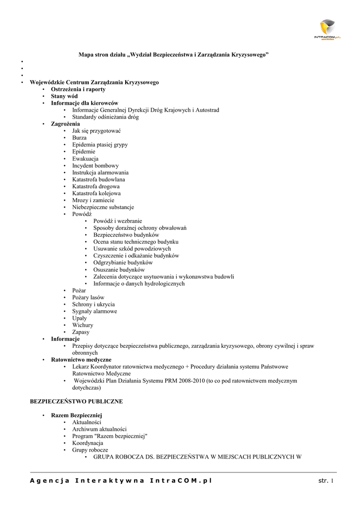 Mapa stron działu „Wydział Bezpieczeństwa i Zarządzania Kryzysowego” • • • • Wojewódzkie Centrum Zarządzania Kryzysowego • Ostrzeżenia i raporty • Stany wód • Informacje dla kierowców • Informacje Generalnej Dyrekcji Dróg Krajowych i Autostrad • Standardy odśnieżania dróg • Zagrożenia • Jak się przygotować • Burza • Epidemia ptasiej grypy • Epidemie • Ewakuacja • Incydent bombowy • Instrukcja alarmowania • Katastrofa budowlana • Katastrofa drogowa • Katastrofa kolejowa • Mrozy i zamiecie • Niebezpieczne substancje • Powódź • Powódź i wezbranie • Sposoby doraźnej ochrony obwałowań • Bezpieczeństwo budynków • Ocena stanu technicznego budynku • Usuwanie szkód powodziowych • Czyszczenie i odkażanie budynków • Odgrzybianie budynków • Osuszanie budynków • Zalecenia dotyczące usytuowania i wykonawstwa budowli • Informacje o danych hydrologicznych • Pożar • Pożary lasów • Schrony i ukrycia • Sygnały alarmowe • Upały • Wichury • Zapasy • Informacje • Przepisy dotyczące bezpieczeństwa publicznego, zarządzania kryzysowego, obrony cywilnej i spraw obronnych • Ratownictwo medyczne • Lekarz Koordynator ratownictwa medycznego + Procedury działania systemu Państwowe Ratownictwo Medyczne • Wojewódzki Plan Działania Systemu PRM 2008-2010 (to co pod ratownictwem medycznym dotychczas) BEZPIECZEŃSTWO PUBLICZNE • Razem Bezpieczniej • Aktualności • Archiwum aktualności • Program "Razem bezpieczniej" • Koordynacja • Grupy robocze • GRUPA ROBOCZA DS. BEZPIECZEŃSTWA W MIEJSCACH PUBLICZNYCH W Agencja Interaktywna IntraCOM.pl str. 1 MIEJSCU ZAMIESZKANIA ORAZ W ŚRODKACH KOMUNIKACJI PUBLICZNEJ GRUPA ROBOCZA DS. BEZPIECZEŃSTWA W SZKOLE ORAZ PRZEMOCY W RODZINIE • GRUPA ROBOCZA DS. BEZPIECZEŃSTWA W RUCHU DROGOWYM • GRUPA ROBOCZA DS. BEZPIECZEŃSTWA W DZIAŁALNOŚCI GOSPODARCZEJ • GRUPA ROBOCZA DS. OCHRONY DZIEDZICTWA NARODOWEGO • Realizowane projekty • Uczestnicy programu razem bezpieczniej w regionie Imprezy masowe • Przepisy prawa • Kontrola przebiegu imprez masowych • Wykaz obiektów monitorowanych • Pytania i odpowiedzi • • • • Bezpieczne wakacje/ferie Bezpieczne EURO 2012 • aktualności (z archiwum) • Zespół do spraw bezpieczeństwa EURO 2012 w woj. Śląskim • Śląska Strategia Bezpieczeństwa EURO 2012 • Informator dla kibiców PROJEKTY UNIJNE • • • Bezpieczne wspólnoty RIMADIMA ERRICA ZARZĄDZANIE KRYZYSOWE • • • Ochrona infrastruktury krytycznej Likwidacja szkód Konkursy OBRONA CYWILNA całość do dosłania, łącznie ze struktura podstron MAPA STRON DZIAŁU Agencja Interaktywna IntraCOM.pl str. 2 WYDZIAŁ BEZPIECZEŃSTWA I ZARZĄDZANIA KRYZYSOWEGO - taka strona główna wydziału, pdf ze strukturą i zadaniami wydziału, aktualności wydziału itd. Wojewódzkie Centrum Zarządzania Kryzysowego Ostrzeżenia i raporty - komunikaty i raporty tylko z bieżącego roku (bez archiwum), kolory bez zmian – ewentualnie archiwizacja komunikatów tylko w panelu. Stany wód - dynamiczne pobieranie mapy na stronę UW Informacje dla kierowców – automatyczne otwieranie strony do której jest przekierowanie w nowym oknie / pobranie dynamiczne mapy z informacjami dla kierowców – do rozważenia Informacje Generalnej Dyrekcji Dróg Krajowych i Autostrad - j.w. Drogi krajowe – Tytuł strony: „Standardy odśnieżania dróg ” – krajowych – wojewódzkich (w postaci plików do pobrania, tabelka) Zagrożenia (teksty zostaną dosłane jeżeli coś będzie wymagało zmiany) – do końca października, na dzień dzisiejszy: – rozmieszczenie zagrożeń alfabetycznie – „katastrofy drogowe” : wykonać w standardzie pozostałych (formatowanie tekstu, kolorystyka, zdjęcie itd.) – „epidemie” mniejszy obrazek (czytelny, lepsza jakość) – „wichury” ewentualnie aktualniejsze zdjęcie – „zapasy...” inna fotka w klimacie pozostałych – dodać (przerzucić z gł. menu 3 dodatkowe kategorie : Pożary lasów, Ptasią grypę i Incydent bombowy, przy czym: – zmiana tytułu „Ptasia Grypa” na „Epidemia ptasiej grypy” – Pożary lasów – ujednolicić z resztą, 3 działy w tekście (ogólne info, nie wolno:, jesteś świadkiem pożaru:, ewentualnie zostanie coś jeszcze dosłane - do konsultacji) – zmiana tytułu „Incydent bombowy” na „Zagrożenia terrorystyczne” , ujednolicić graficznie z pozostałymi, telefony na czerwono, poukładać logicznie układ treści, (po: „zauważyłeś przedmiot” – „dostałeś informację o bombie”, teksty zostaną dosłane Informacje – do usunięcie: Emma, ZHP, - zostają przepisy w postaci plików do pobrania (Przepisy dotyczące bezpieczeństwa publicznego, zarządzania kryzysowego, obrony cywilnej i spraw obronnych ) BEZPIECZEŃSTWO PUBLICZNE - teksty na str. główną do dosłania Razem bezpieczniej – w niezmienionej formie, z tym że: • do usunięcia podstrony : „linki” i „obszary działania”, • do dodania z kolei podstrona : „Uczestnicy programu razem bezpieczniej w regionie” - materiały zostaną dosłane Imprezy masowe – materiały zostaną dosłane (pytania dopiero w listopadzie) Bezpieczne wakacje/ferie – teksty na stronę zostaną dosłane Bezpieczne EURO 2012 – teksty na stronę zostaną dosłane , (informacje dla kibiców: pliki do pobrania o lokalizacji, przepisach itd.) ● gdyby EURO 2012 było na stadionie Śląskim można pomyśleć o interaktywnej mapce i bajerach graficznych, Agencja Interaktywna IntraCOM.pl str. 3 ● przygotować banner do umieszczenia na str. głównej, który miałby się pojawić w „gorącym okresie” poprzedzającym Euro PROJEKTY UNIJNE Bannery Na stronie głównej UW jeden wspólny banner (rotacyjny) projektów unijnych. Przekierowuje on do strony głównej działu „Projekty unijne”, na której wyszczególnione są wszystkie trzy projekty z krótkim opisem (równi