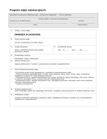 Program zajęć edukacyjnych Ośrodek Turystyczno-Rekreacyjny ,,Gościnna Zagroda’’ / Anna Lipińska ________________________________________________ ______________________________________________________________________ Nazwa obiektu / nazwisko prowadzącego Ul Stawowa 2, 46-060 Przysiecz opolskie _________________________________________________________________________________ _________________________________ Adres Województwo 1. Temat / tytuł zajęć: ZWIERZĘTA W ZAGRODZIE. 2. Czas trwania zajęć: DO 4H- W ZALEŻNOŚCI OD WIEKU GRUPY 3. Grupa docelowa: Dzieci, młodzież szkolna pod opieką dorosłych, dorośli 5. 4. Liczebność grupy: min. …5………… max. ………25…………… Prowadzący zajęcia: Gospodarz- lekarz weterynarii 6. Zakres tematyczny: zajęcia praktyczne z hodowli i użytkowania zwierząt w gospodarstwie 7. Harmonogram/przebieg zajęć: -Przywitanie grupy przez gospodarza i omówienie harmonogramu zajęć - Pokaz zwierząt w gospodarstwie: trzoda, drób, ptactwo, owce, kozy, konie, szop - omówienie zagadnień związanych z dobrostanem zwierząt - użytkowanie kozy- sposób obchodzenia się z kozą, karmienie, gdzie mieszkają, cykl życia, różnice w psychice pomiędzy kozą, a owcą, kierunki użytkowania kozy - użytkowanie owcy- sposób obchodzenia się, wymagania paszowe, dlaczego warto owce hodować, kierunki użytkowania owcy - wspólny poczęstunek 8. Pomoce dydaktyczne: żywe zwierzęta, pasze do wspólnego karmienia, narzędzia wykorzystywane w hodowli-dawniej i dziś 9. Dodatkowe uwagi: Istnieje możliwość modyfikacji tematyki zajęć o dodatkowe atrakcje i pokazy przy wcześniejszym uzgodnieniu z gospodarzem