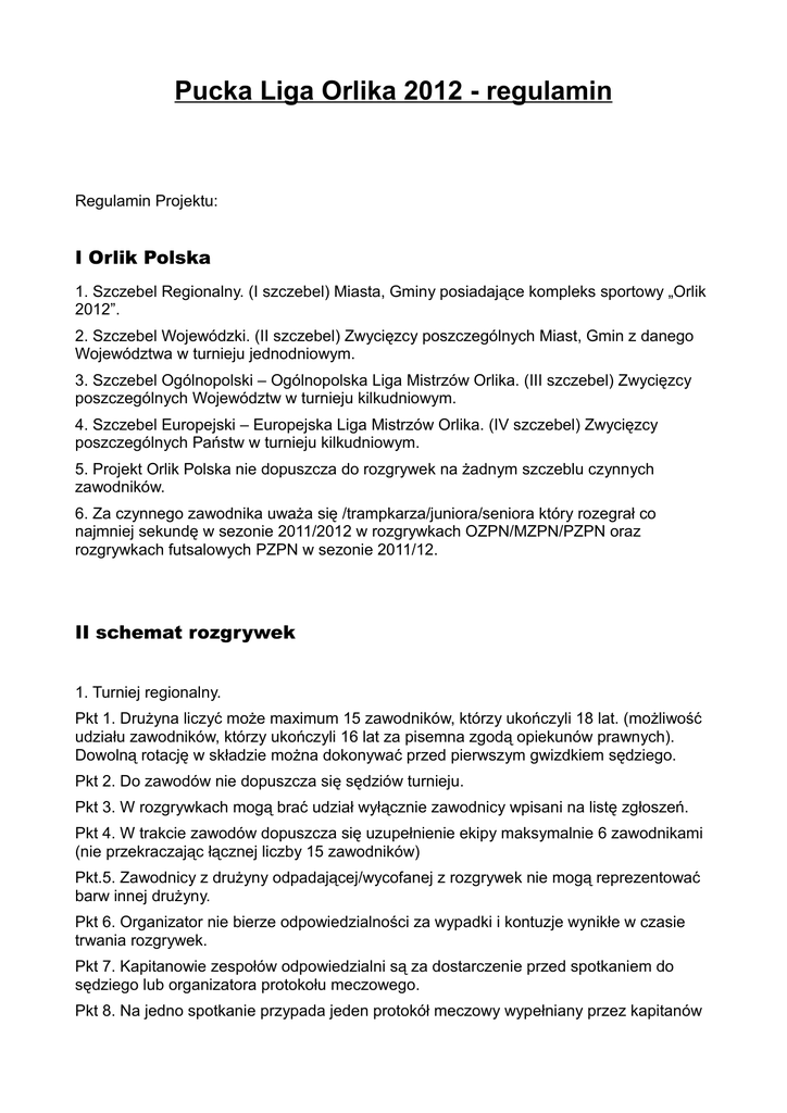 Pucka Liga Orlika 2012 - regulamin Regulamin Projektu: I Orlik Polska 1. Szczebel Regionalny. (I szczebel) Miasta, Gminy posiadające kompleks sportowy „Orlik 2012”. 2. Szczebel Wojewódzki. (II szczebel) Zwycięzcy poszczególnych Miast, Gmin z danego Województwa w turnieju jednodniowym. 3. Szczebel Ogólnopolski – Ogólnopolska Liga Mistrzów Orlika. (III szczebel) Zwycięzcy poszczególnych Województw w turnieju kilkudniowym. 4. Szczebel Europejski – Europejska Liga Mistrzów Orlika. (IV szczebel) Zwycięzcy poszczególnych Państw w turnieju kilkudniowym. 5. Projekt Orlik Polska nie dopuszcza do rozgrywek na żadnym szczeblu czynnych zawodników. 6. Za czynnego zawodnika uważa się /trampkarza/juniora/seniora który rozegrał co najmniej sekundę w sezonie 2011/2012 w rozgrywkach OZPN/MZPN/PZPN oraz rozgrywkach futsalowych PZPN w sezonie 2011/12. II schemat rozgrywek 1. Turniej regionalny. Pkt 1. Drużyna liczyć może maximum 15 zawodników, którzy ukończyli 18 lat. (możliwość udziału zawodników, którzy ukończyli 16 lat za pisemna zgodą opiekunów prawnych). Dowolną rotację w składzie można dokonywać przed pierwszym gwizdkiem sędziego. Pkt 2. Do zawodów nie dopuszcza się sędziów turnieju. Pkt 3. W rozgrywkach mogą brać udział wyłącznie zawodnicy wpisani na listę zgłoszeń. Pkt 4. W trakcie zawodów dopuszcza się uzupełnienie ekipy maksymalnie 6 zawodnikami (nie przekraczając łącznej liczby 15 zawodników) Pkt.5. Zawodnicy z drużyny odpadającej/wycofanej z rozgrywek nie mogą reprezentować barw innej drużyny. Pkt 6. Organizator nie bierze odpowiedzialności za wypadki i kontuzje wynikłe w czasie trwania rozgrywek. Pkt 7. Kapitanowie zespołów odpowiedzialni są za dostarczenie przed spotkaniem do sędziego lub organizatora protokołu meczowego. Pkt 8. Na jedno spotkanie przypada jeden protokół meczowy wypełniany przez kapitanów bądź osoby odpowiedzialne za drużyny. Nie dostarczenie protokołu do sędziego lub organizatora przed spotkaniem, skutkuje uznaniem meczu za nieważny i brakiem punktów dla obydwu zespołów. W przypadku, gdy jedna z drużyn nie wypełni protokołu, zostaje ukarana walkowerem 3:0. Pkt 9. Wszystkie zastrzeżenia dotyczące zawodników grających w turnieju należy zgłaszać organizatorowi bądź sędziemu w trakcie trwającego spotkania. Zastrzeżenia mogą zgłaszać tylko kapitanowie danego meczu, zastrzeżenia zgłaszane przez osoby „trzecie” nie będzą rozpatrywane. Pkt 10. Dodatkowo organizatorzy oraz sędziowie mają prawo sprawdzić listę kadrową każdego zespołu przez cały czas trwania turnieju. Pkt. 11. Sprawdzenie drużyny, które okaże się faktem organizator ukaże drużynę walkowerem 3:0 w rozgrywkach wraz z skreśleniem danej osoby z listy rozgrywek. Pkt 12. Wszelkie sporne sytuacje rozstrzygane są przez komisję organizacyjną w składzie (Organizator, Sędzia/Sędziowie danego spotkania). Pkt 13. Drużyna odwołać może się do wyższej instancji tj. Ambasadora Wojewódzkiego, zaś ten skontaktować może się z Koordynatorami projektu. Jeżeli dane Województwo nie figuruje w Ambasadora Rozgrywek drużyna ma prawo odwołać się do Koordynatorów projektu. Pkt 14. Drużyna, która dopuści się do uszkodzenia elementów wewnętrznych szatni zwraca koszty poniesione w wyniku wandalizmu. Pkt 15. Zgłoszenie drużyny do rozgrywek oznacza akceptację regulaminu. Pkt 16. Mecze rozgrywane są „szóstkami” (w tym bramkarz) 5+1. dokonywanie zmian w czasie gry prowadzone jest systemem „hokejowym” tylko w wyznaczonej strefie zmian. Pkt 17. Czas trwania spotkania oraz system rozgrywek ustala Organizator Regionalny. Przy większej liczbie drużyn preferuje się system ligowy z czasem gry 2×20/25 minut. Z przerwa między pierwszą a drugą połową stanowiącą 2 minuty. Przy mniejszej ilości drużyn Organizator Regionalny ma prawo zrealizować I szczebel w formie Turnieju Jednodniowego. Pkt 18. Spóźnienie drużyny większe niż 10 minut traktowane jest jako walkower. Pkt 19. Aby rozpocząć zawody na boisku musi znajdować się, co najmniej 4 zawodników. Pkt 20. Zdekompletowanie drużyny podczas meczu fazy grupowej do 3 zawodników spowoduje weryfikację spotkania jako walkower 3:0 (kontuzje, brak zawodników rezerwowych, wykluczenia przez otrzymanie czerwonych kartek, opuszczenie boiska). W przypadku opuszczenia placu gry przez drużynę po pierwszej połowie wynik pozostaje z boiska (dotyczy drużyny przegrywającej). Pkt 21. Zdekompletowanie drużyny podczas meczu fazy play-off do 3 zawodników spowoduje weryfikacje spotkania jako walkower 3:0 z równoczesną dyskwalifikacją drużyny z dalszej części rozgrywek (kontuzje, brak zawodników rezerwowych, wykluczenia przez otrzymanie czerwonych kartek, opuszczenie boiska). Pkt 22. Organizator Regionalny ustala dopuszczalne obuwie sportowe do gry/Liga Chełmiecka Orlika: Zawodnicy nie mogą grać z wkręcanymi korkami. Dopuszczalne są mniejsze wkręty gumowe. Pkt 23. Spotkania rozgrywane są piłkami przygotowanymi przez organizatora. Możliwość gry piłką jednej z drużyn, o ile zostanie wyrażona zgoda przez sędziego oraz drużynę przeciwną. Pkt 24. Rzuty z autu wykonywane są z ręki. Pkt 25. Bramkarz wznawia grę z piątki (po opuszczeniu piłki placu gry). Pkt 26. Spotkanie może zostać odwołane tylko jeden raz: – kapitan musi poinformować o tym fakcie organizatora najpóźniej na 2 dni przed wyznaczonym terminem – nie dopuszcza się przełożenia meczu, jeżeli dotyczyć to będzie dwóch ostatnich kolejek oraz całej fazy play-off. Organizator zaległy mecz ustala po konsultacjach z drużynami. W przypadku braku porozumienia organizator narzuca swój termin. Pkt. 27. Termin spotkania zostać może zamieniony z innym terminem meczowym, po wyrażeniu zgody trzech drużyn. Wnioskujący o zmianę terminu kontaktuje się kapitanami, po czym niezwłocznie informuje organizatora jeżeli dojdzie do porozumienia