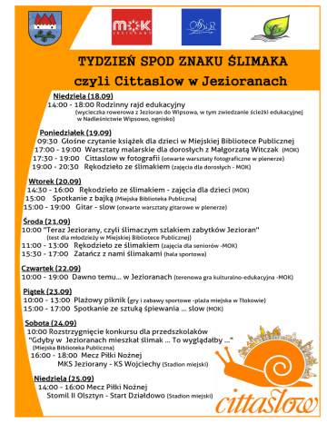 TYDZIEŃ SPOD ZNAKU ŚLIMAKA czyli Cittaslow w Jezioranach Niedziela (18.09) 14:00 - 18:00 Rodzinny rajd edukacyjny (wycieczka rowerowa z Jezioran do Wipsowa, w tym zwiedzanie ścieżki edukacyjnej w Nadleśnictwie Wipsowo, ognisko) Poniedziałek (19.09) 09:30 Głośne czytanie książek dla dzieci w Miejskiej Bibliotece Publicznej 17:00 - 19:00 Warsztaty malarskie dla dorosłych z Małgorzatą Witczak (MOK) 17:30 - 19:00 Cittaslow w fotografii (otwarte warsztaty fotograficzne w plenerze) 19:00 - 20:30 Rękodzieło ze ślimakiem (zajęcia dla dorosłych - MOK) Wtorek (20.09) 14:30 - 16:00 Rękodzieło ze ślimakiem - zajęcia dla dzieci (MOK) 15:00 Spotkanie z bajką (Miejska Biblioteka Publiczna) 15:00 - 19:00 Gitar - slow (otwarte warsztaty gitarowe w plenerze) Środa (21.09) 10:00 "Teraz Jeziorany, czyli ślimaczym szlakiem zabytków Jezioran" (test dla młodzieży w Miejskiej Bibliotece Publicznej) - 13:00 Rękodzieło ze ślimakiem (zajęcia dla seniorów -MOK) 11:00 15:30 - 17:00 Zatańcz z nami ślimakami (hala sportowa) Czwartek (22.09) 10:00 - 19:00 Dawno temu... w Jezioranach (terenowa gra kulturalno-edukacyjna -MOK) Piątek (23.09) 10:00 - 13:00 Plażowy piknik (gry i zabawy sportowe -plaża miejska w Tłokowie) 15:00 - 17:00 Spotkanie ze sztuką śpiewania ... slow (MOK) Sobota (24.09) 10:00 Rozstrzygnięcie konkursu dla przedszkolaków "Gdyby w Jezioranach mieszkał ślimak ... To wyglądałby ..." (Miejska Biblioteka Publiczna) 16:00 - 18:00 Mecz Piłki Nożnej MKS Jeziorany - KS Wojciechy (Stadion miejski) Niedziela (25.09) 14:00 - 16:00 Mecz Piłki Nożnej Stomil II Olsztyn - Start Działdowo (Stadion miejski)