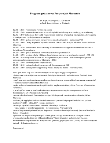 Program godzinowy Festynu jak Marzenie 14.maja 2011 w godz. 12.00-16.00 w Park Kusocińskiego w Olsztynie 12.00 - 12.15 rozpoczęcie Festynu na scenie 12.15 - 12.40 wręczenie marzenia przez olsztyńskich siatkarzy oraz nauka gry w siatkówkę 12.35 - 12.40 (obecność do 14.30) wjazd straży pożarnej oraz policji na sygnale na teren parku – straż pożarna i policja oraz straż miejska 12.40 - 13.10 pokaz pierwszej pomocy wraz z nauką dla dzieci - ratownicy PCK 13.00 - 13.40 "Mały Kopernik" -przedstawienie Teatru Lalek w stylu włoskim -Teatr Lalek w Olsztynie 14.00 - 14.20 pokaz tańca -klub taneczny z Tomaszkowa, następnie nauka tańca dla dzieci – świetlica w Tomaszkowie 14.20 - 14.40 pokaz akrobacji rowerowych Stowarzyszenie SKP 14.40 - 14.55 występ szkoły 101 jako długoletniego partnera w spełnianiu marzeń – SSP 101 14.55 - 15.10 wręczanie marzeń dla Marzycieli oraz puszczenie 100 balonów jako symbol setnego spełnionego marzenia w Olsztynie - FMM 15.10 - 15.40 Stowarzyszenie Przyjaciół SP2 15.20 - 15.40 pokaz akrobacji rowerowych Stowarzyszenie SKP 15.40 - 16.00 pokaz pierwszej pomocy wraz z nauką dla dzieci - ratownicy PCK Poza tym przez cały czas trwania Festynu dzieci będą mogły skorzystać z: - ściany marzeń - miejsce do malowania dziecięcych marzeń – wolontariusze Fundacji Mam Marzenie - szafy marzeń - gdzie zostaną pomalowane i przebrane za pomocą bibuły za wymarzoną postać – wolontariusze Fundacji Mam Marzenie - ręka wolontariusza (malowanie ręki i odciski na planszy) - Olsztyńskie Centrum Wolontariatu "SPINACZ" – przekąsić co nieco w słodkim kąciku (wyroby domowe - wypieczone przez uczniów z Tomaszkowa , SP 101 oraz zuchy z ZHR) - wziąć udział w Loterii Fantowej wrzucając 5zł do puszek – wolontariusze Fundacji Mam Marzenie - zobacz jak wygląda dzień na obozie harcerskim i pobawić się w podchody lub na „polanie zuchowej” (ZHR – obóz, ZHP – polana zuchowa) - nauczyć się robić zwierzątka z balonów – Fundacja Dr Clown – wziąć udział w mini tor przeszkód - Stowarzyszenie Przyjaciół SP2 –zostać żeglarzem i pobawić się na żaglówce – Nauticus Fundacja Promocji Sportów Wodnych Dzieci i Młodzieży –pobawić się na placu bezpiecznych zabaw gdzie czekają na nie atrakcje takie jak: ściana wspinaczkowa dla dzieci od 12 lat, zjeżdżalnia Titanic dla dzieci małych i dużych, góra Kilimandżaro -wspinaczka dla małych dzieci (Bartbo), pływająca kula (Zorba) dla dzieci małych i dużych – Odjazdowe imprezy Zapraszamy!