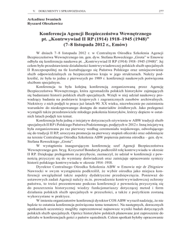 V. DOKUMENTY I SPRAWOZDANIA 277 Arkadiusz Iwaniuch Ryszard Oleszkowicz Konferencja Agencji Bezpieczeństwa Wewnętrznego pt. „Kontrwywiad II RP (1914) 1918–1945 (1948)” (7–8 listopada 2012 r., Emów) W dniach 7–8 listopada 2012 r. w Centralnym Ośrodku Szkolenia Agencji Bezpieczeństwa Wewnętrznego im. gen. dyw. Stefana Roweckiego „Grota” w Emowie odbyła się konferencja naukowa pt. „Kontrwywiad II RP (1914) 1918–1945 (1948)”. Jej celem było przedstawienie działalności kontrwywiadowczej polskich służb specjalnych II Rzeczpospolitej na tle kształtującego się Państwa Polskiego oraz umiejscowienie służb odpowiedzialnych za bezpieczeństwo kraju w jego strukturach. Należy podkreślić, że była to jedna z pierwszych po 1989 r. konferencji naukowych poświęcona służbom specjalnym. Konferencja ta była kolejną konferencją zorganizowaną przez Agencję Bezpieczeństwa Wewnętrznego, która zgromadziła polskich historyków zajmujących się badaniami historii polskich służb specjalnych. Wzięli w niej udział naukowcy prowadzący badania na podstawie krajowych i zagranicznych zasobów archiwalnych. Niektórzy z nich podjęli te prace już latach 90. XX wieku, niezwłocznie po zaistnieniu warunków do nieskrępowanego dostępu do materiałów źródłowych. Jako prelegenci wystąpili także przedstawiciele młodego pokolenia historyków, którzy dopiero w ostatnich latach podjęli ten temat. Konferencja była jedną z inicjatyw dotyczacych ożywienia w ABW tradycji służb specjalnych II RP i Polskiego Państwa Podziemnego, podjętych w 2012 r. Inną inicjatywą była zorganizowana po raz pierwszy według ceremoniału wojskowego, odwołującego się do tradycji II RP, uroczysta promocja na pierwszy stopień oficerski oraz odsłonięcie na terenie Centralnego Ośrodka Szkolenia ABW popiersia patrona ośrodka – gen. dyw. Stefana Roweckiego „Grota”. W wystąpieniu inaugurującym konferencję szef Agencji Bezpieczeństwa Wewnętrznego gen. bryg. Krzysztof Bondaryk podkreślił rolę kontrwywiadu w okresie II RP. Dziękując prelegentom za przybycie, zaznaczył, że udział w konferencji z pewnością przyczyni się do wymiany doświadczeń oraz zainicjuje opracowanie syntezy historii polskiego kontrwywiadu w okresie 1914–1918. Dyrektor Centralnego Ośrodka Szkolenia ABW w Emowie mjr dr Zbigniew Nawrocki w swym wystąpieniu podkreślił, że wybór ośrodka jako miejsca konferencji uwzględniał także aspekty dydaktyczne przedsięwzięcia. Ponieważ do ustawowych zadań Agencji należy m.in. prowadzenie kontrwywiadowczej ochrony państwa, to treści prezentowane podczas konferencji z pewnością przyczynią się do poszerzenia historycznej wiedzy funkcjonariuszy dotyczącej metod i form działania polskich służb specjalnych w przeszłości, a także z pożytkiem zostaną wykorzystane w praktyce. W imieniu organizatorów konferencji dyrektor COS ABW wyraził nadzieję, że nie będzie to ostatnia konferencja poświęcona temu tematowi. Na następnych, dorocznych spotkaniach uczestnicy mogliby zaprezentować najnowsze wyniki badań dotyczących polskich służb specjalnych. Oprócz historyków polskich planowane jest zaproszenie do udziału w konferencjach gości z państw sąsiednich. Celem spotkań byłoby opracowanie 278 PRZEGLĄD BEZPIECZEŃSTWA WEWNĘTRZNEGO 8/13 i wydanie monografii poświęconej historii polskiego kontrwywiadu jako agendy niepodległego państwa polskiego. Konferencji towarzyszyła okolicznościowa wystawa przedmiotów i sprzętów wykorzystywanych przez polskie służby specjalne – można było zobaczyć m.in. słynną maszynę szyfrującą Enigmę oraz obejrzeć odsłonięty we wrześniu 2012 r. pomnik patrona Ośrodka – gen. dyw. Stefana Roweckiego „Grota”, Komendanta Głównego Armii Krajowej. Zdj. 1. Wystąpienie szefa ABW gen. bryg. Krzysztofa Bondaryka. V. DOKUMENTY I SPRAWOZDANIA 279 Zdj. 2. Wystąpienie dyrektora COS ABW w Emowie mjr. dr. Zbigniewa Nawrockiego. Zdj. 3. Uczestnik konferencji prof. Henryk Ćwięk przy oryginalnym egzemplarzu Enigmy ze zbiorów COS ABW w Emowie.