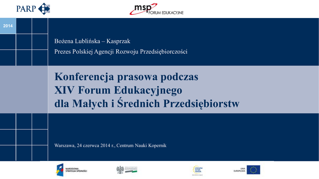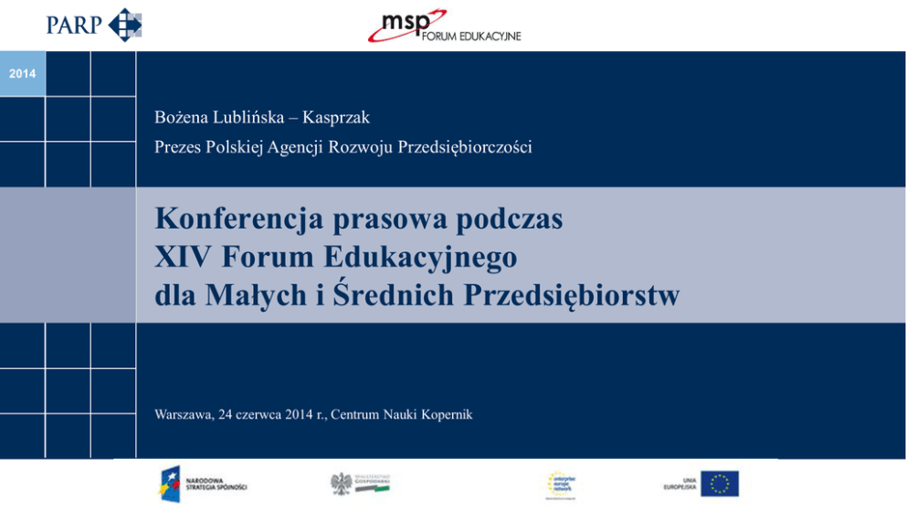 2014 Bożena Lublińska – Kasprzak Prezes Polskiej Agencji Rozwoju Przedsiębiorczości Konferencja prasowa podczas XIV Forum Edukacyjnego dla Małych i Średnich Przedsiębiorstw Warszawa, 24 czerwca 2014 r., Centrum Nauki Kopernik Warszawa, 24 czerwca 2014 r. Tematy: 1. Prezentacja usługi doradczo-szkoleniowej dla MSP oferowanej przez wybranych w drodze konkursu usługodawców. Doradca pomoże przedsiębiorcom w planowaniu oraz realizacji przedsięwzięć finansowanych ze środków zwrotnych (kredyt). Usługa jest powiązana z dostosowaną ofertą finansowania zewnętrznego instytucji finansowych zaangażowanych w projekt systemowy PARP „Planowanie działań w MSP a finansowanie zwrotne”. 2. Prezentacja nowego narzędzia internetowego: aplikacji „Warszawa dla biznesu. Twoja mapa usług”, przygotowanej przez ośrodek Enterprise Europe Network przy PARP we współpracy z instytucjami otoczenia biznesu. 3. Fundusze 2014 – 2020 – perspektywa PARP. Warszawa, 24 czerwca 2014 r. Usługa doradczo-szkoleniowa dla MSP Harmonogram kwiecień czerwiec czerwiec 2014 – marzec 2015 Warszawa, 24 czerwca 2014 r. Korzyści dla przedsiębiorców Dostosowana oferta Instytucji Finansowych 4 Instytucje Finansowe 13 Podmiotów Wsparcia Korzystniejsza od standardowej oferta finansowania dla MSP objętych usługą doradczo-szkoleniową 1000 mikro i małych firm Dofinansowana usługa doradczoszkoleniowa Lepsze parametry cenowe Niższe zabezpieczenia Otwarcie na nowy rodzaj produktu lub klienta 100 godzin doradztwa dla przedsiębiorcy 2000 przeszkolonych osób 70% przedsiębiorców poprawi wiedzę w zakresie planowania i realizacji przedsięwzięć z udziałem finansowanie zwrotnego Usługa według opracowanego i monitorowanego standardu KSU Usługodawcy wybrani w konkursie Warszawa, 24 czerwca 2014 r. Warszawa, 24 czerwca 2014 r. http://ksu.parp.gov.pl/pl/oferta_ksu/pomoc_kredyt_pozyczka_leasing Warszawa, 24 czerwca 2014 r. Warszawa, 24 czerwca 2014 r. Warszawa, 24 czerwca 2014 r. Nowa perspektywa 2014 – 2020 Programy Operacyjne wdrażane przez PARP PO Inteligentny Rozwój (PO IR) PO Polska Wschodnia (PO PW) PO Wiedza, Edukacja, Rozwój (POWER) Warszawa, 24 czerwca 2014 r. PO Inteligentny Rozwój (PO IR) Celem PO IR jest zwiększenie innowacyjności i konkurencyjności polskiej gospodarki. Program koncentruje się na przedsięwzięciach związanych ze zwiększeniem innowacyjności gospodarki, rozwojem sektora nauki, współpracy pomiędzy przedsiębiorstwami a sektorem nauki oraz zapewnieniem wysokiej jakości otoczenia biznesu sprzyjającego podnoszeniu innowacyjności przedsiębiorstw. Program dzieli się na pięć osi priorytetowych: • • • • • Oś 1. Wsparcie prowadzenia prac B+R przez przedsiębiorstwa oraz konsorcja naukowo-przemysłowe Oś 2. Wsparcie innowacji w przedsiębiorstwach Oś 3. Wsparcie otoczenia i potencjału innowacyjnych przedsiębiorstw Oś 4. Zwiększenie potencjału naukowo-badawczego Oś 5. Pomoc techniczna. PARP jest przewidywana jako instytucja wdrażająca do wybranych działań przede wszystkim w ramach osi 2 i 3. Warszawa, 24 czerwca 2014 r. PO Inteligentny Rozwój (PO IR) Działania PARP w Osi 2 • • Badania na rynek – dotacja – planowana alokacja: 850 mln euro. • • Starter - instrument zwrotny – planowana alokacja: 200 mln euro. • • Centra badawczo-rozwojowe – dotacja – planowana alokacja: 170 mln euro. Biz-Nest – instrument zwrotny – planowana alokacja: 64,4 mln euro. Fundusz Innowacji – instrument zwrotny – planowana alokacja: 143,6 mln euro. 4Stock – dotacja – planowana alokacja: 7 mln euro. Warszawa, 24 czerwca 2014 r. PO Inteligentny Rozwój (PO IR) Działania PARP w Osi 3 (proponowana alokacja: 975 mln euro) • • • • • • • • • • Stymulowanie współpracy nauki z biznesem – bony na innowacje Rozwój proinnowacyjnych usług dla biznesu – IOB Ochrona własności intelektualnej przedsiębiorstw Internacjonalizacja krajowych klastrów kluczowych (KKK) INNO-BIZ Wsparcie przedsiębiorców w zakresie promocji polskich marek produktowych Przedsiębiorcy w międzynarodowych programach innowacyjnych Polskie mosty technologiczne INNO_LAB Otwarte innowacje Warszawa, 24 czerwca 2014 r. PO Polska Wschodnia (PO PW) Kontynuacja programu Polska Wschodnia z lat 2007 – 2013. Celem programu jest wzrost konkurencyjności i innowacyjności makroregionu Polski Wschodniej. Zostanie nim objęte 5 województw o najniższych w skali kraju wartościach PKB na mieszkańca i jednych z najniższych wartościach tego wskaźnika w skali UE – warmińsko-mazurskie, podlaskie, lubelskie, podkarpackie i świętokrzyskie. Program dzieli się na pięć osi priorytetowych: • • • • • Oś 1. Innowacyjna Polska Wschodnia; Oś 2. Przedsiębiorcza Polska Wschodnia; Oś 3. Nowoczesna infrastruktura transportowa; Oś 4. Ponadregionalna infrastruktura kolejowa; Oś 5. Pomoc techniczna. PARP ma pełnić rolę Instytucji Pośredniczącej dla całego Programu, z wyłączeniem części działań priorytetu inwestycyjnego 3.3 oraz osi 4. Warszawa, 24 czerwca 2014 r. PO Polska Wschodnia (PO PW) – planowana alokacja: 2 mld euro Działania PARP w Osi 1 • Wzmacnianie zdolności innowacyjnej • • • przedsiębiorstw. Rozbudowa wachlarza i profesjonalizacja usług ośrodków innowacji. Wsparcie MŚP w zakresie usług ośrodków innowacji. Ponadregionalna sieć współpracy ośrodków innowacji. Warszawa, 24 czerwca 2014 r. PO Polska Wschodnia (PO PW) Działania PARP w Osi 2 • • • • Platformy startowe dla nowych pomysłów – planowana alokacja: 201 mln euro Wsparcie internacjonalizacji 109 mln euro MŚP Wsparcie klastrów internacjonalizacji – planowana w B+R+I Wsparcie klastrów z Polski Wschodniej – planowana alokacja: Działania PARP w Osi 3 • • zakresie alokacja: Poprawa systemu komunikacji publicznej Poprawa układów transportowych Warszawa, 24 czerwca 2014 r. PO Wiedza, Edukacja, Rozwój (POWER) Celem pro