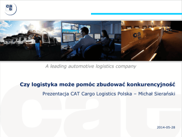 A leading logistics company A leadingautomotive automotive logistics company Czy logistyka może pomóc zbudować konkurencyjność Prezentacja CAT Cargo Logistics Polska – Michał Sierański 2014-05-28 Agenda Czym jest konkurencyjność Badanie satysfakcji klientów - pierwszym krokiem do zwiększenia konkurencyjności Wartości w obszarze logistyki zwiększające konkurencyjność Specjalizacja CAT Cargo Logistics Case study Wnioski Czym jest konkurencyjność? Konkurencyjność - definicja (Wikipedia) zdolność do długookresowego, efektywnego wzrostu. Konkurencyjność we współczesnej globalnej gospodarce jest wyznacznikiem: efektywnego funkcjonowania przedsiębiorstwa na rynku oraz osiągania sukcesów rynkowych Działania ciągłego podnoszenia konkurencyjności powinniśmy: traktować priorytetowo na stałe zakorzenić w całej organizacji, na każdym jej poziomie Badanie satysfakcji klientów jest pierwszym krokiem do zwiększenia konkurencyjności Badanie satysfakcji klientów Badanie satysfakcji klientów CAT - najważniejsze informacje: kompleksowe, roczne badanie badanie kluczowych klientów firmy wywiady online / telefoniczne wysoki współczynnik odpowiedzi Jak działamy w CAT po przeprowadzeniu badania? analizujemy wyniki i wyciągamy wnioski wdrażamy rozwiązania indywidualne i strukturalne monitorujemy skuteczne wdrożenie powtarzamy cykl (kolejne okresowe badanie) i zaczynamy od początku… do osiągnięcia postawionych norm przez klientów Badanie satysfakcji jest impulsem do ciągłych usprawnień Wartości w obszarze logistyki zwiększające konkurencyjność Jakich wartości w obszarze logistyki zwiększających konkurencyjność rynkową oczekują od operatorów logistycznych zleceniodawcy? Kompetencji i doświadczenia Kompleksowości i zasięgu geograficznego usług Skracania czasów dostaw Terminowości i bezszkodowości Wysokiej jakości usług i standardów obsługi Elastyczności Dopasowania rozwiązań do własnych potrzeb Stabilności współpracy Odpowiedniego stosunku ceny do jakości usług Prawidłowa diagnoza oczekiwań klientów jest podstawą do zwiększenia konkurencyjności przedsiębiorstw Wartości w obszarze logistyki zwiększające konkurencyjność Jakich wartości w obszarze logistyki oczekują odbiorcy finalni ? Dostępności produktów Możliwości wyboru odpowiedniego trybu czasowego dostaw Gwarancji dostaw (na czas i miejsce) W jaki sposób rozwiązania CAT LC zwiększają konkurencyjność? Partnerska współpraca z operatorem logistycznym prowadzi do budowania długotrwałej konkurencyjności przedsiębiorstw Kompetencje i doświadczenie Groupe CAT 108 platform logistycznych Vehicle Logistics 100 platform logistycznych Cargo Logistics 23 kraje 5,000 pracowników Ponad 50 lat doświadczeń! CAT Cargo Logistics (CAT LC) Kompleksowa obsługa logistyczna towarów branży: motoryzacyjnej i przemysłowej CAT Vehicle Logistics (CAT LV) Kompleksowa obsługa logistyczna pojazdów gotowych CAT Cargo Logistics Polska • . CAT LC Polska – kluczowe dane Działalność w Polsce: od 1994 r. Siedziba: Duchnice k. Warszawy Obrót w 2013 roku: 202 mln PLN Liczba pracowników: 210 osób Oddziały: 9 lokalizacji Obroty CAT LC Polska [PLN] 250 200 Gdańsk 150 100 50 Bydgoszcz 0 2005 2006 2007 2008 2009 2010 2011 2012 2013 Śrem Stryków Duchnice Liczba pracowników CAT LC Polska Dobroszyce 250 Mysłowice Kraków 200 150 100 50 0 2005 2006 2007 2008 2009 2010 2011 2012 2013 Kompleksowość usług Dystrybucja krajowa Międzynarodowe przewozy FTL i doładunki Międzynarodowe przewozy drobnicowe Logistyka magazynowa TopCAT – dostawy najwyższego priorytetu BikeCAT – rozwiązania logistyczne dla jednośladów Ekspresowy serwis paczkowy Transport lotniczy i morski Inbound logistics Transport ponadnormatywny Jakość usług, standardy obsługi, wiarygodność ISO 9001: 2008 ISO 14001: 2004 PN-N 18001: 2004 OHSAS 18001: 2007 AEO - Certyfikat Upoważnionego Przedsiębiorcy z obszarze bezpieczeństwa i ochrony DUNS: 36–794-2583 – Certyfikat Wiarygodności Biznesowej Rzetelna Firma: Certyfikat Rzetelności Krajowego Rejestru Długów 2013 Specjalizacja CAT LC - Referencje Producenci samochodów In co-operation with In cooperation with Producenci motocykli Dostawcy części zamiennych In cooperation with Branża przemysłowa CAT Cargo Logistics: Case study 1 W jaki sposób wspólne działania zwiększyły konkurencyjność naszego klienta w obszarze dostępności produktów? Cel przedsiębiorcy: Jednakowa dostępność produktów dla wszystkich odbiorców w Polsce Sprzedaż produktów na nowych rynkach (CZ, SK, HU, RO, BA) Realizacja wszystkich zleceń zgodnie z zamówieniem odbiorcy Wyzwania dla przedsiębiorcy: Lokalizacja magazynu Dopasowanie systemu transportowego do nowych warunków CAT Cargo Logistics: Case study 1 Etapy projektu: Grupa projektowa CAT + Klient Zdefiniowanie oczekiwań klienta Przygotowanie koncepcji logistycznych Wybór optymalnego rozwiązania Wdrożenie Zadanie dla operatora: Warianty różnych lokalizacji magazynu Zaprojektowanie systemu transportowego CAT Cargo Logistics: Case study 1 Rezultat: Budowa wspólnego magazynu (składowanie + crossdock) Korzyści Późny cut-off Niższe koszty transportu Dodatkowa powierzchnia buforowa w strefie operatora Dostawa produktów poprzez sieć dystrybucyjną CAT w Polsce Korzyści Gwarancja dostaw next day w całej Polsce Systemy dostaw: urgent do 12:00 i stock do 17:00 Jakość serwisu na poziomie 99,7% Dostawa produktów poprzez drobnicową sieć CAT w CZ,SK,HU,RO,BG Korzyści Ekspresowe dostawy do krajów południowych (next day: CZ,SK,HU) Jednolite standardy serwisu dla wszystkich krajów Jeden operator odpowiedzialny za cały proces CAT Cargo Logistics: Case study 2 W jaki sposób wspólne działania zwiększyły konkurencyjność naszego klienta w obszarach: Możliwości wyboru przez odbiorcę odpowiedniego trybu czasowego dostaw Gwarancji otrzymania produktów w ustalonym czasie C