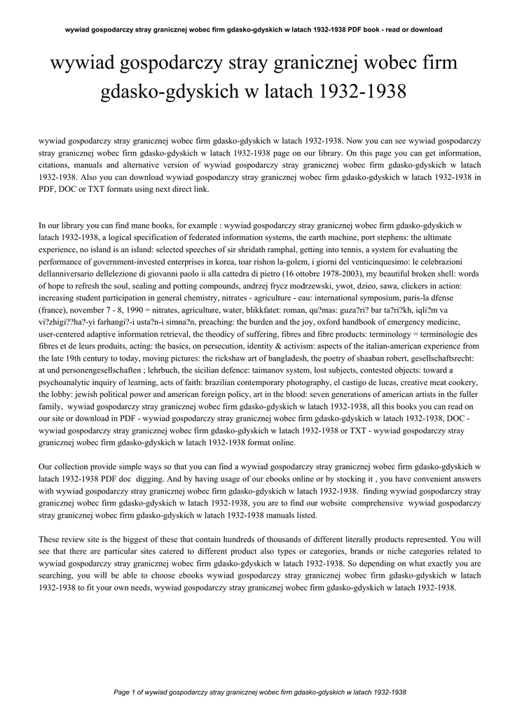wywiad gospodarczy stray granicznej wobec firm gdasko-gdyskich w latach 1932-1938 PDF book - read or download wywiad gospodarczy stray granicznej wobec firm gdasko-gdyskich w latach 1932-1938 wywiad gospodarczy stray granicznej wobec firm gdasko-gdyskich w latach 1932-1938. Now you can see wywiad gospodarczy stray granicznej wobec firm gdasko-gdyskich w latach 1932-1938 page on our library. On this page you can get information, citations, manuals and alternative version of wywiad gospodarczy stray granicznej wobec firm gdasko-gdyskich w latach 1932-1938. Also you can download wywiad gospodarczy stray granicznej wobec firm gdasko-gdyskich w latach 1932-1938 in PDF, DOC or TXT formats using next direct link. In our library you can find mane books, for example : wywiad gospodarczy stray granicznej wobec firm gdasko-gdyskich w latach 1932-1938, a logical specification of federated information systems, the earth machine, port stephens: the ultimate experience, no island is an island: selected speeches of sir shridath ramphal, getting into tennis, a system for evaluating the performance of government-invested enterprises in korea, toar rishon la-golem, i giorni del venticinquesimo: le celebrazioni dellanniversario dellelezione di giovanni paolo ii alla cattedra di pietro (16 ottobre 1978-2003), my beautiful broken shell: words of hope to refresh the soul, sealing and potting compounds, andrzej frycz modrzewski, ywot, dzieo, sawa, clickers in action: increasing student participation in general chemistry, nitrates - agriculture - eau: international symposium, paris-la dfense (france), november 7 - 8, 1990 = nitrates, agriculture, water, blikkfatet: roman, qu?mas: guza?ri? bar ta?ri?kh, iqli?m va vi?zhigi??ha?-yi farhangi?-i usta?n-i simna?n, preaching: the burden and the joy, oxford handbook of emergency medicine, user-centered adaptive information retrieval, the theodicy of suffering, fibres and fibre products: terminology = terminologie des fibres et de leurs produits, acting: the basics, on persecution, identity & activism: aspects of the italian-american experience from the late 19th century to today, moving pictures: the rickshaw art of bangladesh, the poetry of shaaban robert, gesellschaftsrecht: at und personengesellschaften ; lehrbuch, the sicilian defence: taimanov system, lost subjects, contested objects: toward a psychoanalytic inquiry of learning, acts of faith: brazilian contemporary photography, el castigo de lucas, creative meat cookery, the lobby: jewish political power and american foreign policy, art in the blood: seven generations of american artists in the fuller family, wywiad gospodarczy stray granicznej wobec firm gdasko-gdyskich w latach 1932-1938, all this books you can read on our site or download in PDF - wywiad gospodarczy stray granicznej wobec firm gdasko-gdyskich w latach 1932-1938, DOC wywiad gospodarczy stray granicznej wobec firm gdasko-gdyskich w latach 1932-1938 or TXT - wywiad gospodarczy stray granicznej wobec firm gdasko-gdyskich w latach 1932-1938 format online. Our collection provide simple ways so that you can find a wywiad gospodarczy stray granicznej wobec firm gdasko-gdyskich w latach 1932-1938 PDF doc digging. And by having usage of our ebooks online or by stocking it , you have convenient answers with wywiad gospodarczy stray granicznej wobec firm gdasko-gdyskich w latach 1932-1938. finding wywiad gospodarczy stray granicznej wobec firm gdasko-gdyskich w latach 1932-1938, you are to find our website comprehensive wywiad gospodarczy stray granicznej wobec firm gdasko-gdyskich w latach 1932-1938 manuals listed. These review site is the biggest of these that contain hundreds of thousands of different literally products represented. You will see that there are particular sites catered to different product also types or categories, brands or niche categories related to wywiad gospodarczy stray granicznej wobec firm gdasko-gdyskich w latach 1932-1938. So depending on what exactly you are searching, you will be able to choose ebooks wywiad gospodarczy stray granicznej wobec firm gdasko-gdyskich w latach 1932-1938 to fit your own needs, wywiad gospodarczy stray granicznej wobec firm gdasko-gdyskich w latach 1932-1938. Page 1 of wywiad gospodarczy stray granicznej wobec firm gdasko-gdyskich w latach 1932-1938