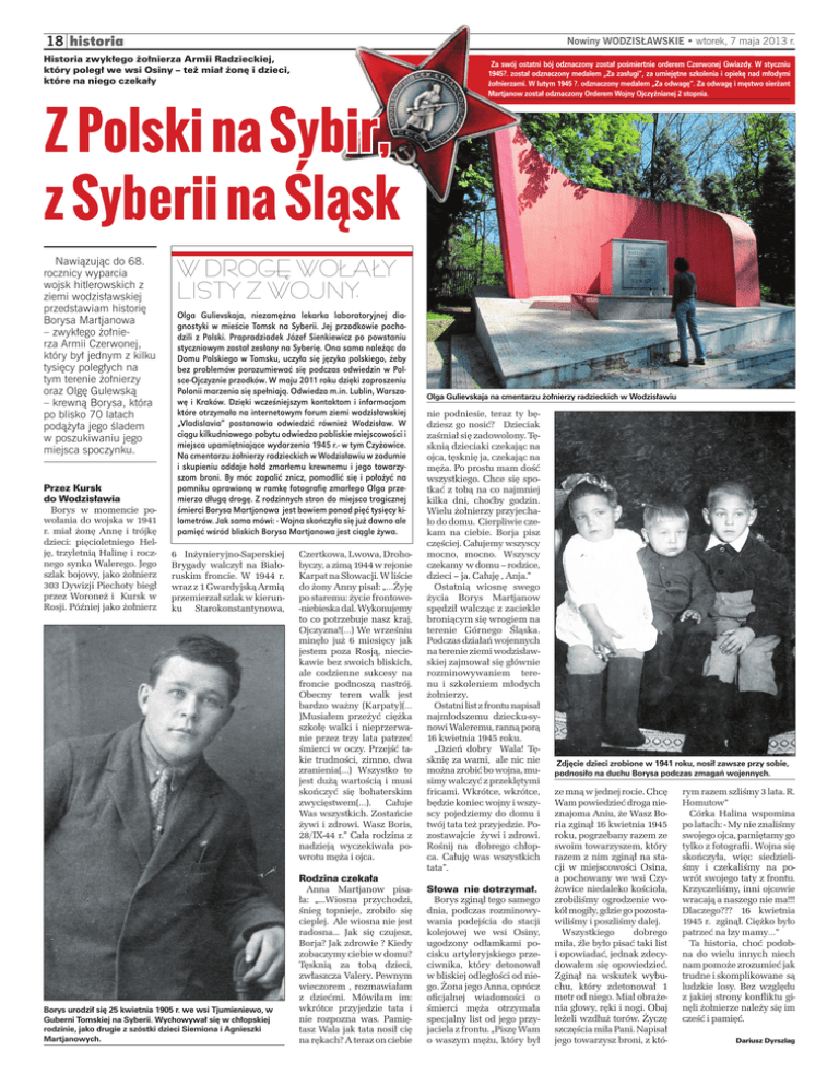 18 historia Nowiny WODZISŁAWSKIE • wtorek, 7 maja 2013 r. Historia zwykłego żołnierza Armii Radzieckiej, który poległ we wsi Osiny – też miał żonę i dzieci, które na niego czekały Z Polski na Sybir, z Syberii na Śląsk Nawiązując do 68. rocznicy wyparcia wojsk hitlerowskich z ziemi wodzisławskiej przedstawiam historię Borysa Martjanowa – zwykłego żołnierza Armii Czerwonej, który był jednym z kilku tysięcy poległych na tym terenie żołnierzy oraz Olgę Gulewską – krewną Borysa, która po blisko 70 latach podążyła jego śladem w poszukiwaniu jego miejsca spoczynku. Przez Kursk do Wodzisławia Borys w momencie powołania do wojska w 1941 r. miał żonę Annę i trójkę dzieci: pięcioletniego Helję, trzyletnią Halinę i rocznego synka Walerego. Jego szlak bojowy, jako żołnierz 303 Dywizji Piechoty biegł przez Woroneż i Kursk w Rosji. Później jako żołnierz Za swój ostatni bój odznaczony został pośmiertnie orderem Czerwonej Gwiazdy. W styczniu 1945?. został odznaczony medalem „Za zasługi”, za umiejętne szkolenia i opiekę nad młodymi żołnierzami. W lutym 1945 ?. odznaczony medalem „Za odwagę”. Za odwagę i męstwo sierżant Martjanow został odznaczony Orderem Wojny Ojczyźnianej 2 stopnia. W DROGĘ WOŁAŁY LISTY Z WOJNY. Olga Gulievskaja, niezamężna lekarka laboratoryjnej diagnostyki w mieście Tomsk na Syberii. Jej przodkowie pochodzili z Polski. Prapradziadek Józef Sienkiewicz po powstaniu styczniowym został zesłany na Syberię. Ona sama należąc do Domu Polskiego w Tomsku, uczyła się języka polskiego, żeby bez problemów porozumiewać się podczas odwiedzin w Polsce-Ojczyznie przodków. W maju 2011 roku dzięki zaproszeniu Polonii marzenia się spełniają. Odwiedza m.in. Lublin, Warszawę i Kraków. Dzięki wcześniejszym kontaktom i informacjom które otrzymała na internetowym forum ziemi wodzisławskiej „Vladislavia” postanawia odwiedzić również Wodzisław. W ciągu kilkudniowego pobytu odwiedza pobliskie miejscowości i miejsca upamiętniające wydarzenia 1945 r.- w tym Czyżowice. Na cmentarzu żołnierzy radzieckich w Wodzisławiu w zadumie i skupieniu oddaje hołd zmarłemu krewnemu i jego towarzyszom broni. By móc zapalić znicz, pomodlić się i położyć na pomniku oprawioną w ramkę fotografię zmarłego Olga przemierza długą drogę. Z rodzinnych stron do miejsca tragicznej śmierci Borysa Martjonowa jest bowiem ponad pięć tysięcy kilometrów. Jak sama mówi: - Wojna skończyła się już dawno ale pamięć wśród bliskich Borysa Martjonowa jest ciągle żywa. 6 Inżynieryjno-Saperskiej Brygady walczył na Białoruskim froncie. W 1944 r. wraz z 1 Gwardyjską Armią przemierzał szlak w kierunku Starokonstantynowa, Borys urodził się 25 kwietnia 1905 r. we wsi Tjumieniewo, w Guberni Tomskiej na Syberii. Wychowywał się w chłopskiej rodzinie, jako drugie z szóstki dzieci Siemiona i Agnieszki Martjanowych. Czertkowa, Lwowa, Drohobyczy, a zimą 1944 w rejonie Karpat na Słowacji. W liście do żony Anny pisał: „…Żyję po staremu: życie frontowe-niebieska dal. Wykonujemy to co potrzebuje nasz kraj, Ojczyzna!(…) We wrześniu minęło już 6 miesięcy jak jestem poza Rosją, nieciekawie bez swoich bliskich, ale codzienne sukcesy na froncie podnoszą nastrój. Obecny teren walk jest bardzo ważny (Karpaty)(… )Musiałem przeżyć ciężka szkołę walki i nieprzerwanie przez trzy lata patrzeć śmierci w oczy. Przejść takie trudności, zimno, dwa zranienia(…) Wszystko to jest dużą wartością i musi skończyć się bohaterskim zwycięstwem(…). Całuje Was wszystkich. Zostańcie żywi i zdrowi. Wasz Boris, 28/IX-44 r.” Cała rodzina z nadzieją wyczekiwała powrotu męża i ojca. Rodzina czekała Anna Martjanow pisała: „...Wiosna przychodzi, śnieg topnieje, zrobiło się cieplej. Ale wiosna nie jest radosna... Jak się czujesz, Borja? Jak zdrowie ? Kiedy zobaczymy ciebie w domu? Tęsknią za tobą dzieci, zwłaszcza Valery. Pewnym wieczorem , rozmawiałam z dziećmi. Mówiłam im: wkrótce przyjedzie tata i nie rozpozna was. Pamiętasz Wala jak tata nosił cię na rękach? A teraz on ciebie Olga Gulievskaja na cmentarzu żołnierzy radzieckich w Wodzisławiu nie podniesie, teraz ty będziesz go nosić? Dzieciak zaśmiał się zadowolony. Tęsknią dzieciaki czekając na ojca, tęsknię ja, czekając na męża. Po prostu mam dość wszystkiego. Chce się spotkać z tobą na co najmniej kilka dni, choćby godzin. Wielu żołnierzy przyjechało do domu. Cierpliwie czekam na ciebie. Borja pisz częściej. Całujemy wszyscy mocno, mocno. Wszyscy czekamy w domu – rodzice, dzieci – ja. Całuję , Anja.” Ostatnią wiosnę swego życia Borys Martjanow spędził walcząc z zaciekle broniącym się wrogiem na terenie Górnego Śląska. Podczas działań wojennych na terenie ziemi wodzisławskiej zajmował się głównie rozminowywaniem terenu i szkoleniem młodych żołnierzy. Ostatni list z frontu napisał najmłodszemu dziecku-synowi Waleremu, ranną porą 16 kwietnia 1945 roku. „Dzień dobry Wala! Tęsknię za wami, ale nic nie można zrobić bo wojna, musimy walczyć z przeklętymi fricami. Wkrótce, wkrótce, będzie koniec wojny i wszyscy pojedziemy do domu i twój tata też przyjedzie. Pozostawajcie żywi i zdrowi. Rośnij na dobrego chłopca. Całuję was wszystkich tata”. Słowa nie dotrzymał. Borys zginął tego samego dnia, podczas rozminowywania podejścia do stacji kolejowej we wsi Osiny, ugodzony odłamkami pocisku artyleryjskiego przeciwnika, który detonował w bliskiej odległości od niego. Żona jego Anna, oprócz oficjalnej wiadomości o śmierci męża otrzymała specjalny list od jego przyjaciela z frontu. „Piszę Wam o waszym mężu, który był Zdjęcie dzieci zrobione w 1941 roku, nosił zawsze przy sobie, podnosiło na duchu Borysa podczas zmagań wojennych. ze mną w jednej rocie. Chcę Wam powiedzieć droga nieznajoma Aniu, że Wasz Bo