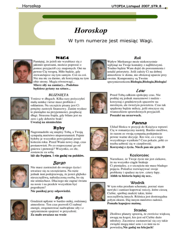 Horoskop UTOPIA,Listopad 2007,STR.8 Horoskop W tym numerze jest miesiąc Wagi. WAGA Rak Pamiętaj, że jeżeli nie wyrabiasz się z jakimiś sprawami, możesz poprosić o pomoc przyjaciół czy znajomych. Oni na pewno Cię wesprą. Miło będzie, gdy zrewanżujesz się tym samym. Coś za coś. Nie ma nic za darmo, ale korzystają na tym obie strony. Magia równowagi... Mierz siły na zamiary... Podobno będziesz pytany na sztuce... Wpływ Merkurego może niekorzystnie wpłynąć na Twoje kontakty z najbliższymi. Trudno będzie Wam dojść do porozumienia i ustalić priorytety. Jeśli zależy Ci na dobrej atmosferze w domu, nie obstawaj uparcie przy swoim. Kompromisy są Twoim sprzymierzeńcem.Biologia,Biologia,Biologia! BLIZNIĘTA Toniesz w długach. Kilka razy pożyczyłeś małą sumkę i teraz masz problem z oddaniem. Na szczęście pisany jest Ci potężny zastrzyk finansowy. Zanim wydasz te pieniądze na przyjemności, pospłacaj długi. Straszna frajda, gdy bilans jest na zero i gdy debetów brak! Uważaj na niemieckim Ryby Nagromadziło się między Tobą, a Twoją sympatią mnóstwo nieporozumień. Fajnie byłoby je wszystkie powyjaśniać przed końcem roku. Przed Wami nowy etap, czas postanowień. Po co rozpoczynać go od gniewu i pretensji? Wszystko, co złe, zostawcie za sobą. Idź Id do fryzjera. I nie gadaj na polskim. Baran Nie masz zastrzeżeń do swojego życia i uważasz się za szczęściarza. Na razie jednak inni podejrzewają, że jesteś głęboko nieszczęśliwą, nabzdyczoną osobą, bo się nie uśmiechasz. Dlaczego nie zagrać światu na nosie i na przekór wszystkim być pogodnym? Nie panikuj przy odpowiedzi. Byk Grudzień upłynie w bardzo miłej, rodzinnej atmosferze. Ten czas pozwoli Ci nabrać energii, zregenerować nadwątlone siły i z optymizmem spojrzeć w przyszłość. Za mało uważasz na wosie Lew Przed Tobą całkiem spokojny czas. Nie poddaj się jednak marazmowi i nudzie korzystaj z grudniowych spacerów na mroźnym, ale świeżym powietrzu. Czas tak spędzony będzie milszy, jeśli otoczysz się wianuszkiem sprawdzonych przyjaciół. Poszalej na przerwach. Panna Układ Słońca w pozycji do Księżyca wprawi Cię w romantyczny nastrój. Bardzo możliwe, że razem ze swoją sympatią podejmiecie pewne ważne decyzje. Kto wie, co z tego wszystkiego wyniknie? Czas pokaże, póki co trzeba uzbroić się w cierpliwość. Korzystaj z życia. Niech pan nie pyta :D Koziorożec Kozioro ec Narzekasz, że Twoje życie nie jest ciekawe, że na wszystko ciągle brakuje Ci pieniędzy, a o szczęściu nie masz bladego pojęcia. Potrafisz rozwiązywać swoje problemy i spadasz na tzw. cztery łapy. Ahhh ta historia lepiej się ucz.. Wodnik W tym roku przełam schematy, porzuć stare nawyki i zamiast kupować rzeczy, które cieszą Ciebie, spróbuj znaleźć takie, które uszczęśliwią innych. Różnica jest dostrzegalna gołym okiem. Daj innym mnóstwo radości. Pomału kapujesz matmę. Strzelec Złośliwe planety sprawią, że zwrócisz większą uwagę na kogoś, kto jest od Ciebie dużo młodszy. Zaczniesz zastanawiać się czy takie związki mogą mieć sens i co inni na to powiedzą.Nie gadaj na lekcjach!