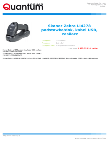 Quantum Qguar Sp. z o.o. ul. Walerego Sławka 3A Kraków Skaner Zebra LI4278 podstawka/dok, kabel USB, zasilacz Dostępność: 1-4 tygodnie Producent: Zebra EVM Dostępność [M2]: w magazynie niemieckim Cena netto: 1 505,52 PLN netto Skaner Zebra LI4278 podstawka, kabel USB, zasilacz PN: LI4278-PRBU2100AWR Skaner Zebra LI4278 podstawka, kabel USB, zasilacz PN: LI4278-PRBU2100AWR Skaner Zebra LI4278-SR20007WR, CBA-U21-S07ZAR kabel USB, CR0078-PC1F007WR dok/podstawka, PWRS-14000-148R zasilacz http://www.it-zakupy.pl wygenerowano przez program AptusShop