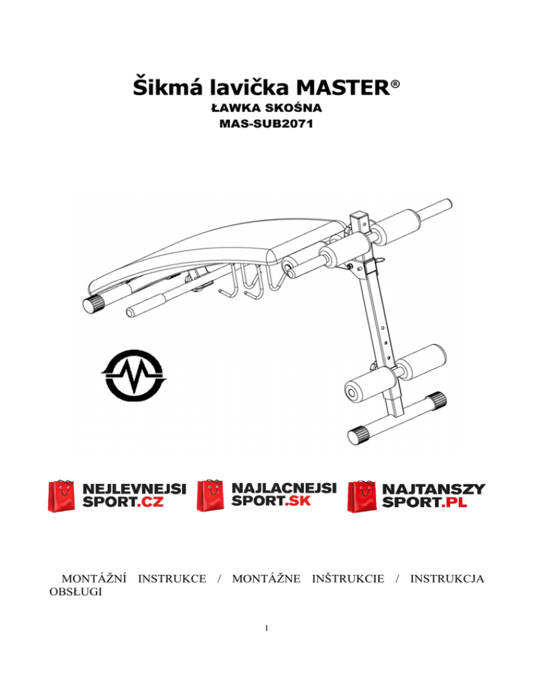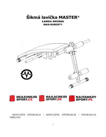 Šikmá lavička MASTER® ŁAWKA SKOŚNA MAS-SUB2071 MONTÁŽNÍ INSTRUKCE / MONTÁŽNE INŠTRUKCIE / INSTRUKCJA OBSŁUGI 1 CZ Děkujeme, že jste se rozhodli pro koupi našeho produktu. Ačkoliv vynakládáme velké úsilí k zajištění kvality každého našeho výrobku, ojediněle se mohou vyskytnout chybějící nebo vadné díly. V případě objevení jakýchkoliv závad na stroji či zaznamenáte-li chybějící části stroje, kontaktujte nás za účelem jeho nahrazení. Tento stroj je určen výhradně pro domácí použití. Základní informace: - Tento stroj je určen pouze pro domácí použití. Stroj není určen pro komerční účely a vyšší výkonnostní zatížení. - Nesprávné používání (jako např. nadměrné cvičení, prudké pohyby bez rozcvičení, špatné nastavení), mohou poškodit vaše zdraví. - Před začátkem cvičení, konzultujte váš zdravotní stav – srdeční systém, krevní tlak, ortopedické problémy atd. se svým lékařem. - Výrobce není zodpovědný za jakékoliv zranění, škodu nebo selhání způsobené použitím tohoto výrobku či špatným sestavením a údržbou stroje. Bezpečnostní informace: Abyste zamezili úrazu či poškození stroje dodržujte následující pravidla: maximální nosnost stroje je 100 kg stroj je zařazen do třídy HC a není vhodný pro terapeutické cvičení stroj se nesmí používat v nevětraných místnostech vysoká teplota, vlhkost a voda nesmí přijít se strojem do styku před použitím si důkladně přečtěte návod na použití umístěte stroj na pevnou a rovnou plochu. Ujistěte se, že stojí pevně a bezpečně nechejte kolem stroje volnou plochu minimálně 2 metry na všechny strany nesprávné nebo nadměrné cvičení může vážně poškodit vaše zdraví ujistěte se, že páčky a další nastavovací mechanismy na kole nejsou v cestě při cvičení pravidelně kontrolujte všechny části. Pokud jsou poškozeny, stroj nepoužívejte a ihned poškozené části vyměňte nebo kontaktujte dodavatele pravidelně kontrolujte všechny šrouby a matice, zda jsou pořádně dotaženy nenechávejte děti a domácí zvířata bez dozoru na stroji či v blízkosti tento stroj není hračka uschovejte tento návod na použití pro případné objednání náhradních dílů v budoucnu Důležité: Vracejte zboží pouze v originálním balení, nebo balení, které je bezpečné pro přepravu a nemůže dojít k poškození stroje. SK Ďakujeme, že ste sa rozhodli pre kúpu nášho produktu. Vzhlľadom na to vynakladáme veľké úsilie k zaisteniu kvality každého našeho výrobku, ojedinele sa môžu vyskytnúť chybajuce alebo vadné diely. V prípade objavenia akýchkoľvek závad na stroji alebo zaznamenáte chýbajúcu časť stroja, kontaktujte nás za účelom jeho. Tento stroj je určený výhradne pre domáce použitie. Základné informácie: - Tento stroj je určený len pre domáce použitie. Stroj neni určený pre komerčné účely a vyššie výkonnostné zaľaženie. - Nesprávne používanie (ako napr. nadmerné cvičenie, prudké pohyby bez rozcvičení, nesprávne nastavenie), môžu poškodiť vaše zdravie. - Pred začiatkom cvičenia, konzultujte váš zdravotný stav – srdcový systém, krvný tlak, ortopedické problémy atď. so svojím lekarom. - Výrobca neni zodpovedný za akékoľvek zranenie, škodu alebo zlyhanie zpôsobené použitím tohoto výrobku či nesprávnym zostavením a údržbou stroja. Bezpečnostné informácie: Abyste zamedzili úrazu či poškodeniu stroja dodržujte následujúce pravidlá: maximálna nosnosť stroja je 100 kg stroj je zaradený do triedy HC a neni vhodný pre terapeutické cvičenia stroj sa nesmie používať v nevetraných miestnostiach vysoká teplota, vlhkosť a voda nesmú prísť so strojom do styku pred použitím si dôkladne prečítajte návod na použitie umiestnite stroj na pevnú a rovnú plochu. Uistite sa, že stojí pevne a bezpečne nechajte okolo stroja volnú plochu minimálne 2 metre na všetky strany nesprávne alebo nadmerné cvičenie môže vážne poškodiť vaše zdravie uistite sa, že páčky a dalšie nastavovacie mechanismy neprekážajú v ceste pri cvičení pravidelne kontrolujte všetky časti. Ak sú poškodené, stroj nepoužívajte a ihneď poškodené časti vymeňte alebo kontaktujte 2 dodávatela pravidelne kontrolujte všetky skrutky a matice, či sú poriadne dotiahnuté nenechávajte deti a domáce zvieratá bez dozoru na stroji či v blízkosti tento stroj neni hračka uschovajte tento návod na použitie pre prípadné objednanie náhradných dielov v budúcnosti Dôležité: Vracajte tovar len v originálnom balení, alebo balení, ktoré je bezpečné pre prepravu a nemôže dôjsť k poškodeniu stroja. PL Dziękujemy za zakupienie naszego produktu. Z naszej strony dokładamy wszelkich starań, aby oferowane Państwu produkty miały najwyższą jakość. Mimo naszych starań, może się jednak zdarzyć, że napotkacie Państwo na drobne usterki, jeżeli tak się stanie, prosimy o kontakt (również w sytuacji zauważenia braku którejś z części). Urządzenie to jest przeznaczone wyłącznie do użytku domowego. Podstawowe informacje: - Urządzenie to jest przeznaczone wyłącznie do użytku domowego. Nie jest przeznaczone do fitness klubów czy do innego użytku komercyjnego. - Nieprawidłowe używanie (np. zbyt częste ćwiczenie, gwałtowne ruchy bez rozgrzewki, złe ustawienie) może prowadzić do kontuzji. - Przed rozpoczęciem ćwiczeń należy skonsultować się z lekarzem w kwestii: ciśnienia krwi, problemów ortopedycznych, stanu serca itd. - Producent nie ponosi odpowiedzialności za jakiekolwiek kontuzje lub uszkodzenia, które powstaną w wyniku używania tego produktu lub w wyniku jego niewłaściwego złożenia czy konserwacji. Informacje dotyczące bezpieczeństwa: Aby zapobiec kontuzji lub uszkodzeniu urządzenia należy postępować 