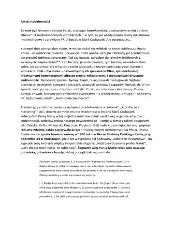 Artyści codzienności To miał być felieton o chrzcie Polski, o Księdze henrykowskiej, o pierwszym w niej polskim zdaniu*. O średniowiecznych kronikarzach. I o tym, że już wtedy pisano teksty reklamowo-marketingowe i uprawiano PR. A będzie o Marii Czubaszek. Ale od początku… Któregoś dnia pomyślałam sobie, że warto oddać się refleksji na temat jubileuszu chrztu Polski – w kontekście reklamy, oczywiście. Data ważna i okrągła. Obchody już przebrzmiałe, ale przecież jubileusz całoroczny. Tak czy inaczej, zajrzałam do tekstów źródłowych z wczesnych dziejów Polski**. I im bardziej je analizowałam, tym bardziej uświadamiałam sobie, jak ogromną rolę w kształtowaniu wizerunku rzeczywistości odgrywali ówcześni kronikarze. Dziś – być może – nazwalibyśmy ich specami od PR-u, spin doktorami, kreatywnymi komentatorami albo po prostu: tekściarzami. I niewątpliwie: artystami codzienności. Rymowali, śpiewali hymny, bajali, relacjonowali, fantazjowali. Wplatali pierwiastki osobistych sympatii i antypatii, własnych talentów i zapędów literackich. W ten sposób tworzyły się zapisy dziejów – nie tylko Polski, ale i dworów całej Europy. Duma, potęga, chwała, bitewny pył i chwalebne zwycięstwa – z jednej strony, z drugiej – nadworny PR, baśniowość, mrok i „średniowieczny horror”. A zatem gdy snułam rozważania na temat „średniowiecze a reklama”, „kronikarze a marketing” (sic!), dotarła do mnie smutna wiadomość o śmierci Marii Czubaszek. I zobaczyłam Panią Marię w tej plejadzie mistrzów sztuki użytkowej, w gronie artystów codzienności, twórców tekstu naszego powszechnego – ramię w ramię z takimi postaciami jak: Osiecka, Kofta, Młynarski, Kreczmar, Przybora. Dziś mało kto pamięta, że i ona, poprzez reklamę właśnie, także zapisywała dzieje – między innymi siermiężnych lat PRL-u. Maria Czubaszek zaczynała bowiem karierę w 1960 roku w Biurze Reklamy Polskiego Radia, przy Kopernika 34 w Warszawie, gdzie raz w tygodniu był nadawany „Kabarecik Reklamowy”. Na jego potrzeby tworzyła między innymi takie slogany: „Najlepsza do prania pralka Frania”, „Jeśli chcesz mieć motor, to sobie kup”. Żegnamy więc Panią Marię także jako naszego człowieka, człowieka z branży, której początki tak wspominała: Zaczęłam wtedy pracować (…) w radiowym "Kabareciku Reklamowym". Dziś dział reklamy to całkiem poważna rzecz, ale w tamtych czasach reklamowanie czegokolwiek było jakimś absurdem, bo przecież i tak nic nie można było kupić. Dlatego reklamą w radiu zajmowali się satyrycy. […] Kiedyś ktoś wymyślił, żeby zareklamować buty. To głupie. Bo przecież jak tylko buty pojawiały siew sklepach, to ludzie kupowali co popadło (…) Janusz Minkiewicz napisał O nowym to bucie piosenka na melodię O Nowej to Hucie piosenka. (…) Jak jakiś państwowy potentat rybny zamówił reklamę makreli, Jeremi Przybora (…) na melodię Ta ostatnia niedziela napisał Ta ostatnia makrela*** Pani Mario, „reklamą (…) zajmowali się satyrycy”, a w średniowieczu także – kronikarze… – żeby już nawiązać do swojej pierwotnej koncepcji, jednak jakoś łączącej ludzi pióra. *Dziękuję dwóm pierwszym recenzentom felietonu, dzięki którym czytelnicy uniknęli zderzenia z ciężką analizą aorystów: Wojtkowi Kowalczykowi z Biura Reklamy TVP i członkowi Salonu Językowego BR TVP – Piotrowi Buczkowi z Krosna. Grafików z kolei przepraszam za podwójną robotę – może poprzednia nie przepadnie. Jeśli chodzi NATOMIAST o pierwsze polskie zdanie Day, ut ia pobrusa, a ti poziwai, warto wiedzieć, że w 2015 roku zostało wpisane na listę „Pamięć Świata” UNESCO. **Gorąco polecam bardzo ciekawą i barwną lekturę: Anonim tzw. Gall Kronika polska, Ossolineum 1999; Paweł Jasienica Trzej kronikarze, Warszawa 1992. ***Obficie na ten temat w: Maria Czubaszek Dzień dobry, jestem z kobry, czyli jak stracić przyjaciół w pół minuty i inne antyporady, Warszawa 2015; Maria Czubaszek w rozmowie z Arturem Andrusem Każdy szczyt ma swój Czubaszek, Warszawa 2011. PS W imieniu wszystkich artystów codzienności i niecodzienności zapraszam do oglądania już zaraz: 53. Krajowego Festiwalu Piosenki Polskiej Opole 2016, a w nim także: Filharmonii dowcipu. Na stałe NATOMIAST polecam Kabaretową Scenę Dwójki – teraz w wymiarze bardziej aktorskim, poetyckim, artystycznym. Tam między innymi warta obejrzenia bliska mojemu sercu: Śląska Akademia Językowa Kabaretu Młodych Panów, która prowadzi „Ślązisz is easy” – kurs podstawowy. Do zobaczenia na: http://vod.tvp.pl/ Wasza dk Warszawa, 1 czerwca 2016