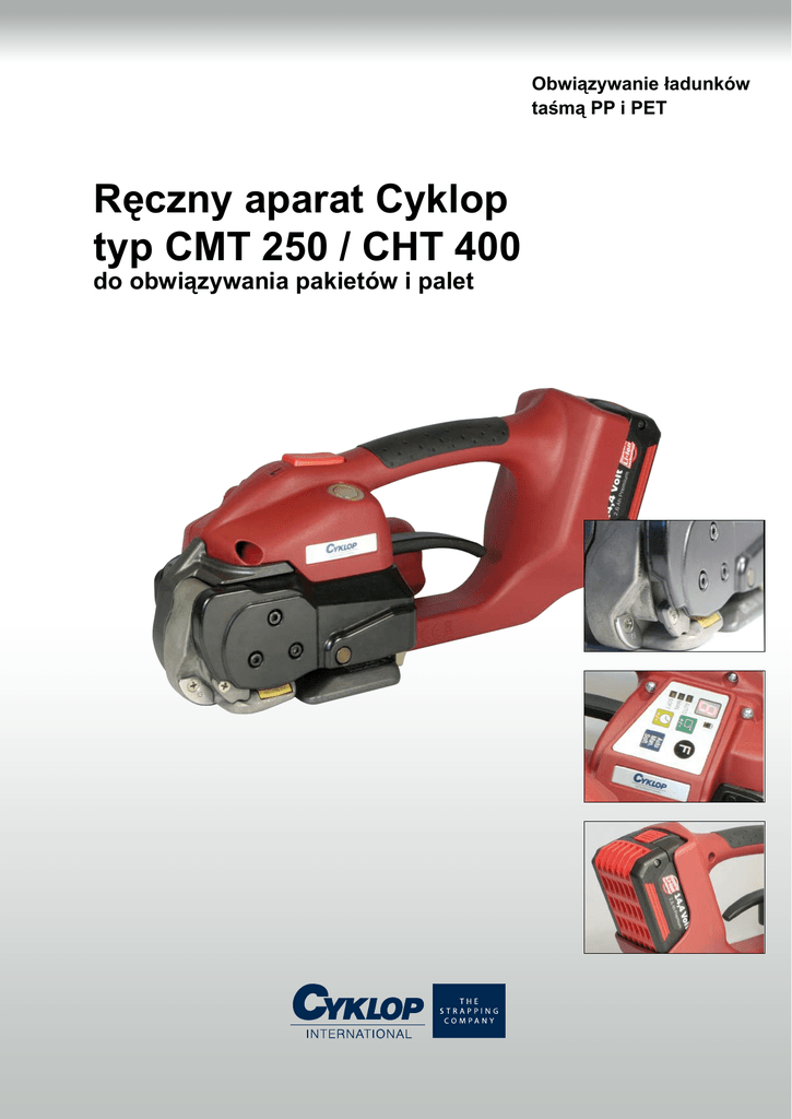 Obwiązywanie ładunków taśmą PP i PET Ręczny aparat Cyklop typ CMT 250 / CHT 400 do obwiązywania pakietów i palet Ręczny aparat do bandowania Cyklop typ CMT 250 / CHT 400 prosta obsługa i wzorowa ergonomia przyciski funkcyjne oraz dotykowy panel sterujący powodują, że obsługa jest banalnie prosta. Mała waga urządzenia oraz możliwość obsługi wiązarki przy pomocy jednej ręki decydują o najwyższym dostępnym komforcie w tej klasie urządzeń. Przycisk napinania taśmy pozwala na pracę w trybie automatycznym oraz dowolne “dociąganie” taśmy. Urządzenia mogą pracować również w trybie ręcznym (o momencie zgrzewania decyduje operator). solidna konstrukcja plastikowa obudowa wykonana jest z tworzyw najwyżsej jakości, które gwarantują dużą sztywność i wytrzymałość konstrukcji. Urządzenie posiada wile elemntów metalowych, które skutecznie chronią urzadzenie przy przypadkowych uderzeniach o ładunek lub upadkach na posadzkę. Są to aparaty najbardziej odporne na uszkodzenia mechaniczne, ze wszystkich urządzeń dostępnych na rynku. uniwersalność symboliczne i kolorowe przyciski ułatwiają regulację podstawowych parametrów pracy urządzenia (siła naciągu, czas zgrzewania, zakres napięcia taśmy). Dodatkowo na panelu znajduje się wskaźnik, który pokazuje stopień naładowania akumulatora. Ułatwia to pracę operatorowi. Dzięki tym regulacjom aparat można dostosować do pracy z różnymi taśmami i do zabezpieczania różnnych ładunków. Jako wyposażenie opcjonalne można zamówić specjalną osłonę chroniąca panel w trudnych warunkach pracy np. w fabryce kostki brukowej. Ładowarka, akumulatory markowy producent Bosch gwarantuje długą żywotność źródła zasilania. Akumulatory LiJon to nowa technologia zapewniająca całkowity brak efektu pamięci, a więc i wielokrotnie dłuższy okres eksploatacji niż przy tradycyjnych rozwiązaniach, stosowanych do tej pory. Ponadto posiadają krótszy czas ładowania 15 - 30 min. oraz umożliwiają większa liczbę wiązań, do 350 zasilanie ładowarki: akumulator: Dane techniczne CMT / CHT waga: szerokość taśmy: siła naciągu taśmy: sposób łączenia: funkcje: 220 V, 50 Hz 14,4 / 18,0 V, 2,6 Ah Wyposażenie dodatkowe: 3,9 kg 4,2 kg 13 - 16 mm 16 - 19 mm do 2.500 N do 4.000 N zgrzew tarciowy napinanie łączenie odcinanie TEZAURUS Piotr Jekimenko Pl.Oddziałów Młodzieży Powstańczej 2 40–061 Katowice tel./fax. 0048 32 2519700