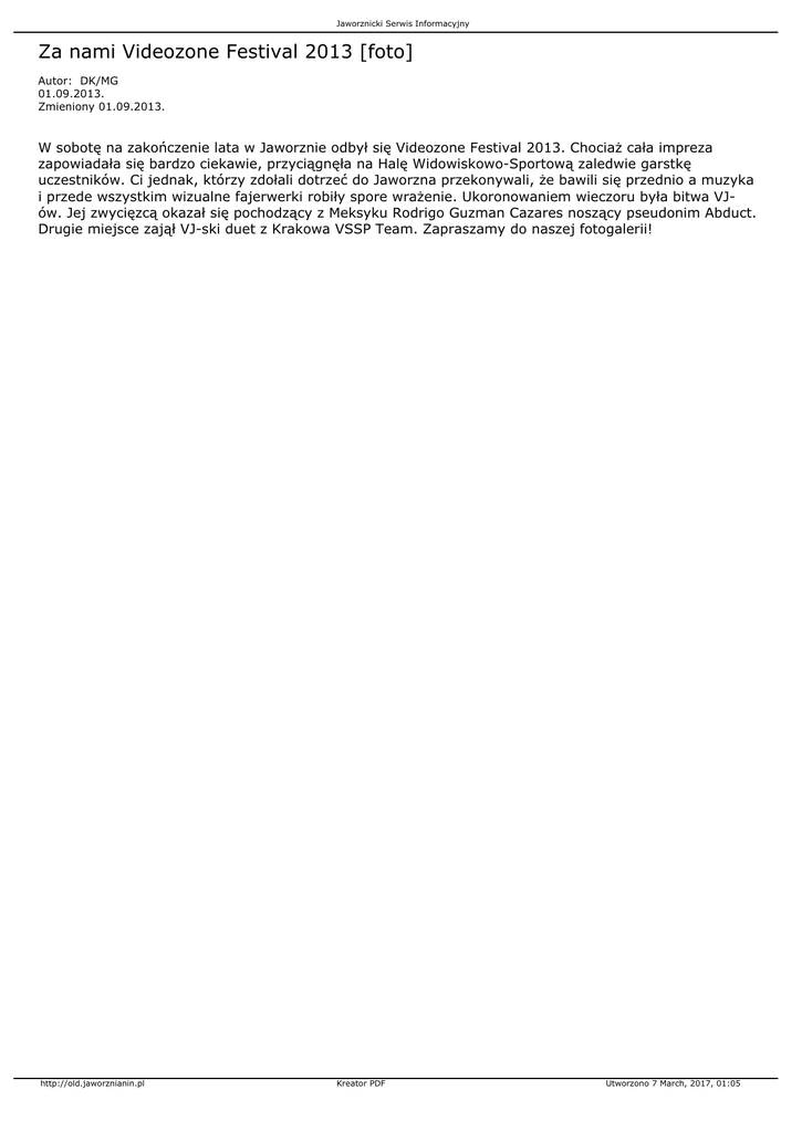 Jaworznicki Serwis Informacyjny Za nami Videozone Festival 2013 [foto] Autor: DK/MG 01.09.2013. Zmieniony 01.09.2013. W sobotę na zakończenie lata w Jaworznie odbył się Videozone Festival 2013. Chociaż cała impreza zapowiadała się bardzo ciekawie, przyciągnęła na Halę Widowiskowo-Sportową zaledwie garstkę uczestników. Ci jednak, którzy zdołali dotrzeć do Jaworzna przekonywali, że bawili się przednio a muzyka i przede wszystkim wizualne fajerwerki robiły spore wrażenie. Ukoronowaniem wieczoru była bitwa VJów. Jej zwycięzcą okazał się pochodzący z Meksyku Rodrigo Guzman Cazares noszący pseudonim Abduct. Drugie miejsce zajął VJ-ski duet z Krakowa VSSP Team. Zapraszamy do naszej fotogalerii! http://old.jaworznianin.pl Kreator PDF Utworzono 7 March, 2017, 01:05