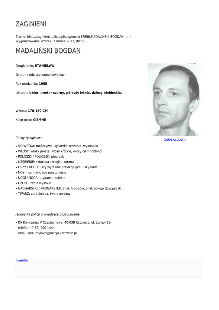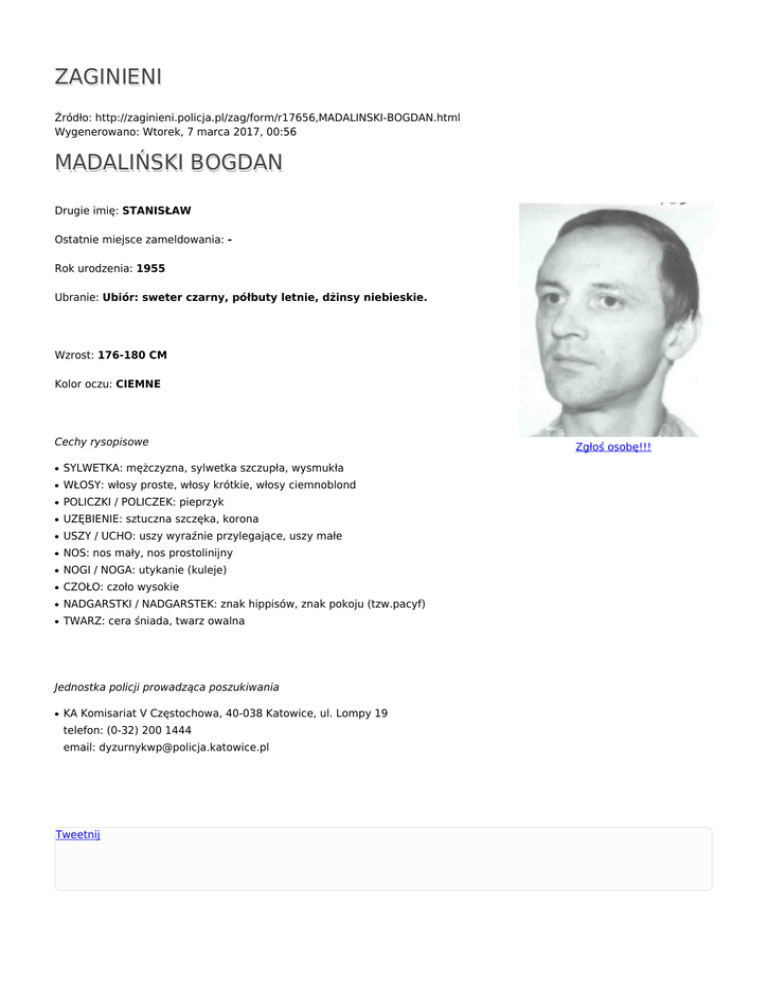 ZAGINIENI Źródło: http://zaginieni.policja.pl/zag/form/r17656,MADALINSKI-BOGDAN.html Wygenerowano: Wtorek, 7 marca 2017, 00:56 MADALIŃSKI BOGDAN Drugie imię: STANISŁAW Ostatnie miejsce zameldowania: Rok urodzenia: 1955 Ubranie: Ubiór: sweter czarny, półbuty letnie, dżinsy niebieskie. Wzrost: 176-180 CM Kolor oczu: CIEMNE Cechy rysopisowe ● SYLWETKA: mężczyzna, sylwetka szczupła, wysmukła ● WŁOSY: włosy proste, włosy krótkie, włosy ciemnoblond ● POLICZKI / POLICZEK: pieprzyk ● UZĘBIENIE: sztuczna szczęka, korona ● USZY / UCHO: uszy wyraźnie przylegające, uszy małe ● NOS: nos mały, nos prostolinijny ● NOGI / NOGA: utykanie (kuleje) ● CZOŁO: czoło wysokie ● NADGARSTKI / NADGARSTEK: znak hippisów, znak pokoju (tzw.pacyf) ● TWARZ: cera śniada, twarz owalna Jednostka policji prowadząca poszukiwania ● KA Komisariat V Częstochowa, 40-038 Katowice, ul. Lompy 19 telefon: (0-32) 200 1444 email: [email protected] Tweetnij Zgłoś osobę!!!
