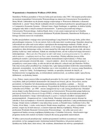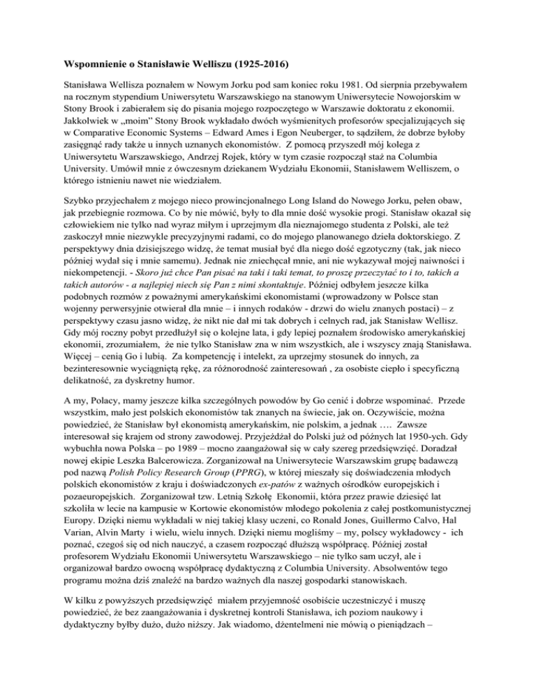 Wspomnienie o Stanisławie Welliszu (1925-2016) Stanisława Wellisza poznałem w Nowym Jorku pod sam koniec roku 1981. Od sierpnia przebywałem na rocznym stypendium Uniwersytetu Warszawskiego na stanowym Uniwersytecie Nowojorskim w Stony Brook i zabierałem się do pisania mojego rozpoczętego w Warszawie doktoratu z ekonomii. Jakkolwiek w „moim” Stony Brook wykładało dwóch wyśmienitych profesorów specjalizujących się w Comparative Economic Systems – Edward Ames i Egon Neuberger, to sądziłem, że dobrze byłoby zasięgnąć rady także u innych uznanych ekonomistów. Z pomocą przyszedł mój kolega z Uniwersytetu Warszawskiego, Andrzej Rojek, który w tym czasie rozpoczął staż na Columbia University. Umówił mnie z ówczesnym dziekanem Wydziału Ekonomii, Stanisławem Welliszem, o którego istnieniu nawet nie wiedziałem. Szybko przyjechałem z mojego nieco prowincjonalnego Long Island do Nowego Jorku, pełen obaw, jak przebiegnie rozmowa. Co by nie mówić, były to dla mnie dość wysokie progi. Stanisław okazał się człowiekiem nie tylko nad wyraz miłym i uprzejmym dla nieznajomego studenta z Polski, ale też zaskoczył mnie niezwykle precyzyjnymi radami, co do mojego planowanego dzieła doktorskiego. Z perspektywy dnia dzisiejszego widzę, że temat musiał być dla niego dość egzotyczny (tak, jak nieco później wydał się i mnie samemu). Jednak nie zniechęcał mnie, ani nie wykazywał mojej naiwności i niekompetencji. - Skoro już chce Pan pisać na taki i taki temat, to proszę przeczytać to i to, takich a takich autorów - a najlepiej niech się Pan z nimi skontaktuje. Później odbyłem jeszcze kilka podobnych rozmów z poważnymi amerykańskimi ekonomistami (wprowadzony w Polsce stan wojenny perwersyjnie otwierał dla mnie – i innych rodaków - drzwi do wielu znanych postaci) – z perspektywy czasu jasno widzę, że nikt nie dał mi tak dobrych i celnych rad, jak Stanisław Wellisz. Gdy mój roczny pobyt przedłużył się o kolejne lata, i gdy lepiej poznałem środowisko amerykańskiej ekonomii, zrozumiałem, że nie tylko Stanisław zna w nim wszystkich, ale i wszyscy znają Stanisława. Więcej – cenią Go i lubią. Za kompetencję i intelekt, za uprzejmy stosunek do innych, za bezinteresownie wyciągniętą rękę, za różnorodność zainteresowań , za osobiste ciepło i specyficzną delikatność, za dyskretny humor. A my, Polacy, mamy jeszcze kilka szczególnych powodów by Go cenić i dobrze wspominać. Przede wszystkim, mało jest polskich ekonomistów tak znanych na świecie, jak on. Oczywiście, można powiedzieć, że Stanisław był ekonomistą amerykańskim, nie polskim, a jednak …. Zawsze interesował się krajem od strony zawodowej. Przyjeżdżał do Polski już od późnych lat 1950-ych. Gdy wybuchła nowa Polska – po 1989 – mocno zaangażował się w cały szereg przedsięwzięć. Doradzał nowej ekipie Leszka Balcerowicza. Zorganizował na Uniwersytecie Warszawskim grupę badawczą pod nazwą Polish Policy Research Group (PPRG), w której mieszały się doświadczenia młodych polskich ekonomistów z kraju i doświadczonych ex-patów z ważnych ośrodków europejskich i pozaeuropejskich. Zorganizował tzw. Letnią Szkołę Ekonomii, która przez prawie dziesięć lat szkoliła w lecie na kampusie w Kortowie ekonomistów młodego pokolenia z całej postkomunistycznej Europy. Dzięki niemu wykładali w niej takiej klasy uczeni, co Ronald Jones, Guillermo Calvo, Hal Varian, Alvin Marty i wielu, wielu innych. Dzięki niemu mogliśmy – my, polscy wykładowcy - ich poznać, czegoś się od nich nauczyć, a czasem rozpocząć dłuższą współpracę. Później został profesorem Wydziału Ekonomii Uniwersytetu Warszawskiego – nie tylko sam uczył, ale i organizował bardzo owocną współpracę dydaktyczną z Columbia University. Absolwentów tego programu można dziś znaleźć na bardzo ważnych dla naszej gospodarki stanowiskach. W kilku z powyższych przedsięwzięć miałem przyjemność osobiście uczestniczyć i muszę powiedzieć, że bez zaangażowania i dyskretnej kontroli Stanisława, ich poziom naukowy i dydaktyczny byłby dużo, dużo niższy. Jak wiadomo, dżentelmeni nie mówią o pieniądzach – powiedzmy więc o nich my, bo Stanisław by tego nie zrobił: bez jego zabiegów o pozyskanie dużych zagranicznych sponsorów, tych przedsięwzięć by w ogóle nie było. Chciał i umiał rozmawiać z potencjalnymi sponsorami – i wiedział z kim rozmawiać. A gdy pieniądze już były, potrafił namówić dobrych zachodnich ekonomistów, by zechcieli je wziąć i przyjechać na kilka tygodni do Polski. Płacił nam też prawdziwymi dolarami za nasze wczesne i radosne opracowania naukowe, co w chudych latach początków transformacji nie było bez znaczenia. Był takim jednoosobowym KBN-em i NCRem: bez zbędnej biurokracji, acz ze ścisłą kontrolą jakości – bez taryfy ulgowej. Stanisław zawodowo zajmował się ekonomią międzynarodową i rozwojem gospodarczym. Na Columbii blisko współpracował z Ronaldem Findlayem, Jagdishem Bhagwatim, Padmą Desai, Guillermo Calvo, Robertem Mundellem. Równocześnie był bardzo solidnym mikroekonomistą i często prowadził zaawansowane wykłady z tej dziedziny. Wiele czasu spędził w krajach rozwijających się. Ta różnorodność zainteresowań i doświadczeń dawała mu unikalną zdolność dostrzegania rzeczy kluczowych dla sukcesu polskiej gospodarki po roku 1989. Rozumiał fundamentalną rolę rynku i konieczność ograniczonej ingerencji państwa w gospodarkę. To Go w naturalny sposób przyciągnęło do naszego Towarzystwa (Ekonomistów Polskich) – akcentującego te właśnie zasady i wartości. Te same wartości, którymi kierowali się jego przodkowie, aktywnie zaangażowani w gospodarczy rozwój Polski – pod zaborami, a potem w wolej Polsce dwudziestolecia międzywojennego. Jego dziad – Wilhelm Wellisch (1853-1911) i jego ojciec – Leopold We