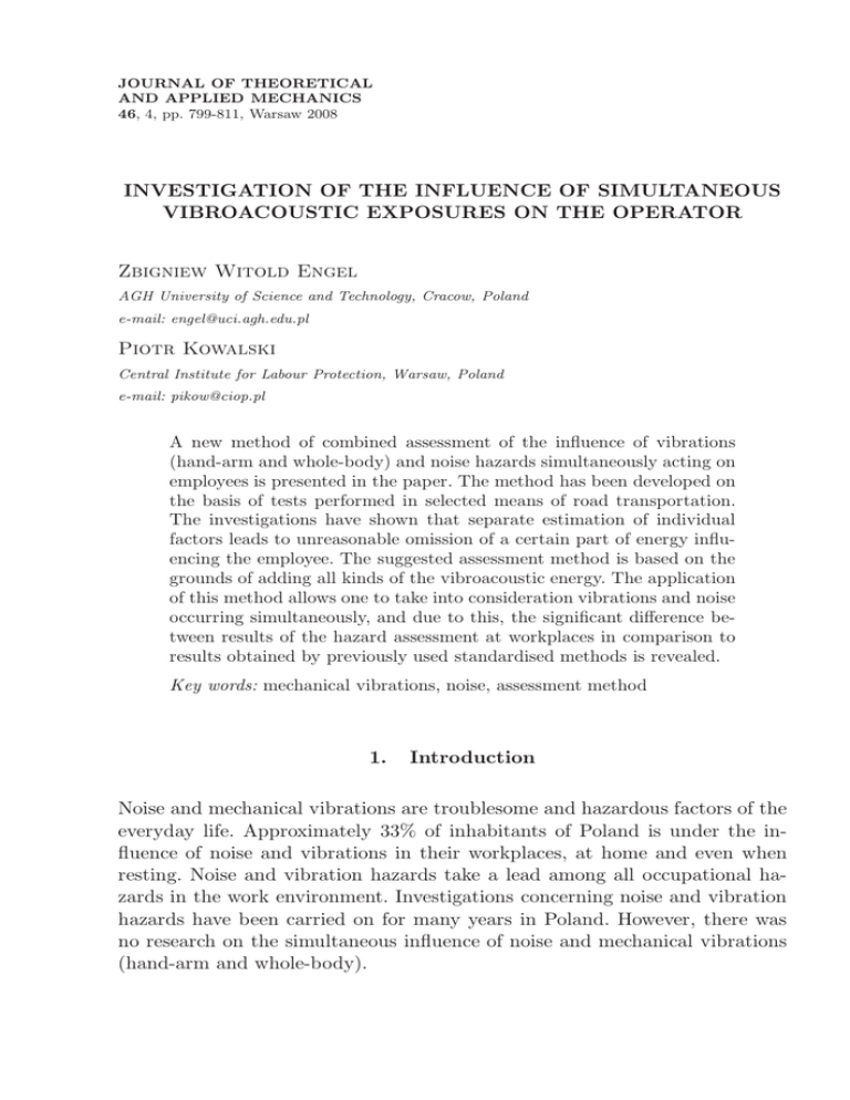 JOURNAL OF THEORETICAL AND APPLIED MECHANICS 46, 4, pp. 799-811, Warsaw 2008 INVESTIGATION OF THE INFLUENCE OF SIMULTANEOUS VIBROACOUSTIC EXPOSURES ON THE OPERATOR Zbigniew Witold Engel AGH University of Science and Technology, Cracow, Poland e-mail: [email protected] Piotr Kowalski Central Institute for Labour Protection, Warsaw, Poland e-mail: [email protected] A new method of combined assessment of the influence of vibrations (hand-arm and whole-body) and noise hazards simultaneously acting on employees is presented in the paper. The method has been developed on the basis of tests performed in selected means of road transportation. The investigations have shown that separate estimation of individual factors leads to unreasonable omission of a certain part of energy influencing the employee. The suggested assessment method is based on the grounds of adding all kinds of the vibroacoustic energy. The application of this method allows one to take into consideration vibrations and noise occurring simultaneously, and due to this, the significant difference between results of the hazard assessment at workplaces in comparison to results obtained by previously used standardised methods is revealed. Key words: mechanical vibrations, noise, assessment method 1. Introduction Noise and mechanical vibrations are troublesome and hazardous factors of the everyday life. Approximately 33% of inhabitants of Poland is under the influence of noise and vibrations in their workplaces, at home and even when resting. Noise and vibration hazards take a lead among all occupational hazards in the work environment. Investigations concerning noise and vibration hazards have been carried on for many years in Poland. However, there was no research on the simultaneous influence of noise and mechanical vibrations (hand-arm and whole-body). Z.W. Engel, P. Kowalski 800 The paper presents a method of simultaneous assessment of hand-arm and whole-body vibration hazards as well as noise hazard. The proposed method is based on appropriate additions of vibration and noise doses. Practical verifications were performed on the example of workplaces of drivers. Presently, any assessment of vibration and noise hazards of workers is being done on the basis of methods included in current standards. Methods of measuring and assessing given there assume a separate treatment of handarm and whole-body vibrations and noise. The basic parameters used for the assessment of such hazards are: • Daily exposure to hand-arm vibration: A(8), • Daily exposure to whole-body vibrations: A(8) = max{Ax (8), Ay (8), Az (8)}, • Level of daily noise exposures LEX,8h . Exposures to hand-arm and whole-body vibrations are determined on the basis of measured corrected accelerations of vibrations, while noise exposure levels on the basis of measured acoustic pressure. Taking into account the exposure only to one vibroacoustic factor, in the situation when all those hazards occur, means disregarding the part of energy (vibration or noise dose), which can additionally cause unfavourable health effects in the worker’s organism. Regardless of differences in influencing the human organism by hand-arm and whole-body vibrations and by noises, the estimation of combined exposures to those factors is possible due to appropriate summing of the vibroacoustic energy. Undertaking this problem was additionally prompted by the European Union Directives considering the minimum requirements in health protection and safety of employees endangered by physical factors (vibration and noise). 2. Assessment of the simultaneous exposure The operator during his work is very often endangered by simultaneous influence of hand-arm and whole-body vibrations and noise, i.e. by vibroacoustic factors. Each of these effects is a source of partial energy. Thus, the total vibroacoustic energy transferred into the human organism is the sum of the corresponding partial energies EW A = k X j=1 Ej (2.1) Investigation of the influence of simultaneous... 801 where Ej is the partial energy. Equation (2.1) was used for development of the method of combined assessment of hazards caused by local and general vibrations and noise. It is assumed that the vibroacoustic energy influencing the worker EW A is proportional to the total dose D of vibration and noise EW A ∼ D (2.2) The total dose D is a function of individual partial doses of vibrations and noise determined according to standards [13] D = F (DO , DM , DH ) (2.3) where DO – dose of whole-body vibration DM – dose of hand-arm vibration DH – noise dose. The partial doses DO , DM , DH depend on the frequency f and on the exposure time. These parameters are determined by the following expressions DO = n X a2Oi tOi (2.4) i=1 q where aOi is determined from aOi = (1.4awOxi )2 + (1.4awOyi )2 + a2wOzi and tOi is the action time of partial vibration accelerations awOxi , awOyi , awOzi , s DM = n X a2Mi tMi (2.5) i=1 q where aMi = a2wM xi + a2wM yi + a2wM zi and tMi is the action time of partial vibration accelerations awM xi , awM yi , awM zi , s. The noise exposure is a value characterising the noise dose [13] EA = 1.15 · 10−5 · 100.1LEX,8h (2.6) where LEX,8h denotes the level of daily noise exposure. The general dependence used in the proposed method of the assessment of vibration and noise acting simultaneously is in the form of a sum of doses corrected by appropriate coefficients A, B, C D = ADO + BDM + CDH (2.7) Z.W. Engel, P. Kowalski 802 Due to the lack of permissible values for the combined assessment of vibroacoustic factors, it has been additionally assumed that taking into account the weighting filters Wh , Wd , Wk , A as well as permissible values given in current regulations will be possible in the proposed method. The permissible values for individual factors are introduced into Equation (2.6) in form of coefficients A, B, C. They are presented below together with values of the corresponding coefficients m s2 m = 2.8 2 s A