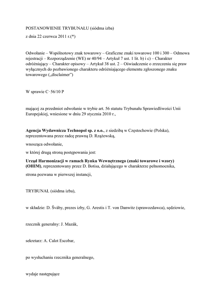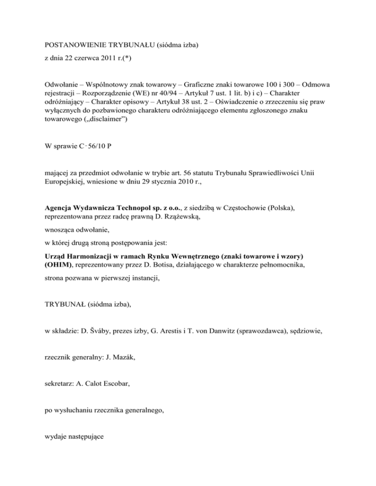 POSTANOWIENIE TRYBUNAŁU (siódma izba) z dnia 22 czerwca 2011 r.(*) Odwołanie – Wspólnotowy znak towarowy – Graficzne znaki towarowe 100 i 300 – Odmowa rejestracji – Rozporządzenie (WE) nr 40/94 – Artykuł 7 ust. 1 lit. b) i c) – Charakter odróżniający – Charakter opisowy – Artykuł 38 ust. 2 – Oświadczenie o zrzeczeniu się praw wyłącznych do pozbawionego charakteru odróżniającego elementu zgłoszonego znaku towarowego („disclaimer”) W sprawie C‑56/10 P mającej za przedmiot odwołanie w trybie art. 56 statutu Trybunału Sprawiedliwości Unii Europejskiej, wniesione w dniu 29 stycznia 2010 r., Agencja Wydawnicza Technopol sp. z o.o., z siedzibą w Częstochowie (Polska), reprezentowana przez radcę prawną D. Rzążewską, wnosząca odwołanie, w której drugą stroną postępowania jest: Urząd Harmonizacji w ramach Rynku Wewnętrznego (znaki towarowe i wzory) (OHIM), reprezentowany przez D. Botisa, działającego w charakterze pełnomocnika, strona pozwana w pierwszej instancji, TRYBUNAŁ (siódma izba), w składzie: D. Šváby, prezes izby, G. Arestis i T. von Danwitz (sprawozdawca), sędziowie, rzecznik generalny: J. Mazák, sekretarz: A. Calot Escobar, po wysłuchaniu rzecznika generalnego, wydaje następujące Postanowienie 1 W odwołaniu Agencja Wydawnicza Technopol sp. z o.o. (zwana dalej „Technopol”) wnosi o uchylenie wyroku Sądu Pierwszej Instancji Wspólnot Europejskich z dnia 19 listopada 2009 r. w sprawach połączonych T‑425/07 i T‑426/07 Agencja Wydawnicza Technopol przeciwko OHIM (100 i 300), Zb.Orz. s. II‑4275 (zwanego dalej „zaskarżonym wyrokiem”), na mocy którego Sąd oddalił wniesione przez nią skargi o stwierdzenie nieważności dwóch decyzji Czwartej Izby Odwoławczej Urzędu Harmonizacji w ramach Rynku Wewnętrznego (znaki towarowe i wzory) (OHIM) z dnia 3 września 2007 r. (sprawy R 1274/2006‑4 i R 1275/2006‑4) dotyczących rejestracji oznaczeń graficznych „100” i „300” jako wspólnotowych znaków towarowych (zwanych dalej wspólnie „spornymi decyzjami”). Ramy prawne 2 Artykuł 7 ust. 1 rozporządzenia Rady (WE) nr 40/94 z dnia 20 grudnia 1993 r. w sprawie wspólnotowego znaku towarowego (Dz.U. 1994, L 11, s. 1), zatytułowany „Bezwzględne podstawy odmowy rejestracji”, stanowił: „Nie są rejestrowane: […] b) znaki towarowe, które pozbawione są jakiegokolwiek odróżniającego charakteru; c) znaki towarowe, które składają się wyłącznie z oznaczeń lub wskazówek, mogących służyć w obrocie do oznaczania rodzaju, jakości, ilości, przeznaczenia, wartości, pochodzenia geograficznego lub czasu produkcji towaru lub świadczenia usługi, lub innych właściwości towarów lub usług; […]”. 3 Zgodnie z art. 12 rozporządzenia nr 40/94 zatytułowanym „Ograniczenie skutków wspólnotowego znaku towarowego”: „Wspólnotowy znak towarowy nie uprawnia właściciela do zakazania stronie [osobie] trzeciej używania w obrocie: […] b) oznaczeń dotyczących rodzaju, jakości, ilości, przeznaczenia, wartości, pochodzenia geograficznego, czasu produkcji towaru lub świadczenia usługi, lub też innych właściwości towarów lub usług; […] pod warunkiem że [osoba trzecia] używa ich zgodnie z uczciwymi praktykami w przemyśle i handlu”. 4 Artykuł 38 ust. 2 i 3 tego rozporządzenia, zatytułowany „Badanie bezwzględnych podstaw odmowy [rejestracji]”, stanowił: „2. W przypadku gdy znak towarowy zawiera element, który nie jest odróżniający, i jeżeli włączenie tego elementu do znaku towarowego może stwarzać wątpliwości co do zakresu ochrony znaku towarowego, Urząd może żądać jako warunku rejestracji znaku towarowego, aby zgłaszający oświadczył, że nie będzie rościł wyłącznego prawa do tego elementu. Każde zrzeczenie się jest publikowane, w zależności od przypadku, łącznie ze zgłoszeniem lub rejestracją wspólnotowego znaku towarowego. 3. Zgłoszenie nie może być odrzucone, zanim zgłaszający miał możliwość wycofania lub zmiany zgłoszenia lub przedstawienia swoich uwag”. 5 Artykuł 74 wspomnianego rozporządzenia, zatytułowany „Badanie przez Urząd stanu faktycznego z urzędu”, stanowił: „1. W trakcie postępowania Urząd bada stan faktyczny z urzędu; jednakże w postępowaniu odnoszącym się do względnych podstaw odmowy rejestracji Urząd ogranicza się w tym badaniu do stanu faktycznego, dowodów i argumentów przedstawionych przez strony oraz poszukiwanego zadośćuczynienia. 2. Urząd może nie wziąć pod uwagę stanu faktycznego lub dowodów, których zainteresowane strony nie przedstawiły w odpowiednim terminie”. 6 Rozporządzenie nr 40/94 zostało uchylone rozporządzeniem Rady (WE) nr 207/2009 z dnia 26 lutego 2009 r. w sprawie wspólnotowego znaku towarowego (Dz.U. L 78, s. 1), które weszło w życie w dniu 13 kwietnia 2009 r. Niemniej jednak z uwagi na datę zajścia okoliczności faktycznych niniejsze spory podlegają przepisom rozporządzenia nr 40/94. Okoliczności powstania sporu i zaskarżone decyzje 7 W dniu 15 czerwca 2004 r. Technopol zgłosiła w OHIM do rejestracji w charakterze wspólnotowego znaku towarowego dwa następujące oznaczenia graficzne: Image not found Image not found 8 Towary i usługi, dla których dokonano zgłoszenia znaków, należą do klas 16, 28 i 41 w rozumieniu Porozumienia nicejskiego dotyczącego międzynarodowej klasyfikacji towarów i usług dla celów rejestracji znaków z dnia 15 czerwca 1957 r., ze zmianami (zwanego dalej „porozumieniem nicejskim”), i odpowiadają, dla każdej z tych klas, następującemu opisowi: – klasa 16: „afisze; plakaty; albumy; broszury; czasopisma; blankiety; druki; gazety; kalendarze; krzyżówki; rebusy”; – klasa 28: „łamigłówki; zagadki; puzzle”; – klasa 41: „organizowanie konkursów; publikowanie tekstów”. 9 W dniu 9 sierpnia 2006 r. ekspert, uznawszy, że omawiane oznaczenia stanowiły wskazówki opis