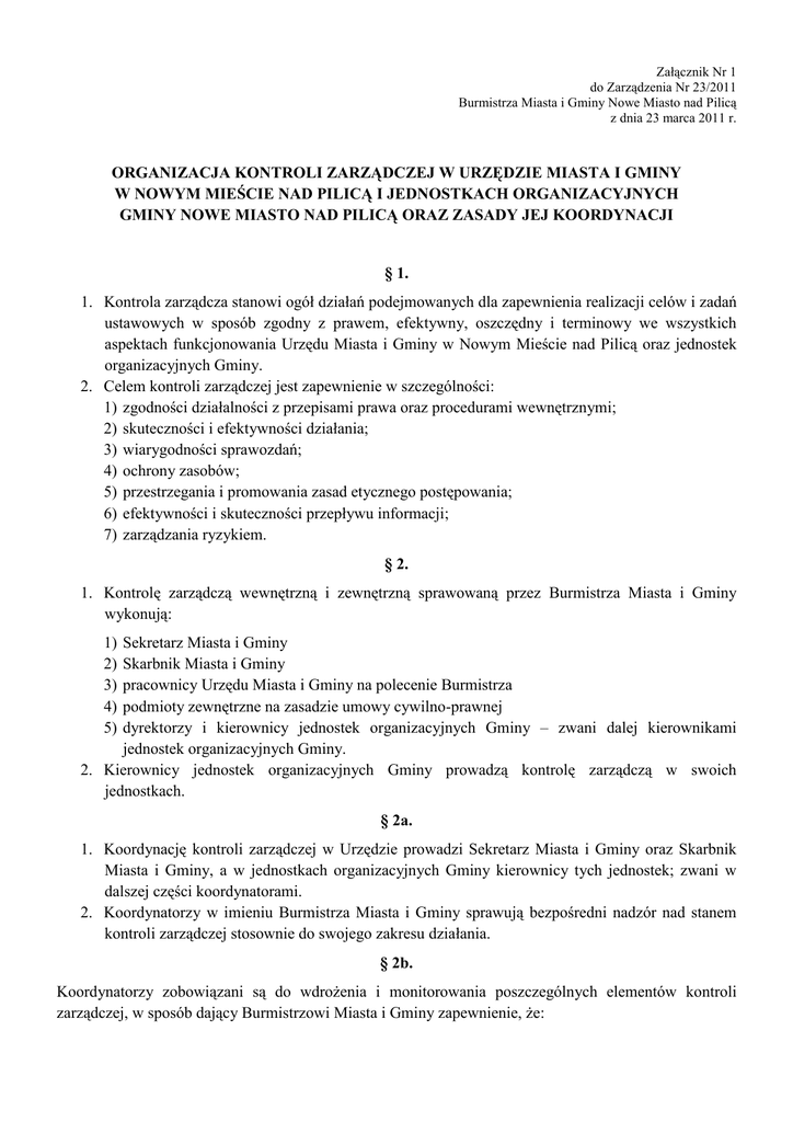 Załącznik Nr 1 do Zarządzenia Nr 23/2011 Burmistrza Miasta i Gminy Nowe Miasto nad Pilicą z dnia 23 marca 2011 r. ORGANIZACJA KONTROLI ZARZĄDCZEJ W URZĘDZIE MIASTA I GMINY W NOWYM MIEŚCIE NAD PILICĄ I JEDNOSTKACH ORGANIZACYJNYCH GMINY NOWE MIASTO NAD PILICĄ ORAZ ZASADY JEJ KOORDYNACJI § 1. 1. Kontrola zarządcza stanowi ogół działań podejmowanych dla zapewnienia realizacji celów i zadań ustawowych w sposób zgodny z prawem, efektywny, oszczędny i terminowy we wszystkich aspektach funkcjonowania Urzędu Miasta i Gminy w Nowym Mieście nad Pilicą oraz jednostek organizacyjnych Gminy. 2. Celem kontroli zarządczej jest zapewnienie w szczególności: 1) zgodności działalności z przepisami prawa oraz procedurami wewnętrznymi; 2) skuteczności i efektywności działania; 3) wiarygodności sprawozdań; 4) ochrony zasobów; 5) przestrzegania i promowania zasad etycznego postępowania; 6) efektywności i skuteczności przepływu informacji; 7) zarządzania ryzykiem. § 2. 1. Kontrolę zarządczą wewnętrzną i zewnętrzną sprawowaną przez Burmistrza Miasta i Gminy wykonują: 1) 2) 3) 4) 5) Sekretarz Miasta i Gminy Skarbnik Miasta i Gminy pracownicy Urzędu Miasta i Gminy na polecenie Burmistrza podmioty zewnętrzne na zasadzie umowy cywilno-prawnej dyrektorzy i kierownicy jednostek organizacyjnych Gminy – zwani dalej kierownikami jednostek organizacyjnych Gminy. 2. Kierownicy jednostek organizacyjnych Gminy prowadzą kontrolę zarządczą w swoich jednostkach. § 2a. 1. Koordynację kontroli zarządczej w Urzędzie prowadzi Sekretarz Miasta i Gminy oraz Skarbnik Miasta i Gminy, a w jednostkach organizacyjnych Gminy kierownicy tych jednostek; zwani w dalszej części koordynatorami. 2. Koordynatorzy w imieniu Burmistrza Miasta i Gminy sprawują bezpośredni nadzór nad stanem kontroli zarządczej stosownie do swojego zakresu działania. § 2b. Koordynatorzy zobowiązani są do wdrożenia i monitorowania poszczególnych elementów kontroli zarządczej, w sposób dający Burmistrzowi Miasta i Gminy zapewnienie, że: 1) działania podległych mu jednostek pozostają w zgodzie z przepisami prawa, zasadami przyjętymi w jednostkach (procedurami) oraz ze standardami, 2) zasoby są zużywane oszczędnie i w sposób przynoszący pożytek, a jakości usług nadano odpowiednią rangę, 3) plany, programy, zamierzenia i cele są osiągane, 4) dane i informacje publikowane lub udostępniane wewnętrznie, czy na zewnątrz są dokładne, wiarygodne i aktualne, 5) zasoby organizacyjne są dostatecznie zabezpieczone (nadzorowane), 6) ryzyka związane z realizacją zadań są na bieżąco identyfikowane i podejmowane są działania celem ich wyeliminowania lub ograniczenia skutków ich wystąpienia. § 3. Plan kontroli 1. W Urzędzie opracowywany jest roczny plan kontroli zarządczej Urzędu Miasta i Gminy w Nowym Mieście nad Pilicą oraz jednostek organizacyjnych Gminy, zawierający planowane czynności kontrolne. Plan kontroli przechowuje się w Referacie Organizacyjnym. Wzór planu stanowi załącznik nr 3 do zarządzenia. 2. Plan kontroli zatwierdzany jest przez Burmistrza Miasta i Gminy oraz wprowadzany zarządzeniem Burmistrza Miasta i Gminy. 3. Plan kontroli obejmuje podstawowy zakres kontroli. 4. Plan kontroli może być w każdym czasie zmieniony przez Burmistrza Miasta i Gminy poprzez dodanie innych, wynikających z bieżących potrzeb czynności. § 3a. 1. Kierownicy referatów Urzędu, Sekretarz Miasta i Gminy, Skarbnik Miasta i Gminy oraz kierownicy jednostek organizacyjnych Gminy do końca grudnia opracowują i przedstawiają Burmistrzowi plany kontroli zarządczej podległych im jednostek na następny rok kalendarzowy. Sekretarz Miasta i Gminy sporządza plan kontroli zarządczej, wymieniony w § 3, i przedstawia do zatwierdzenia Burmistrzowi Miasta i Gminy. 2. Plan kontroli zarządczej na 2011 rok zostanie wprowadzony zarządzeniem Burmistrza Miasta i Gminy do 15.04.2011 r. § 4. Program kontroli 1. Przed przystąpieniem do kontroli, pracownik lub pracownicy mający ją przeprowadzić opracowują program kontroli, który określa: 1) numer kontroli, 2) nazwę jednostki kontrolowanej, 3) temat kontroli, 4) cel i zadania kontroli, 5) okres objęty kontrolą, 6) podstawowe dokumenty podlegające kontroli, 7) planowany czas trwania kontroli, 8) osoby upoważnione do przeprowadzenia kontroli. Wzór programu kontroli stanowi załącznik nr 4 do zarządzenia. 2. Po opracowaniu programu kontroli, pracownicy przygotowują się do kontroli poprzez zapoznanie się z obowiązującymi przepisami prawnymi. § 5. Upoważnienie do przeprowadzenia kontroli 1. Dla wszczęcia czynności kontrolnych niezbędne jest imienne upoważnienie, wystawione przez Burmistrza Miasta i Gminy lub z jego upoważnienia. Wzór upoważnienia do przeprowadzenia kontroli stanowi załącznik nr 1. 2. Upoważnienia do przeprowadzenia kontroli, zgodnie z planem kontroli w danej jednostce organizacyjnej Gminy, podpisuje kierownik tej jednostki. 3. Każde upoważnienie powinno być wystawione w trzech egzemplarzach: jeden dla jednostki kontrolowanej, drugi załącza się do protokołu kontroli, trzeci ad acta. 4. Kontrolujący podlega przepisom o bezpieczeństwie i higienie pracy oraz przepisom o postępowaniu z wiadomościami zawierającymi informacje niejawne, obowiązującymi w jednostce kontrolowanej. § 6. Czynności kontrolne 1. Bezpośrednio przed przystąpieniem do czynności kontrolnych, kontrolujący przedkłada kierownikowi jednostki kontrolowanej upoważnienie do kontroli oraz informuje o przedmiocie kontroli i planowanym czasie jej trwania. 2. Czynności kontrolne przeprowadza się w godzinach pracy obowiązujących w jednostce kontrolowanej. W przypadku zaistnienia szczególnych okoliczności kontrola może być przeprowadzona poza godzinami pracy. 3. Kontroli bezpośredniej dokonuje się w obecności osoby odpowiedzialnej za kontrolowany odcinek lub dział pracy, a w razie jej nieobecności – w ob