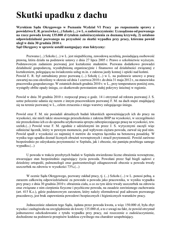 Skutki upadku z dachu Wyrokiem Sądu Okręgowego w Poznaniu Wydział VI Pracy po rozpoznaniu sprawy z powództwa E. R. przeciwko (...) Szkole (...) w L. o zadośćuczynienie: 1) zasądzono od pozwanego na rzecz powoda kwotę 135.000 zł tytułem zadośćuczynienia za doznaną krzywdę, 2) ustalono odpowiedzialność pozwanego na przyszłość za skutki wypadku przy pracy, któremu powód uległ w dniu 30 grudnia 2010 r. Sąd Okręgowy w sprawie ustalił następujący stan faktyczny: Pozwana (...) Szkoła (...) w L. jest niepubliczną, zawodową uczelnią, posiadającą osobowość prawną, która działa na podstawie ustawy z dnia 27 lipca 2005 r. Prawo o szkolnictwie wyższym. Podstawowym zadaniem pozwanej jest kształcenie studentów. Pozwana dodatkowo prowadzi działalność gospodarczą, wyodrębnioną organizacyjnie i finansowo od działalności związanej z kształceniem, polegającą na świadczeniu usług m.in. z zakresu jazdy konnej i opieki nad końmi. Powód E. R. był zatrudniony przez pozwaną (...) Szkołę (...) w L. na podstawie umowy o pracę zawartej na czas określony w okresie od dnia 1 czerwca 2010 r. do dnia 31 maja 2012 r., na stanowisku pracownika gospodarczego. W ostatnich dniach grudnia 2010 r. w L., przy temperaturze poniżej zera, wystąpiły obfite opady śniegu, co skutkowało powstaniem stałej pokrywy śnieżnej w regionie. Powód w dniu 30 grudnia 2010 r. rozpoczął pracę o godz. 14 i otrzymał od rektora pozwanej J. S. ustne polecenie udania się razem z innym pracownikiem pozwanej F. M. na dach stajni znajdującej się na terenie pozwanej w L., celem zrzucenia z niego warstwy zalegającego śniegu. Powód oraz F. M. nie posiadali aktualnych badań lekarskich upoważniających ich do pracy na wysokości, nie mieli także stosownego przeszkolenia z zakresu BHP na wysokości, w szczególności nie przeszkolono ich co do sposobu użytkowania sprzętu zabezpieczającego pracę na wysokości, tzw. szelek.(...) Powód wraz F. M. zgodnie z udzielonymi im przez J. S. wytycznymi zaczęli więc odśnieżać łącznik, który w pewnym momencie, pod wpływem ciężaru powoda, zarwał się pod nim. Powód spadł z wysokości co najmniej 6 metrów do wnętrza łącznika na betonową posadzkę. W wyniku tego upadku doznał licznych obrażeń wewnętrznych i stracił przytomność. Powód zarówno bezpośrednio po odzyskaniu przytomności w Szpitalu, jak i obecnie, nie pamięta przebiegu samego wypadku.(...) U powoda w trakcie przebytych badań w Szpitalu stwierdzono liczne obrażenia wewnętrzne, stwarzające stan bezpośrednio zagrażający życiu powoda. Powołani przez Sąd biegli sądowi z dziedziny ortopedii, pulmonologii oraz gastroenterologii zdiagnozowali obecnie u powoda trwały uszczerbek na zdrowiu w wysokości 73%.(...) W ocenie Sądu Okręgowego, pozwany zakład pracy, tj. (...) Szkoła (...) w L. ponosi pełną, a zarazem całkowitą odpowiedzialność za powstałe u powoda jako pracownika, w wyniku wypadku przy pracy z dnia 30 grudnia 2010 r. obrażenia ciała, a co za tym idzie trwały uszczerbek na zdrowiu oraz związane z nim cierpienia fizyczne i psychiczne powoda, na zasadzie zawinionego zachowania (art. 415 K.c.), gdzie podstawowym zarzutem, który należy sformułować pod adresem pozwanego pracodawcy, jest brak zapewnienia powodowi bezpiecznych i higienicznych warunków pracy. Jednocześnie zdaniem tego Sądu, żądana przez powoda kwota, a więc 150.000 zł, była zbyt wysoka i zasługiwała na uwzględnienie do kwoty 135.000 zł, a to z uwagi na fakt, że powód otrzymał jednorazowe odszkodowanie z tytułu wypadku przy pracy, zaś roszczenie o zadośćuczynienie, dochodzone na podstawie przepisów kodeksu cywilnego ma charakter uzupełniający. Od wyroku Sądu Okręgowego strona pozwana wniosła apelację, w której w całości zaskarżyła wyrok i zarzuciła. Jednakże apelacja strony pozwanej jest bezzasadna. Owa bezzasadność zachodzi – podkreśla Sad Apelacyjny w Poznaniu_ zarówno w płaszczyźnie kwestii ogólnej zasady odpowiedzialności jak i problematyki wysokości zasądzonej kwoty zadośćuczynienia.(...) Uzasadnione było żądanie powoda wypłaty zadośćuczynienia za doznaną krzywdę w związku z wypadkiem przy pracy. Słusznie Sąd Okręgowy wskazał, że w doktrynie i orzecznictwie zgodnie przyjmuje się, że zadośćuczynienie polega na przyznaniu pokrzywdzonemu odpowiedniej sumy pieniężnej, która ma mu zrekompensować szkodę niemajątkową tzw. krzywdę w postaci doznanych cierpień fizycznych i ujemnych przeżyć psychicznych z tym związanych. Zadośćuczynienie ma więc na celu przede wszystkim złagodzenie tych cierpień, uwidacznia się tym samym pierwszorzędna funkcja kompensacyjna tego świadczenia. (...) Jednakże przepisy kodeksu cywilnego nie zawierają żadnych kryteriów, jakie należy brać pod uwagę, ustalając wysokość należnego pokrzywdzonemu zadośćuczynienia. Powyższe, co podkreśla Sąd Apelacyjny, sprawia, że wysokość zadośćuczynienia podlega ocenie Sądu, ale nie oznacza to dowolności.(...) Sąd Apelacyjny, biorąc pod uwagę, wysoki procent ustalonego przez biegłych lekarzy sądowych uszczerbku na zdrowiu powoda, bo aż 73% uznał, że kwota zasądzonego zadośćuczynienia jest odpowiednia. Pod wyrokiem podpisały się: przewodniczący: SSA Dorota Goss-Kokot (spr.); sędziowie: SSA Jolanta Cierpiał; SSA Marta Sawińska.