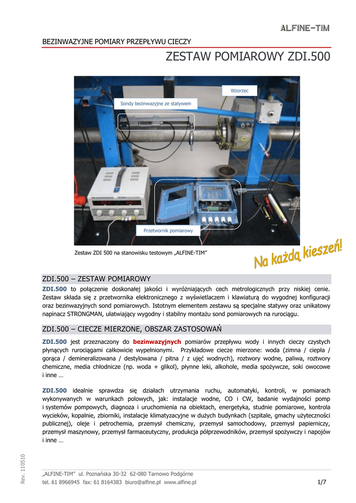 BEZINWAZYJNE POMIARY PRZEPŁYWU CIECZY ZESTAW POMIAROWY ZDI.500 Wzorzec Sondy bezinwazyjne ze statywem Przetwornik pomiarowy Zestaw ZDI 500 na stanowisku testowym „ALFINE-TIM” ZDI.500 – ZESTAW POMIAROWY ZDI.500 to połączenie doskonałej jakości i wyróżniających cech metrologicznych przy niskiej cenie. Zestaw składa się z przetwornika elektronicznego z wyświetlaczem i klawiaturą do wygodnej konfiguracji oraz bezinwazyjnych sond pomiarowych. Istotnym elementem zestawu są specjalne statywy oraz unikatowy napinacz STRONGMAN, ułatwiający wygodny i stabilny montażu sond pomiarowych na rurociągu. ZDI.500 – CIECZE MIERZONE, OBSZAR ZASTOSOWAŃ ZDI.500 jest przeznaczony do bezinwazyjnych pomiarów przepływu wody i innych cieczy czystych płynących rurociągami całkowicie wypełnionymi. Przykładowe ciecze mierzone: woda (zimna / ciepła / gorąca / demineralizowana / destylowana / pitna / z ujęć wodnych), roztwory wodne, paliwa, roztwory chemiczne, media chłodnicze (np. woda + glikol), płynne leki, alkohole, media spożywcze, soki owocowe i inne … Rev. 110510 ZDI.500 idealnie sprawdza się działach utrzymania ruchu, automatyki, kontroli, w pomiarach wykonywanych w warunkach polowych, jak: instalacje wodne, CO i CW, badanie wydajności pomp i systemów pompowych, diagnoza i uruchomienia na obiektach, energetyka, studnie pomiarowe, kontrola wycieków, kopalnie, zbiorniki, instalacje klimatyzacyjne w dużych budynkach (szpitale, gmachy użyteczności publicznej), oleje i petrochemia, przemysł chemiczny, przemysł samochodowy, przemysł papierniczy, przemysł maszynowy, przemysł farmaceutyczny, produkcja półprzewodników, przemysł spożywczy i napojów i inne … „ALFINE-TIM” ul. Poznańska 30-32 62-080 Tarnowo Podgórne tel. 61 8966945 fax: 61 8164383 [email protected] www.alfine.pl 1/7 ZDI.500 – CECHY WYRÓŻNIAJĄCE CENA = znacząco niższa w stosunku do porównywalnych przyrządów dostępnych na rynku. Użytkownik może być „na żywo” przeszkolony na stanowisku pomiarowym ALFINE-TIM w zakresie obsługi lub może uczestniczyć w sprawdzeniu przepływomierza. Rozpiętość mierzalnych prędkości przepływu: 0.01 m/s … 15 m/s w obu kierunkach. ! W badaniach testowych mierzono przy prędkości przepływu 2 mm/s Właściwość ta jest przydatna przy detekcji wycieków i nieszczelności. Dokładność pomiaru (w warunkach referencyjnych): typowo (1 … ±2)% dla v > 0.3 m/s lub (±0.006) m/s dla v < 0.3 m/s. Metoda pomiarowa: Transit Time. Przepływomierz jest ekonomiczny i łatwy w instalacji, obsłudze i serwisowaniu. Do konfiguracji i przeglądania danych służy klawiatura z 16-toma przyciskami. Przepływomierz posiada wbudowane zaawansowane algorytmy autodiagnostyczne jakości pomiarów. Przepływomierz może pracować w układach automatyki. Dostępne są opcje: programowalne wyjście prądowe 4 – 20 mA, programowalne wyjście impulsowe (np. 1 impuls/m3), wyjście alarmowe (dźwiękowe = brzęczyk lub ON/OFF przekaźnik), RS485 (MODBUS). Przepływomierz posiada niezależne liczniki: w przód / w tył / netto. Przetwornik elektroniczny jest wyposażony wyświetlacz LCD 96-cio segmentowy; przykładowe eksponowane parametry w zależności od konfiguracji: wartość przepływu, stan sumatora (przepływ w przód lub w tył lub netto), prędkość przepływu, wartość sygnału na wyjściu analogowym 4-20 mA, opcje: temperatura i inne. Bezinwazyjne sondy pomiarowe są instalowane na powierzchni rurociągu: bez zatrzymywania procesu, bez kontaktu z cieczą płynącą, bez względu na ciśnienie w rurociągu, bez przecinania lub nawiercania rurociągu, bez części ruchomych, bez spadku ciśnienia. Mierzone mogą być praktycznie wszelkie standardowe ciecze jak: woda i inne ciecze czyste lub lekko zanieczyszczone (<20 000 ppm lub <2% cząstek mniejszych niż 100 m). Szeroki zakres średnic rurociągów: DN 25 (1”) … DN 700 (28”) lub więcej, w zależności od rodzaju zastosowanych sond pomiarowych. Zalecenia instalacyjne dotyczące odcinków prostych: na napływie 10 x DN (min), na wypływie 5 x DN (min) (DN = średnica rurociągu). Temperatura medium: typowo 0 oC … +70 oC (= sondy standardowe) lub 0 oC … +120 oC (= sondy wysokotemperaturowe, przeznaczone dla doraźnych / uruchomieniowych / diagnostycznych / krótkookresowych pomiarów kontrolnych). Niski pobór mocy <1 W, zasilanie 24 V DC (standard). Przetwornik elektroniczny posiada obudowę metalową o stopniu ochrony IP 65, wymiary: 251 x 190 x 96 mm, masa ok. 2.5 kg. Opcja: zestaw może być dostarczony jako Plug & Play (nastawy zaprogramowane według wymagań podanych przy zamówieniu) Rev. 110510 Certyfikaty CE: EN 61000-6-2: 2001, EN 55011: 2007. „ALFINE-TIM” ul. Poznańska 30-32 62-080 Tarnowo Podgórne tel. 61 8966945 fax: 61 8164383 [email protected] www.alfine.pl 2/7 ZDI.500 – OPCJE 3 (trzy) dodatkowe wejścia analogowe dla sygnałów z urządzeń zewnętrznych, np. z przetworników ciśnienia / temperatury / poziomu. Odmierzanie dawek: nastawa odmierzenie STOP (przekaźnik + brzęczyk). Pomiar energii cieplnej przy użyciu dwóch czujników PT100 lub dwóch czujników temperatury z wyjściem prądowym lub impulsowym lub cyfrowym (MODBUS). Możliwość wybierania zbioru (spośród 21 opcji) parametrów wysyłanych do loggera. Licznik godzin pracy, zaników zasilania, data ostatniego włączenia i wyłączenia, przepływ w momencie wyłączenia, raport dzienny / miesięczny / roczny. ZDI.500 – KONFIGURACJA ZESTAWU POMIAROWEGO PRZETWORNIK POMIAROWY ZDI 500 Przetwornik elektroniczny z wyświetlaczem LCD Opcja: wyjście prądowe 4 – 20 mA / wyjście impulsowe komunikacja cyfrowa RS485 – MODBUS RTU SONDY POMIAROWE SPS1 Sondy pomiarowe małe (S1 = Small) średnice rurociągów DN 20 … DN 100 / temperatura (0 … 70) oC SPS1H Sondy pomiarowe małe wysokotemperaturowe (H = High Temp.) (przeznaczone dla doraźnych / uruchomieniowych / diagnostycznych / krótkookresowych pom