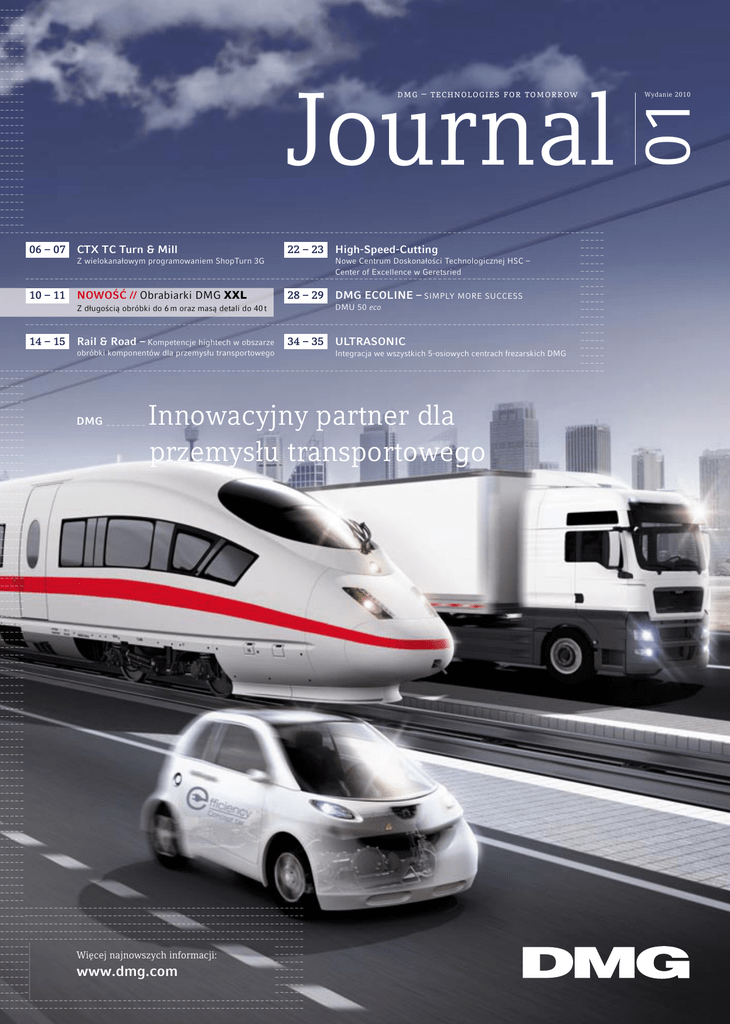 Journal 06 – 07 CTX TC Turn & Mill 22 – 23 High-Speed-Cutting 10 – 11 NOWOŚĆ // Obrabiarki DMG XXL 28 – 29 DMG ECOLINE – 14 – 15 Rail & Road – 34 – 35 ULTRASONIC DMG Innowacyjny partner dla przemysłu transportowego www.dmg.com Wydanie 2010 01 _____ _____ _____ _____ _____ _____ _____ _____ _____ _____ _____ _____ dmg – technologies for tomorrow _____ _____ _____ _____ _____ _____ _____ _____ _____ _____ _____ _____ _____ _____ _____ _____ _____ ___________________________________________________________________________________________________________________________ _____ _____ _____ _____ Nowe Centrum Doskonałości Technologicznej HSC – Z wielokanałowym programowaniem ShopTurn 3G _____ Center of Excellence w Geretsried ______________________________________________________________________________________________________________________ _____ _____ SIMPLY MORE SUCCESS _____ _____ DMU 50 eco Z długością obróbki do 6 m oraz masą detali do 40 t _____ ______________________________________________________________________________________________________________________ _____ _____ Kompetencje hightech w obszarze _____ _____ obróbki komponentów dla przemysłu transportowego Integracja we wszystkich 5-osiowych centrach frezarskich DMG _____ ___________________________________________________________________________________________________________________________ _____ _____ _____ _____ _____ _____ _____ ________ _____ _____ _____ _____ _____ _____ _____ _____ _____ _____ _____ _____ _____ _____ _____ _____ _____ _____ _____ _____ _____ _____ _____ _____ _____ _____ _____ _____ _____ _____ _____ _____ _____ _____ _____ _____ _____ _____ _____ _____ _____ _____ _____ _____ _____ _____ _____ _____ _____ _____ _____ _____ _____ _____ _____ _____ _____ _____ _____ _____ _____ _____ ______________________________________________________________ ______________________________________________________________ ______________________________________________________________ ______________________________________________________________ ______________________________________________________________ ______________________________________________________________ ______________________________________________________________ Więcej najnowszych informacji: ______________________________________________________________ ______________________________________________________________ ______________________________________________________________ ______________________________________________________________ ______________________________________________________________ ______________________________________________________________ ______________________________________________________________ 02 _ 03 DMG 2010 _ _ _ Z TECHNOLOGIAMI DMG W PRZYSZŁOŚĆ! _____ _____ _____ _____ _____ _____ _____ _____ _____ _____ _____ _____ _____ _____ _____ _____ _____ _____ _____ _____ _____ ___________________________________________________________________________________________________________________________________ ___________________________________________________________________________________________________________________________________ ___________________________________________________________________________________________________________________________________ _____________________________________________________________________________________________________________________________________ ____________________________________________________________________________________________________________________________ ____________________________________________________________________________________________________________________________ _ _ _ _ _ _ _ _ _ _ _ _ _ _ _ _ _ _ _ _ _ _ _ _ _ _ _ _ _ _ _ _ _ _ _ _ _ _ _ _ _ _ _ _ _ _ _ _ _ _ _ _ _ _ _ _ _ _ _ _ _ _ _ _ _ _ _ _ _ _ _ _ _ _ _ _ _ _ _ _ _ _ _ _ __ _ _ _ _ _ _ _ _ _ _ _ _ _ _ _ _ _ _ _ _ _ _ _ _ _ _ _ _ _ _ _ _ _ _ _ _ _ _ _ _ _ _ _ _ _ _ _ _ _ _ _ _ _ _ _ _ _ _______________________________________________________________________________________________________________________________________________ _______________________________________________________________________________________________________________________________________________ _ _ _ _ _ _ _ _ _ _ strategiczni _ _ _ _ _ _ _ _ _ _ _ _partnerzy _ _ _ _ _ _ _ _ _ _i_kompetencje _ _ _ _ _ _ _ _ _ _ _ _ _tech__________________________________________________________________ _ _ _ _ _ _ _ _ _ _ _ _ _ _ _ _ _ _ _ _ ___ __ __ __ __ _______ _Innowacja, ___________________________________ _______________________________________________________________________________________________________________________________________________ _ _ _ _ _ _ _ _ _ _ _należą _ _ _ _ _ _dziś _ _ _ _do _ _ _głównych _ _ _ _ _ _ _ _ _czynników _ _ _ _ _ _ _ _ _ _kształtujących _ _ _ _ _ _ _ _ _ _ _ _ _ przy__________________________________________________________________ _ _ _ _ _ _ _ _ _ _ _ _ _ _ _ _ _ _ _ _ _nologiczne _______________________________________________________________________________________________________________________________________________ _ _ _ _ _ _ _ _ _ _rozwiązania _ _ _ _ _ _ _ _ _ _ _dla _ _ _ klientów. _ _ _ _ _ _ _ _ _ Innowacje _ _ _ _ _ _ _ _ _ _i_zorientowane _ _ _ _ _ _ _ _ _ _ _ _ _na _________________________________________________________________ _ _ _ _ _ _ _ _ _ _ _ _ _ _ _ _ _ _ _ _ _szłościowe _______________________________________________________________________________________________________________________________________________ _ _ _ _ _ _ usługi _ _ _ _ _ _ DMG _ _ _ _ _ _to _ _otwarta _ _ _ _ _ _ _ droga _ _ _ _ _ _ku _ _ _pełnej _ _ _ _ _ _sukcesów _ _ _ _ _ _ _ _ _przyszłości. _______________________________________________________________________ _ _ _ _ _ _ _ _ _ _ _ _ _ _ _ _ _ _ _ _ _klienta ___________________________________________________________________________________________________________________________