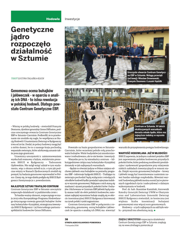 Hodowla Inwestycje Uroczyste otwarcie Centrum Genetyczne EBP w Sztumie. Wstęgę przecięli (od lewej): Wiesław Drewnowski, François Desmons i Leszek Hądzlik TEKST LUCYNA TALAŚKA-KLICH FOT. LUCYNA TALAŚKA-KLICH Genetyczne jądro rozpoczęło działalność w Sztumie - Wierzę w polską hodowlę - stwierdził François Desmons, dyrektor generalny Genes Diffusion, podczas uroczystego otwarcia Centrum Genetyczne EBP w Sztumie-Czerninie. Podkreślił, że to przekonanie nie zrodziło się nagle, bo współpraca ze Stacją Hodowli i Unasieniania Zwierząt w Bydgoszczy trwa od 20 lat. Dodał, że polscy hodowcy mogą być z siebie dumni, bo to z naszego kraju pochodzą wspaniałe zwierzęta, które zdobywają uznanie także poza jego granicami. Uczestnicy uroczystości z zainteresowaniem wysłuchali rozmowy z byłym, wieloletnim prezesem SHiUZ w Bydgoszczy - Tadeuszem Opiłowskim. Nie mógł wziąć udział w tym wydarzeniu, więc z ekranu mówił m.in. o tym jak podczas wizyty w Stanach Zjednoczonych zrodził się pomysł, by badania genomowe wprowadzić w Polsce. Cieszy się, że tego dzieła podjęła się SHiUZ Bydgoszcz i kontynuuje je z powodzeniem. NAJLEPSZE SZTUKI TRAFIĄ DO CENTRUM Centrum Genetyczne EBP w Sztumie uroczyście rozpoczęło działalność 11 października 2016 r. To bardzo ważny element, rozpoczętego w maju 2015 roku Europejskiego Programu Hodowlanego dotyczącego rozwoju genetyki buhajów i krów rasy holsztyńsko-fryzyjskiej, strategiczna inwestycja SHiUZ Bydgoszcz i jej francuskiego partnera spółdzielni hodowców Genes Diffusion. Centrum w Sztumie. W takich ekskluzywnych warunkach dorasta młode bydło, które ma najwyższe indeksy w wycenie genomowej FOT. LUCYNA TALAŚKA-KLICH Genomowa ocena buhajków i jałóweczek - w oparciu o analizę ich DNA - to istna rewolucja w polskiej hodowli. Dlatego powstało Centrum Genetyczne EBP. Powstało na bazie gospodarstwa w SztumieCzerninie, które wcześniej pełniło rolę przechowalni buhajów. Wiele budynków już zmodernizowano i rozbudowano, ale to nie koniec inwestycji. Wszystko po to, by mieszkańcy centrum – kilkutygodniowe cielęta rasy holsztyńsko-fryzyjskiej dorastały w jak najlepszych warunkach. - Będzie to również jedyne w Polsce miejsce odchowu jałówek oraz buhajków na potrzeby programu EBP - informuje bydgoski SHiUZ. - Trafiające tu zwierzęta pochodzić będą wyłącznie z wiodących ośrodków hodowli bydła i posiadać najwyższe indeksy w wycenie genomowej. Najlepsze z nich staną się matkami i ojcami przyszłych pokoleń krów i buhajów. Odchowane w Centrum EBP jałówki będą miały szanse trafić do obór polskich hodowców, natomiast najlepiej wycenione buhaje znajdą się w ofercie inseminacyjnej SHiUZ Bydgoszcz kierowanej na rynek polski i rynki zagraniczne. Centrum Genetyczne EBP w połączeniu z rewolucyjną, genomową oceną buhajków i jałóweczek (w oparciu o analizę ich DNA) ma stworzyć warunki do przyspieszenia postępu hodowlanego. 38 ZDJĘCIA Z UROCZYSTEGO rozpoczęcia działalności Centrum Genetycznego EBP w Sztumie znajdują się na www.strefaagro.pomorska.pl STREFA AGRO KUJAWSKO-POMORSKA 7 listopada 2016 WARTOŚĆ HODOWLANA JUŻ W MŁODOŚCI SHiUZ zapewnia, że jednym z założeń projektu EBP jest zapewnienie polskim hodowcom przyszłych pokoleń krów, które podniosą możliwości produkcyjne i zyskowność gospodarstw przy relatywnie niskich nakładach inwestycyjnych w remont stada. Dzięki wycenie genomowej buhajów – krowy i jałówki mogą być inseminowane nasieniem nawet bardzo młodego rozpłodnika. Również wartość hodowlaną jałówki można ocenić już w pierwszych tygodniach życia i zadecydować o dalszym wykorzystaniu w hodowli. Prof. dr. hab. Stanisław Kamiński, kierownik Katedry Genetyki Zwierząt UWM w Olsztynie oraz szef Laboratorium Genomiki Zwierząt SHiUZ Bydgoszcz stwierdził, że konieczna jest większa liczba inseminacji buhajami genomowymi oraz więcej ocen genomowych. Hodowcy - a tych najlepszych na sali było wielu - przyznali mu absolutną rację. a