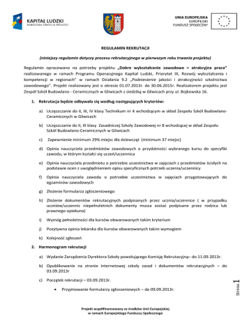REGULAMIN REKRUTACJI (niniejszy regulamin dotyczy procesu rekrutacyjnego w pierwszym roku trwania projektu) Regulamin opracowano na potrzeby projektu „Dobre wykształcenie zawodowe = atrakcyjna praca” realizowanego w ramach Programu Operacyjnego Kapitał Ludzki, Priorytet IX, Rozwój wykształcenia i kompetencji w regionach” w ramach Działania 9.2 „Podniesienie jakości i atrakcyjności szkolnictwa zawodowego”. Projekt realizowany jest o okresie 01.07.2013r. do 30.06.2015r. Realizatorem projektu jest Zespół Szkół Budowlano - Ceramicznych w Gliwicach z siedzibą w Gliwicach przy ul. Bojkowska 16. 1. Rekrutacja będzie odbywała się według następujących kryteriów: a) Uczęszczanie do II, III, IV klasy Technikum nr 4 wchodzącym w skład Zespołu Szkół BudowlanoCeramicznych w Gliwicach b) Uczęszczanie do II, III klasy Zasadniczej Szkoły Zawodowej nr 8 wchodzącej w skład Zespołu Szkół Budowlano-Ceramicznych w Gliwicach c) Zapewnienie minimum 29% miejsc dla dziewcząt (minimum 37 miejsc) d) Opinia nauczyciela przedmiotów zawodowych o przydatności wybranego kursu do specyfiki zawodu, w którym kształci się uczeń/uczennica e) Opinia nauczyciela przedmiotu o potrzebie uczestnictwa w zajęciach z przedmiotów ścisłych na podstawie ocen z uwzględnieniem opisu specyficznych potrzeb uczenia/uczennicy f) Opinia nauczyciela zawodu o potrzebie uczestnictwa w zajęciach przygotowujących do egzaminów zawodowych g) Złożenie formularza zgłoszeniowego h) Złożenie dokumentów rekrutacyjnych podpisanych przez ucznia/uczennice ( w przypadku uczniów/uczennic niepełnoletnich dokumenty musza zostać podpisane przez rodzica lub prawnego opiekuna) i) Wymóg pełnoletności dla kursów obwarowanych takim kryterium j) Pozytywna opinia lekarska dla kursów obwarowanych takim wymogiem k) Kolejność zgłoszeń 2. Harmonogram rekrutacji a) Wydanie Zarządzenia Dyrektora Szkoły powołującego Komisję Rekrutacyjną– do 11.09.2013r. Przyjmowanie formularzy zgłoszeniowych – do 09.09.2013r. Projekt współfinansowany ze środków Unii Europejskiej w ramach Europejskiego Funduszu Społecznego Strona c) Początek rekrutacji – 03.09.2013r. 1 b) Opublikowanie na stronie internetowej szkoły zasad i dokumentów rekrutacyjnych – do 03.09.2013r Symulacja składu grup na podstawie formularzy zgłoszeniowych – do 13.09.2013r. Publikacja wstępnej listy uczestników i uczestniczek projektu – do 16.09.2013r Sporządzenie protokołu rekrutacyjnego, wydanie decyzji rekrutacyjnej i opublikowanie ostatecznej listy uczestników i uczestniczek projektu – do 24.09.2013r. 3. Schemat rekrutacyjny a) uczeń/uczennica składa w sekretariacie szkoły lub biurze projektu wypełniony formularz zgłoszeniowy (załącznik nr 1) w terminie od 03.09.2013r. do 06.09.2013r. b) na podstawie wpływających formularzy Komisja Rekrutacyjna zbiera opinie, o których mowa w pkt. 1d ,1e,1f (załącznik nr 2……00) c) na podstawie formularzy zgłoszeniowych oraz uzyskanych opinii Komisja Rekrutacyjna tworzy wstępną listę uczestników i uczestniczek w podziale na typy zajęć wymienione w pkt. 4 d) uczniowie/uczennice zakwalifikowani do udziału w projekcie składają wypełnione i podpisane dokumenty rekrutacyjne. Są to: deklaracja uczestnictwa (załącznik 3), oświadczenie uczestnika projektu (załącznik 4) zestawienie danych osobowych (załącznik 5). Dokumenty te są przyjmowane w sekretariacie szkoły lub biurze projektu do 20.09.2012r. e) po weryfikacji dokumentów wymienionych w pkt 3d pod kątem spełnienia kryteriów rekrutacyjnych Komisja Rekrutacyjna sporządza ostateczną listę uczestników i uczestniczek projektu. 4. Rodzaje zajęć i kursów podlegające rekrutacji W pierwszym roku realizacji projektu rekrutacja obejmie następujące typy zajęć i kursów. a) Kurs „Kwalifikacje zawodowe w budownictwie” Program kursu będzie składał się z 2 modułów – pierwszy (30h) poświęcony będzie aspektom teoretycznym i praktycznym robót budowlanych wraz z montażem, drugi będzie wyposażał U/U w umiejętności projektowania w technologii CAD przy wykorzystaniu AOTO CAD-a. Rekrutacja obejmie 20 uczniów/uczennic podzielonych na 2 10-cio osobowe grupy. Kurs będzie realizowany w wymiarze 60h. Początek kursu – wrzesień 2013r. c) Kurs „Kosztorysowanie dla geodetów i budowlańców”. Projekt współfinansowany ze środków Unii Europejskiej w ramach Europejskiego Funduszu Społecznego Strona Kurs pozwala na podniesienie jakości kształcenia praktycznego i osiągnieciu przez uczniów efektów kształcenia właściwych dla kwalifikacji. Uczniowie będą kształcić umiejętności w zakresie wykonywania obliczeń – korzystając z oprogramowania geodezyjnego – opracowania map wielkoskalowych, sytuacyjnych i sytuacyjno-wysokościowych; opracowania dokumentacji prac geodezyjnych oraz wykonywania pomiarów technika GPS. Rekrutacja obejmie 10 uczniów/uczennic. Kurs będzie realizowany w wymiarze 56h. Początek kursu – wrzesień 2013r. 2 b) Kurs „Kwalifikacje zawodowe geodetów”. Kurs jest poszerzeniem wiedzy i umiejętności praktycznych w zakresie kwalifikacji B.30. Sporządzenie kosztorysów oraz przygotowanie dokumentacji przetargowej. Rekrutacja obejmie 10 uczniów/uczennic. Kurs będzie realizowany w wymiarze 30h. Początek kursu – styczeń 2014r. d) Kurs „Kwalifikacje zawodowe technika architektury krajobrazu”. Kurs będzie kształcić umiejętności w zakresie opracowania projektów koncepcyjnych i technicznych ogrodów wykorzystując oprogramowanie komputerowe do projektowania ogrodów i tworzenia rysunków technicznych; wykonywania prac Związanych z pielęgnacja, konserwacją i serwisowaniem ogrodów przez cały rok. Ponadto U/U będą nabywali umiejętności projektowania terenów zielonych z wykorzystaniem programu komputerowego GARDEN PUZZLE. Rekrutacja obejmie 20 uczniów/uczennic podzielonych na 2 grupy. Kurs będzie realizowany w wymiarze 60h. Poc