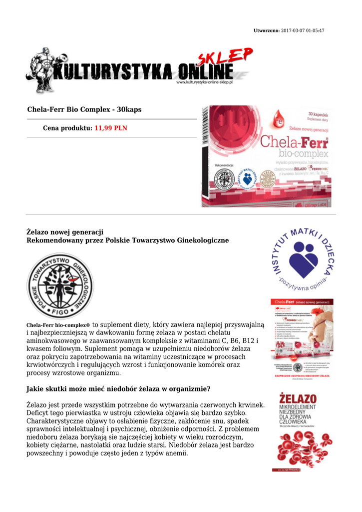 Utworzono: 2017-03-07 01:05:47 Chela-Ferr Bio Complex - 30kaps Cena produktu: 11,99 PLN Żelazo nowej generacji Rekomendowany przez Polskie Towarzystwo Ginekologiczne to suplement diety, który zawiera najlepiej przyswajalną i najbezpieczniejszą w dawkowaniu formę żelaza w postaci chelatu aminokwasowego w zaawansowanym kompleksie z witaminami C, B6, B12 i kwasem foliowym. Suplement pomaga w uzupełnieniu niedoborów żelaza oraz pokryciu zapotrzebowania na witaminy uczestniczące w procesach krwiotwórczych i regulujących wzrost i funkcjonowanie komórek oraz procesy wzrostowe organizmu. Chela-Ferr bio-complex® Jakie skutki może mieć niedobór żelaza w organizmie? Żelazo jest przede wszystkim potrzebne do wytwarzania czerwonych krwinek. Deficyt tego pierwiastka w ustroju człowieka objawia się bardzo szybko. Charakterystyczne objawy to osłabienie fizyczne, zakłócenie snu, spadek sprawności intelektualnej i psychicznej, obniżenie odporności. Z problemem niedoboru żelaza borykają sie najczęściej kobiety w wieku rozrodczym, kobiety ciężarne, nastolatki oraz ludzie starsi. Niedobór żelaza jest bardzo powszechny i powoduje często jeden z typów anemii. Dlaczego żelazo warto podawać w kompleksie z niektórymi witaminami? Szczególnie wskazane jest przyjmowanie żelaza łącznie z witaminą C, B6, B12 i kwasem foliowym, gdyż składniki te dodatkowo, niezależnie od żelaza, przyspieszają proces krwiotworzenia zapobiegając występowaniu niedokrwistości. Witamina B6 pomaga organizmowi w gospodarce żelaza oraz uczestniczy w procesach krwiotwórczych, a także jest ważna dla prawidłowego funkcjonowania układu nerwowego i immunologicznego Witamina B12 uczestniczy w wytwarzaniu czerwonych ciałek krwi, przeciwdziała niedokrwistości i wraz z kwasem foliowym odgrywa istotną rolę przy podziałach komórek; Witamina C ułatwia wchłanianie trudnoprzyswajalnego żelaza niehemowego obecnego w produktach roślinnych, co zwiększa ogólną pulę tego pierwiastka w organizmie oraz jego dystrybucję do szpiku kostnego, gdzie zachodzi produkcja elementów krwi z udziałem tego pierwiastka; Kwas foliowy reguluje wzrost i funkcjonowanie komórek, przyczynia się do prawidłowego rozwoju płodu w łonie matki oraz pobudza procesy krwiotwórcze. Jakie preparaty żelaza są najefektywniej wykorzystywane przez organizm? Żelazo jest ogólnie składnikiem słabo przyswajalnym, stąd w procesie suplementacji powinno się stosować formy żelaza o najwyższym stopniu biodostępności. Obecnie najbardziej efektywnym rodzajem suplementu jest żelazo w postaci chelatu aminokwasowego (Chela-Ferr Bio-complex), którego przyswajalność jest wielokrotnie razy wyższa niż zwykłych preparatów żelaza. Jest to zarazem najbardziej bezpieczna forma żelaza, jaką obecnie oferuje rynek suplementów. Mikrografia elektronowa porównująca absorbcję w jelicie nieorganicznego żelaza z siarczanu z chelatem aminokwasowym FERROCHEL Właściwą absorpcję żelaza z przewodu pokarmowego oraz ściśle kontrolowaną dystrybucję w obrębie organizmu zapewniają utworzone chelaty aminokwasowe tego pierwiastka, charakteryzujące się niezwykle wysoką biodostępnością i całkowitym bezpieczeństwem stosowania: Ferrochel® - Aminokwasowy Chelat Żelaza ALBION® użyty w preparacie CHELA-FERR BIO-COMPLEX® otrzymał od Amerykańskiego Departamentu Zdrowia FDA certyfikat produktu Powszechnie Uznanego za Bezpieczny - GRAS. Także Europejska Organizacja Bezpieczeństwa Żywności, EFSA uznała Ferrochel® za bezpieczny i biodostępny (Źródło: http://www.albion-an.com/human/Certifications.htm) Komu polecany jest CHELA-FERR BIO-COMPLEX ®? Produkt polecany w szczególności kobietom będącym w ciąży lub planującym ciążę, w okresie okomenstruacyjnym, w stanach niedokrwistosci, osobom z niedoborami żelaza oraz sportowcom dyscyplin wytrzymałościowych. PAMIĘTAJ ! Wybierając preparat mineralny, zawsze na opakowaniu szukaj znaczka ALBION ® MINERALS Albion Laboratories® jako jedyna firma na świecie, opracowała najbardziej precyzyjny i skuteczny proces przekształcania minerałów w postać wysokoprzyswajalną przez organizm. Dzięki unikalnej technologii chelatowania minerałów (specjalnemu połączeniu z aminokwasami), minerały Albiona® są kilkakrotnie lepiej wchłaniane od tradycyjnych preparatów! Są ponadto odporne na działanie składników antyodżywczych, nie osłabiają działania witamin oraz stwarzają mniejsze ryzyko przedawkowania. Nowatorskie i opatentowane przez Albion osiągnięcie w zakresie produkcji minerałów znajdziesz w produkcie OLIMP CHELA-FERRBIO-COMPLEX®. Uwaga: Do produkcji preparatu Chela-Ferr Bio-complex® firma Olimp Laboratories® wykorzystuje tylko i wyłącznie CHELAT AMINOKWASOWY ŻELAZA – FERROCHEL® firmy ALBION® – super przyswajalną i najbezpieczniejszą formę żelaza otrzymaną w unikalnej, chronionej patentem technologii należącej do ALBION®. Nie kupuj tanich i niesprawdzonych środków. Twoje zdrowie i samopoczucie nie są tego warte! Komu polecany jest CHELA-FERR BIO-COMPLEX®? Produkt polecany dla dzieci powyżej 3 roku życia, młodzieży i osób dorosłych jako uzupełnienie niedoborów żelaza - składnika hemoglobiny, która jest nośnikiem tlenu w organizmie oraz uzupełnienie zapotrzebowania na kwas foliowy i witaminy: B6, B12, C uczestniczące w procesach krwiotwórczych oraz regulujących wzrost i funkcjonowanie komórek. Szczególnie polecany osobom mającym zwiększone zapotrzebowanie na żelazo i/lub kwas foliowy kobietom w ciąży, karmiącym, a także planującym ciążę, w okresie około menstruacyjnym, jak również osobom o wzmożonej aktywności ruchowej, dawcom krwi, wegetarianom (preparat bez kapsułki). SKŁAD Informacja żywieniowa 1 kapsułka Chelat aminokwasowy żelaza Ferrochel® TRAACS® (diglicynian żelaza) 70 mg w tym: Żelazo 14 mg (100%*) Kwas foliowy 200 µg (100%*) Witamina C 40 mg (50%*) Witamina B6 1,4