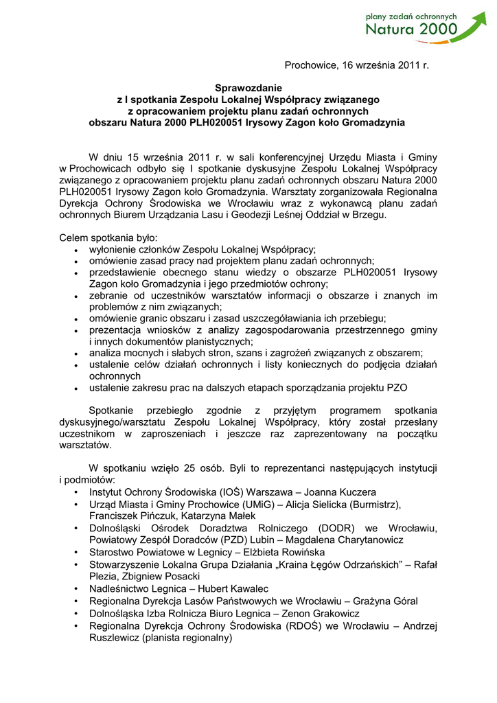 Prochowice, 16 września 2011 r. Sprawozdanie z I spotkania Zespołu Lokalnej Współpracy związanego z opracowaniem projektu planu zadań ochronnych obszaru Natura 2000 PLH020051 Irysowy Zagon koło Gromadzynia W dniu 15 września 2011 r. w sali konferencyjnej Urzędu Miasta i Gminy w Prochowicach odbyło się I spotkanie dyskusyjne Zespołu Lokalnej Współpracy związanego z opracowaniem projektu planu zadań ochronnych obszaru Natura 2000 PLH020051 Irysowy Zagon koło Gromadzynia. Warsztaty zorganizowała Regionalna Dyrekcja Ochrony Środowiska we Wrocławiu wraz z wykonawcą planu zadań ochronnych Biurem Urządzania Lasu i Geodezji Leśnej Oddział w Brzegu. Celem spotkania było: wyłonienie członków Zespołu Lokalnej Współpracy; omówienie zasad pracy nad projektem planu zadań ochronnych; przedstawienie obecnego stanu wiedzy o obszarze PLH020051 Irysowy Zagon koło Gromadzynia i jego przedmiotów ochrony; zebranie od uczestników warsztatów informacji o obszarze i znanych im problemów z nim związanych; omówienie granic obszaru i zasad uszczegóławiania ich przebiegu; prezentacja wniosków z analizy zagospodarowania przestrzennego gminy i innych dokumentów planistycznych; analiza mocnych i słabych stron, szans i zagrożeń związanych z obszarem; ustalenie celów działań ochronnych i listy koniecznych do podjęcia działań ochronnych ustalenie zakresu prac na dalszych etapach sporządzania projektu PZO Spotkanie przebiegło zgodnie z przyjętym programem spotkania dyskusyjnego/warsztatu Zespołu Lokalnej Współpracy, który został przesłany uczestnikom w zaproszeniach i jeszcze raz zaprezentowany na początku warsztatów. W spotkaniu wzięło 25 osób. Byli to reprezentanci następujących instytucji i podmiotów: • Instytut Ochrony Środowiska (IOŚ) Warszawa – Joanna Kuczera • Urząd Miasta i Gminy Prochowice (UMiG) – Alicja Sielicka (Burmistrz), Franciszek Pińczuk, Katarzyna Małek • Dolnośląski Ośrodek Doradztwa Rolniczego (DODR) we Wrocławiu, Powiatowy Zespół Doradców (PZD) Lubin – Magdalena Charytanowicz • Starostwo Powiatowe w Legnicy – Elżbieta Rowińska • Stowarzyszenie Lokalna Grupa Działania „Kraina Łęgów Odrzańskich” – Rafał Plezia, Zbigniew Posacki • Nadleśnictwo Legnica – Hubert Kawalec • Regionalna Dyrekcja Lasów Państwowych we Wrocławiu – Grażyna Góral • Dolnośląska Izba Rolnicza Biuro Legnica – Zenon Grakowicz • Regionalna Dyrekcja Ochrony Środowiska (RDOŚ) we Wrocławiu – Andrzej Ruszlewicz (planista regionalny) • • Biuro Urządzania Lasu i Geodezji Leśnej (BULiGL) Oddział w Brzegu – Anna Wójcicka-Rosińska, Dariusz Rosiński (koordynator) Właściciele prywatni gruntów (rolnicy) – 12 osób Spotkanie rozpoczęło się powitaniem gości przez panią Burmistrz Alicję Sielicką. Następnie w imieniu Regionalnej Dyrekcji Ochrony Środowiska we Wrocławiu oraz Biura Urządzania Lasu i Geodezji Leśnej Oddział w Brzegu zaproszonych gości powitał Andrzej Ruszlewicz i zaproponował, aby uczestnicy spotkania się przedstawili. Następnie zaprezentował plan spotkania, omówił poszczególne jego punkty i zapytał o zgodę uczestników, co do proponowanego przebiegu spotkania. Nikt spośród zgromadzonych nie wniósł uwag w tym zakresie. Po sporządzeniu listy obecności rozpoczęła się pierwsza prezentacja dotycząca zagadnień związanych z podstawami prawnymi funkcjonowania sieci Natura 2000 oraz sporządzania planów zadań ochronnych dla obszarów Natura 2000. Andrzej Ruszlewicz RDOŚ we Wrocławiu (planista regionalny) Przedstawił prezentację pt.: „Celowość wprowadzania sieci obszarów chronionych Natura 2000”, w której wyjaśnił ideę sieci Natura 2000 i proces wprowadzania tego programu na obszarze Polski. Prelegent przedstawił m.in. skuteczność prac nad programem w naszym kraju oraz ich jakość na tle pozostałych krajów Unii Europejskiej. Ponadto wskazał na podstawowe akty prawne określające funkcjonowanie sieci. Następnie przedstawił zasady tworzenia planów zadań ochronnych i aktualny stan zaawansowania prac nad tego typu planami w Polsce. Kolejnym punktem programu była prezentacja dotycząca samego obszaru Natura 2000 Irysowy Zagon koło Gromadzynia i jego przedmiotów ochrony. Anna Wójcicka-Rosińska BULiGL Oddział w Brzegu W prezentacji pt.: „Specjalny Obszar Ochrony Natura 2000 Irysowy Zagon koło Gromadzynia PLH020051 prelegentka przedstawiła informacje zawarte w Standardowym Formularzu Danych (SDF) obszaru i scharakteryzowała jego przedmioty ochrony. Wskazała również na położenie przedmiotów ochrony względem podziału na działki ewidencyjne obszaru ostoi. Przy okazji charakterystyki siedlisk wytłumaczyła rozbieżności pomiędzy informacjami w SDF-ie a rzeczywistym stanem potwierdzonym w czasie weryfikacji terenowych. Następnie zaprezentowała chronione krajowym prawem gatunki roślin występujące na siedliskach przyrodniczych oraz zagrożone gatunki w skali regionu i kraju. Przy okazji charakterystyki zwierząt stanowiących przedmioty ochrony ostoi prelegentka omówiła ich biologię i wskazała na wrażliwe cechy i potencjalne zagrożenia. W prezentacji zaproponowano włączenie na listę przedmiotów ochrony nowego gatunku – przeplatki maturna Euphydryas maturna oraz dwóch siedlisk przyrodniczych, które zinwentaryzowano w granicach ostoi w czasie prac terenowych – 6440 Łąki selernicowe (Cnidion dubii) oraz 91E0 *Łęgi wierzbowe, topolowe, olszowe i jesionowe (Salicetum albae, Populetum albae, Alnenion glutinoso-incanae, olsy źródliskowe). Wskazano również na konieczność skorygowania pierwotnej zawartości SDF dotyczącej trzech przedmiotów ochrony oraz udziału procentowego poszczególnych siedlisk przyrodniczych będących przedmiotami ochrony. Problem dotyczył siedliska *6230 Bogate florystycznie górskie i niżowe murawy bliźniczkowe (Nardion) oraz dwóch gatunków modraszków - 1061 modras