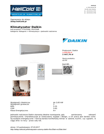 HellCold ul. Zofii Kossak 98 43-436, Górki Wielkie tel. +48 33 85-13-795 tel. +48 33 85-13-796 Zapraszamy do sklepu sklep.hellcold.pl Klimatyzator Daikin kod produktu: FTXV25AB / RXV25AB kategoria: Kategorie > Klimatyzacja > Jednostki naścienne Producent: Daikin 3 259,50 zł 2 447,70 zł Opcje produktu: szt.45 Kod QR: Wydajność chłodnicza: Wydajność grzewcza: EER: COP: Klasa Energetyczna: do 2,65 kW 3 3.25 3.63 A+ Jednostki naścienne Daikin stanowią idealne rozwiązanie, gdy zamierzamy odnowić pomieszczenie. Charakteryzuje je nowoczesny wygląd i design, a ich praca jest bardzo cicha. Są wydajne energetycznie i tworzą bardzo komfortowy klimat w salonie, kuchni, czy sypialni, w ciągu dnia i w nocy - przez cały rok. strona: 1/2 wydrukowano: 07-03-2017 http://sklep.hellcold.pl/klimatyzator-scienny-daikin-ftxv25ab-rxv25ab.html Te naścienne pompy ciepła to rozwiązanie do ogrzewania i chłodzenia „wszystko wjednym”, co o znacza, że zapewniają komfortowe ciepło w okresie zimowym i niższą temperaturę w okresie letnim. Jednostkę wewnętrzną można stosować w układach pojedynczych, gdzie jedna jednostka wewnęt rzna jest podłączona do jednej jednostki zewnętrznej Wartość SEER/SCOP: do A+ Łatwy w obsłudze zdalny sterownik Lamele wymiennika ciepła jednostki zewnętrznej z ochroną anty-korozyjną Szeroki asortyment, od klasy 25 do 60 strona: 2/2 wydrukowano: 07-03-2017 http://sklep.hellcold.pl/klimatyzator-scienny-daikin-ftxv25ab-rxv25ab.html