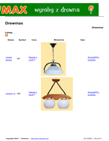 Drewmax Drewmax Lampy Nazwa Lampa grecka Symbol Cena Miniaturka Opis 457 Zapytaj o cenÄ™ Szczegóły produktu Lampa L-2 458 Zapytaj o cenÄ™ Szczegóły produktu Copyright ©2017 - Drewmax - http://www.drewmax.net _PN_PAGE 1 _PN_OF 5 Lampa L-3 459 Zapytaj o cenÄ™ Szczegóły produktu Lampa oswietl kolo 1 460 Zapytaj o cenÄ™ Szczegóły produktu Lampa oswietl lancuch 466 Zapytaj o cenÄ™ Szczegóły produktu Copyright ©2017 - Drewmax - http://www.drewmax.net _PN_PAGE 2 _PN_OF 5 Lampa oswietl pajak III 461 Zapytaj o cenÄ™ Szczegóły produktu Lampa oswietl podw 462 Zapytaj o cenÄ™ Szczegóły produktu Lampa 463 oswietl rogi Zapytaj o cenÄ™ Szczegóły produktu Copyright ©2017 - Drewmax - http://www.drewmax.net _PN_PAGE 3 _PN_OF 5 Lampa oswietl sekacz 464 Zapytaj o cenÄ™ Szczegóły produktu Lampa oswietl zwis maly 465 Zapytaj o cenÄ™ Szczegóły produktu Lampa solna 467 Zapytaj o cenÄ™ Szczegóły produktu Copyright ©2017 - Drewmax - http://www.drewmax.net _PN_PAGE 4 _PN_OF 5 Lampka LN-1C4 469 Zapytaj o cenÄ™ Szczegóły produktu Lampka LN-1C4 468 Zapytaj o cenÄ™ Szczegóły produktu • • • • • «« Start « Poprzednia 1 NastÄ™pna » Koniec »» Wyniki 1 - 13 z 13 Copyright ©2017 - Drewmax - http://www.drewmax.net _PN_PAGE 5 _PN_OF 5