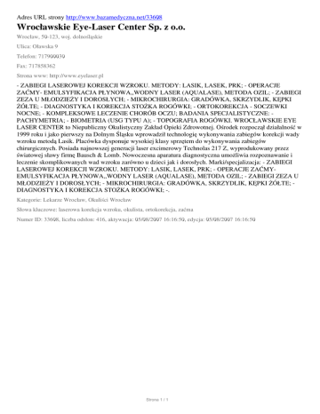 Adres URL strony http://www.bazamedyczna.net/33608 Wrocławskie Eye-Laser Center Sp. z o.o. Wrocław, 50-123, woj. dolnośląskie Ulica: Oławska 9 Telefon: 717900030 Fax: 717858362 Strona www: http://www.eyelaser.pl - ZABIEGI LASEROWEJ KOREKCJI WZROKU. METODY: LASIK, LASEK, PRK; - OPERACJE ZAĆMY- EMULSYFIKACJA PŁYNOWA,,WODNY LASER (AQUALASE), METODA OZIL; - ZABIEGI ZEZA U MŁODZIEŻY I DOROSŁYCH; - MIKROCHIRURGIA: GRADÓWKA, SKRZYDLIK, KĘPKI ŻÓŁTE; - DIAGNOSTYKA I KOREKCJA STOŻKA ROGÓWKI; - ORTOKOREKCJA - SOCZEWKI NOCNE; - KOMPLEKSOWE LECZENIE CHORÓB OCZU; BADANIA SPECJALISTYCZNE: PACHYMETRIA; - BIOMETRIA (USG TYPU A); - TOPOGRAFIA ROGÓWKI. WROCŁAWSKIE EYE LASER CENTER to Niepubliczny Okulistyczny Zakład Opieki Zdrowotnej. Ośrodek rozpoczął działalność w 1999 roku i jako pierwszy na Dolnym Śląsku wprowadził technologię wykonywania zabiegów korekcji wady wzroku metodą Lasik. Placówka dysponuje wysokiej klasy sprzętem do wykonywania zabiegów chirurgicznych. Posiada najnowszej generacji laser excimerowy Technolas 217 Z, wyprodukowany przez światowej sławy firmę Bausch & Lomb. Nowoczesna aparatura diagnostyczna umożliwia rozpoznawanie i leczenie skomplikowanych wad wzroku zarówno u dzieci jak i dorosłych. Marki/specjalizacja: - ZABIEGI LASEROWEJ KOREKCJI WZROKU. METODY: LASIK, LASEK, PRK; - OPERACJE ZAĆMYEMULSYFIKACJA PŁYNOWA,,WODNY LASER (AQUALASE), METODA OZIL; - ZABIEGI ZEZA U MŁODZIEŻY I DOROSŁYCH; - MIKROCHIRURGIA: GRADÓWKA, SKRZYDLIK, KĘPKI ŻÓŁTE; DIAGNOSTYKA I KOREKCJA STOŻKA ROGÓWKI; -. Kategorie: Lekarze Wrocław, Okuliści Wrocław Słowa kluczowe: laserowa korekcja wzroku, okulista, ortokorekcja, zaćma Numer ID: 33608, liczba odsłon: 416, aktywacja: 05/08/2007 16:16:50, edycja: 05/08/2007 16:16:50 Strona 1 / 1