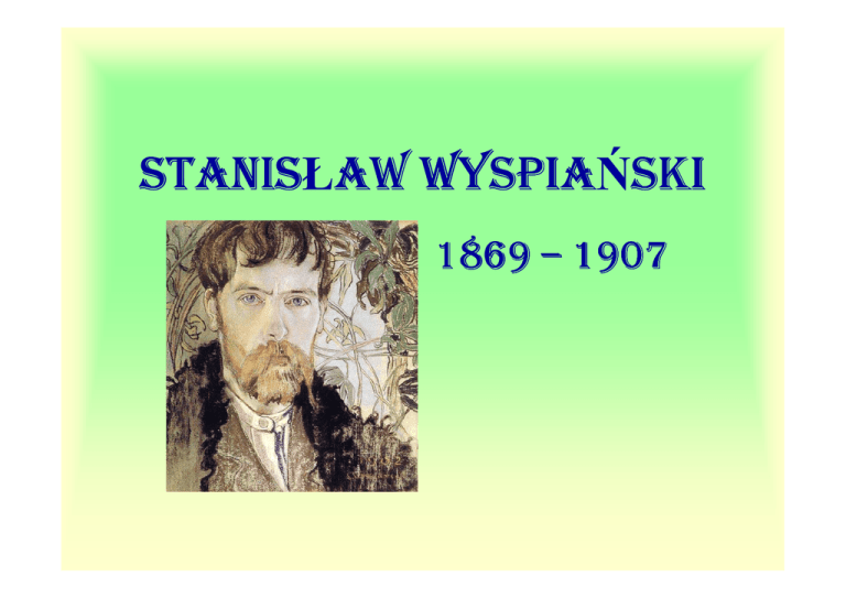 STANISŁAW STANIS AW WYSPIAŃSKI WYSPIA SKI 1869 – 1907 Stanisław Wyspiański – autoportrety 1890 rok; rys. ołówkiem, Muzeum Narodowe w Krakowie Stanisław Wyspiański – autoportrety 1905, pastel, własność prywatna Stanisław Wyspiański – autoportrety 1907, ołówek, papier, Muzeum Narodowe w Krakowie Stanisław Wyspiański – obrazy Planty o świcie. 1894. Olej na płótnie. 101x201,5 cm. Własność prywatna, depozyt w Muzeum Narodowym w Krakowie. Stanisław Wyspiański – obrazy Chochoły (Planty nocą). 1898-99. Pastel. 69 x 107 cm. Muzeum Narodowe, Warszawa. Stanisław Wyspiański – witraże • „Bóg Ojciec – Stań się” • „Święty Franciszek” • „Maria z Dzieciątkiem” Stanisław Wyspiański – witraż „Bóg Ojciec – Stań się!” Bóg Ojciec - Stań się! 1897-1904. Witraż. 846 x 390 cm. Kościół OO. Franciszkanów, Kraków. Stanisław Wyspiański – witraż „Bóg Ojciec – Stań się!” • Bóg Ojciec - Stań się! 1897-1904. Witraż. 846 x 390 cm. Kościół OO. Franciszkanów, Kraków. • Bóg jako pogromca żywiołów, dyrygent kiełznający chaos powietrza, ognia, ziemi, wody. • Bóg rozstrzyga dramatyczne sprzeczności: między niebytem a bytem, między bezładem a harmonią. Temat: • Bóg – Stwórca w pieśni Jana Kochanowskiego „Czego chcesz od nas Panie za…” a Bóg – Stwórca z witrażu Stanisława Wyspiańskiego „Bóg Ojciec – Stań się”. Stanisław Wyspiański – witraż „Święty Franciszek” Święty Franciszek 1897-1904. Witraż. Kościół OO. Franciszkanów, Kraków. Stanisław Wyspiański – witraż „Maria z Dzieciątkiem” Projekt witraża dla katedry lwowskiej Stanisław Wyspiański – ilustracje do „Iliady” Homera Hermes jako przewodnik, najczulszy przewodnik, który delikatnie ujmuje dłonie poległych; uważa, by nie urazić bolesnych ran. Hermes wiedzie duchy bohaterów do głębin Hadesu 1897. Rys. ołówkiem na papierze. 22,5 x 31,3 cm. Własność prywatna. Stanisław Wyspiański – ilustracje do „Iliady” Homera Gniew Pelidę ponosi (Gniew Achillesa) 1896. Rys. ołówkiem. 29,1 x 44,2 cm. Muzeum Narodowe, Warszawa. Bibliografia • http://www.pinakoteka.zascianek.pl/ Wyspianski/Index.htm • Stanisław Falkowski: „Lekcje literatury”, Kraków 2001.