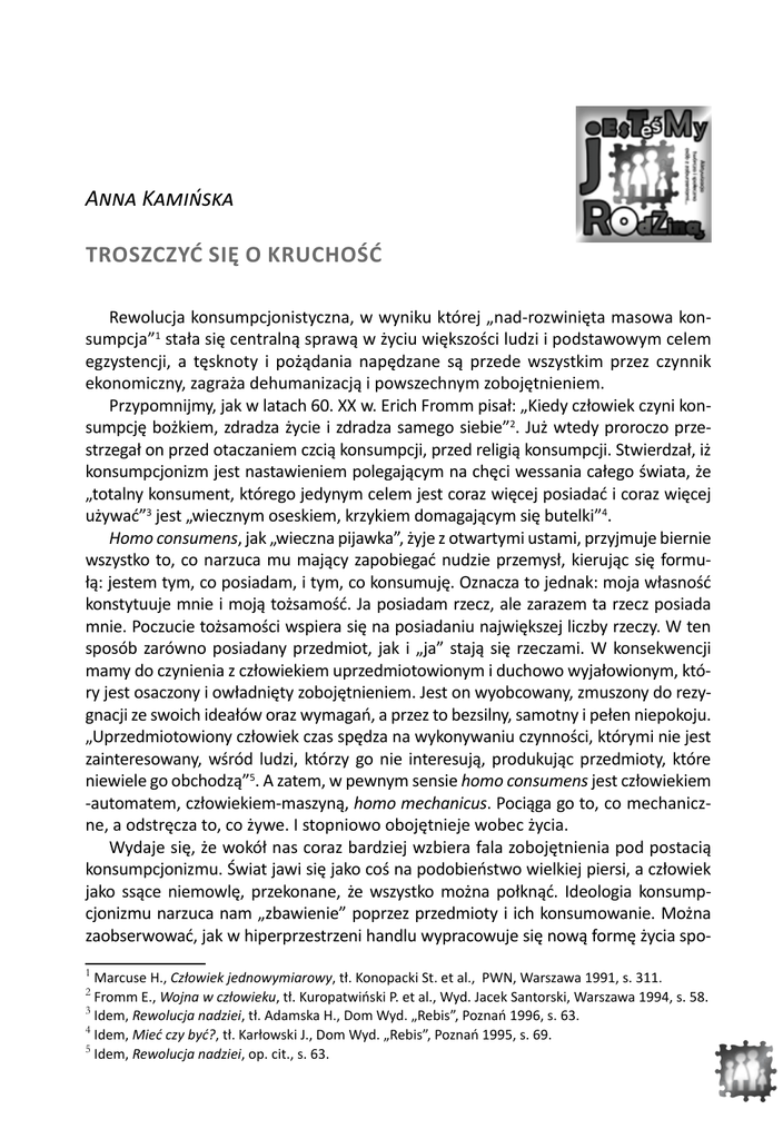 31 Anna Kamińska TROSZCZYĆ SIĘ O KRUCHOŚĆ Rewolucja konsumpcjonistyczna, w wyniku której „nad-rozwinięta masowa konsumpcja”1 stała się centralną sprawą w życiu większości ludzi i podstawowym celem egzystencji, a tęsknoty i pożądania napędzane są przede wszystkim przez czynnik ekonomiczny, zagraża dehumanizacją i powszechnym zobojętnieniem. Przypomnijmy, jak w latach 60. XX w. Erich Fromm pisał: „Kiedy człowiek czyni konsumpcję bożkiem, zdradza życie i zdradza samego siebie”2. Już wtedy proroczo przestrzegał on przed otaczaniem czcią konsumpcji, przed religią konsumpcji. Stwierdzał, iż konsumpcjonizm jest nastawieniem polegającym na chęci wessania całego świata, że „totalny konsument, którego jedynym celem jest coraz więcej posiadać i coraz więcej używać”3 jest „wiecznym oseskiem, krzykiem domagającym się butelki”4. Homo consumens, jak „wieczna pijawka”, żyje z otwartymi ustami, przyjmuje biernie wszystko to, co narzuca mu mający zapobiegać nudzie przemysł, kierując się formułą: jestem tym, co posiadam, i tym, co konsumuję. Oznacza to jednak: moja własność konstytuuje mnie i moją tożsamość. Ja posiadam rzecz, ale zarazem ta rzecz posiada mnie. Poczucie tożsamości wspiera się na posiadaniu największej liczby rzeczy. W ten sposób zarówno posiadany przedmiot, jak i „ja” stają się rzeczami. W konsekwencji mamy do czynienia z człowiekiem uprzedmiotowionym i duchowo wyjałowionym, który jest osaczony i owładnięty zobojętnieniem. Jest on wyobcowany, zmuszony do rezygnacji ze swoich ideałów oraz wymagań, a przez to bezsilny, samotny i pełen niepokoju. „Uprzedmiotowiony człowiek czas spędza na wykonywaniu czynności, którymi nie jest zainteresowany, wśród ludzi, którzy go nie interesują, produkując przedmioty, które niewiele go obchodzą”5. A zatem, w pewnym sensie homo consumens jest człowiekiem -automatem, człowiekiem-maszyną, homo mechanicus. Pociąga go to, co mechaniczne, a odstręcza to, co żywe. I stopniowo obojętnieje wobec życia. Wydaje się, że wokół nas coraz bardziej wzbiera fala zobojętnienia pod postacią konsumpcjonizmu. Świat jawi się jako coś na podobieństwo wielkiej piersi, a człowiek jako ssące niemowlę, przekonane, że wszystko można połknąć. Ideologia konsumpcjonizmu narzuca nam „zbawienie” poprzez przedmioty i ich konsumowanie. Można zaobserwować, jak w hiperprzestrzeni handlu wypracowuje się nową formę życia spo1 Marcuse H., Człowiek jednowymiarowy, tł. Konopacki St. et al., PWN, Warszawa 1991, s. 311. Fromm E., Wojna w człowieku, tł. Kuropatwiński P. et al., Wyd. Jacek Santorski, Warszawa 1994, s. 58. 3 Idem, Rewolucja nadziei, tł. Adamska H., Dom Wyd. „Rebis”, Poznań 1996, s. 63. 4 Idem, Mieć czy być?, tł. Karłowski J., Dom Wyd. „Rebis”, Poznań 1995, s. 69. 5 Idem, Rewolucja nadziei, op. cit., s. 63. 2 32 łecznego. Wszechświat konsumpcji ześrodkowuje życie całej okolicy i zamieszkującej ją ludności, koncentruje i organizuje rozkład zajęć, działania i trasy. Świątynia Konsumpcji stała się jądrem, wyznaczającym orbitę, po której porusza się aglomeracja. Co charakterystyczne i dosyć zdumiewające, w pewnym sensie ludzie pojawiają się tam jako odpowiedź na pytania zadawane przez przedmioty. To przedmioty flirtują z nami i zadają nam pytania, a my jesteśmy wzywani do odpowiedzi, która zresztą za każdym razem zawarta jest w samych pytaniach. „Superprzedmioty” wikłają zauroczonego konsumenta w sieć złożonych, seryjnych motywacji, pomimo iż w gruncie rzeczy społeczeństwo konsumpcji potrzebuje przedmiotów po to, aby je jak najszybciej zużyć i niszczyć. Istota konsumpcjonizmu polega na zamazywaniu, a w końcu zacieraniu podziału na „rzeczy, które się wybiera” (towary) i „osoby, które je wybierają” (konsumentów). Jak zauważa Zygmunt Bauman, na rynku konsumenckim „droga od sklepu do kosza na śmieci musi być krótka, a podróż szybka”6. W tej sytuacji, konstatuje autor Płynnego życia, najbardziej masowym produktem społeczeństwa konsumenckiego w dobie płynnej nowoczesności są odpady. „Spośród wszystkich gałęzi przemysłu […] produkcja odpadów jest gałęzią najlepiej rozwiniętą i najbardziej odporną na kryzys”7. Życie waha się między pokusami konsumpcji a groźbą zawędrowania na śmietnik, a „byt-ku-wysypisku-śmieci”8 bywa najbardziej wyniszczającą psychicznie perspektywą egzystencjalną. Podobne refleksje znajdujemy dzisiaj u walczącego z „konsumpcjonizmem religijnym”9 Papieża Franciszka I. „Samego człowieka uważa się za dobro konsumpcyjne, którego można użyć, a potem je wyrzucić”10. W swojej Adhortacji apostolskiej Evangelii Gaudium. O głoszeniu Ewangelii w dzisiejszym świecie stwierdza dobitnie: „[…] nierówność społeczna staje się coraz bardziej oczywista. Trzeba walczyć, aby żyć i często żyć bez poszanowania swej godności. […] Podobnie jak przykazanie » nie zabijaj« ustala jasne granice dla zabezpieczenia wartości ludzkiego życia, dzisiaj musimy powiedzieć »nie« dla ekonomii wykluczenia i nierówności społecznej. Ta ekonomia zabija. Dzisiaj wszystko opiera się na grze i rywalizacji, a prawo sprzyja silniejszym, więc możny pożera słabszego. […] W celu utrzymania stylu życia wykluczającego innych, albo żeby móc entuzjazmować się tym egoistycznym ideałem, rozwinęła się globalizacja obojętności”11. Zastanawiając się nad wyzwaniami współczesności, Papież Franciszek I pisze: „»nie« dla ekonomii wykluczenia; »nie« dla nowego bałwochwalstwa pieniądza; »nie« dla pieniądza, który rządzi, zamiast służyć; »nie« dla nierówności społecznej rodzącej przemoc”12. W ten sposób przeciwstawia się on „moneyteizmowi”, w którym przedmiotem kultu i narzędziem kontroli jest pieniądz. Bauman Z., Szanse etyki w zglobalizowanym świecie, t