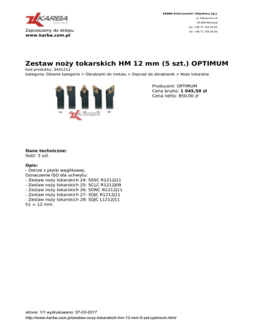 KARBA B.Karczewski i Wspólnicy Sp.J. ul. Fabryczna 14 53-609 Wrocław tel. +48 71 724-24-65 Zapraszamy do sklepu www.karba.com.pl tel. +48 71 718-20-03 Zestaw noży tokarskich HM 12 mm (5 szt.) OPTIMUM kod produktu: 3441212 kategoria: Główne kategorie > Obrabiarki do metalu > Osprzęt do obrabiarek > Noże tokarskie Producent: OPTIMUM Cena brutto: 1 045,50 zł Cena netto: 850,00 zł Dane techniczne: Ilość: 5 szt. Opis: - Ostrze z płytki węglikowej, Oznaczenie ISO dla uchwytu: - Zestaw noży tokarskich 24: SSSC R1212J11 - Zestaw noży tokarskich 25: SCLC R1212J09 - Zestaw noży tokarskich 26: SDNC N1212J11 - Zestaw noży tokarskich 27: SDJC R1212J11 - Zestaw noży tokarskich 28: SDJC L1212J11 h1 = 12 mm. strona: 1/1 wydrukowano: 07-03-2017 http://www.karba.com.pl/zestaw-nozy-tokarskich-hm-12-mm-5-szt-optimum.html