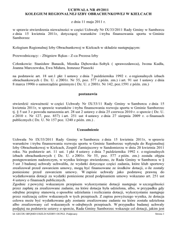 UCHWAŁA NR 49/2011 KOLEGIUM REGIONALNEJ IZBY OBRACHUNKOWEJ W KIELCACH z dnia 11 maja 2011 r. w sprawie stwierdzenia nieważności w części Uchwały Nr IX/33/2011 Rady Gminy w Samborcu z dnia 15 kwietnia 2011r, dotyczącej warunków i trybu finansowania sportu w Gminie Samborzec Kolegium Regionalnej Izby Obrachunkowej w Kielcach w składzie następującym: Przewodniczący: - Zbigniew Rękas - Z-ca Prezesa Izby Członkowie: Stanisław Banasik, Monika Dębowska–Sołtyk ( sprawozdawca), Iwona Kudła, Joanna Marczewska, Ewa Midura, Ireneusz Piasecki na podstawie art. 18 ust.1 pkt 1 ustawy z dnia 7 października 1992 r. o regionalnych izbach obrachunkowych ( Dz. U. z 2001r. Nr 55, poz. 577 z późn. zm.) i art. 91 ust 1 ustawy z dnia 8 marca 1990r o samorządzie gminnym ( Dz. U. z 2001r. Nr 142, poz.1591 z późn. zm.) postanawia stwierdzić nieważność w części Uchwały Nr IX/33/11 Rady Gminy w Samborcu z dnia 15 kwietnia 2011r, w sprawie warunków i trybu finansowania rozwoju sportu w Gminie Samborzec tj. § 5 ust 3 z powodu naruszenia art. 28 ust 2 ustawy z dnia 25 czerwca 2010 r. o sporcie ( Dz. U. z 2010 r. Nr 127, poz. 857) i art. 251 ust 4 ustawy z dnia 27 sierpnia 2009 r. o finansach publicznych ( Dz. U. Nr 157 poz. 1240 z późn. zm.) . Uzasadnienie Uchwała Nr IX/33/2011 Rady Gminy w Samborcu z dnia 15 kwietnia 2011r, w sprawie warunków i trybu finansowania rozwoju sportu w Gminie Samborzec wpłynęła do Regionalnej Izby Obrachunkowej w Kielcach, Zespół Zamiejscowy w Sandomierzu w dniu 20 kwietnia 2011 roku. Na podstawie art. 11 ust. 1 pkt 4 ustawy z dnia 7 października 1992 r. o regionalnych izbach obrachunkowych ( Dz. U. z 2001r. Nr 55, poz. 577 z późn. zm.) została objęta postępowaniem nadzorczym, w wyniku którego stwierdzono, że Rada Gminy w Samborcu w § 5 ust 3 badanej uchwały uchwaliła, że wydatki dotyczące części zadania, które klub sportowy zrealizował przed zawarciem umowy, mogą być finansowane ze środków dotacji, o ile zostały poniesione przed zawarciem umowy. W zapisie uchwały jako podstawę prawną do wydatkowania dotacji za wydatki poniesione przed podpisaniem umowy wskazano art. 251 ust 4 ustawy o finansach publicznych. Zgodnie z powyżej wskazanym przepisem wykorzystanie dotacji następuje w szczególności przez zapłatę za zrealizowane zadanie, na które dotacja była udzielona, albo, w przypadku gdy odrębne przepisy stanowią o sposobie udzielania i rozliczania dotacji, wykorzystanie następuje przez realizację celów wskazanych w tych przepisach. Z zapisu powyższego wynika, że dotacja celowa może być wydatkowana gdy zostanie zrealizowane zadanie na które została udzielona albo zrealizowany cel wskazanych w odrębnych przepisach. W przypadku badanej uchwały podjętej na podstawie ustawy o sporcie, Rada Gminy Samborzec wskazuje cel dotacji, jakim jest Id: GECDU-BFQMD-UHZLD-NZDRV-OCPGJ. Podpisany Strona 1 rozwój sportu propagującego rozwój fizyczny mieszkańców Gminy, krzewienie kultury fizycznej i sportu wśród mieszkańców ze szczególnym uwzględnieniem dzieci i młodzieży oraz budowę urządzeń sportowych, wykorzystanie dotacji nastąpi przez realizację w/w celów. Jednakże cele te będą realizowane od momentu kiedy podpisana zostanie umowa pomiędzy gmina a podmiotem wyłonionym w trybie określonym w badanej uchwale. Podmiot, który ma realizować cele wskazane w uchwale do chwili podpisania z nim umowy nie może wydatkować środków na realizację objętego uchwałą Rady Gminy w Samborcu celu, ponieważ nie wie jeszcze czy zostanie wyłoniony do jego realizacji. Kolegium zwraca ponadto uwagę, że zgodnie z art. 28 ust 2 ustawy o sporcie dotacja może być przeznaczona w szczególności na; - realizacje programu szkolenia sportowego, - zakup sprzętu sportowego, - pokrycie kosztów organizowania zawodów sportowych lub uczestnictwa w tych zawodach, - pokrycie kosztów korzystania z obiektów sportowych dla celów szkolenia sportowego, - sfinansowanie stypendiów sportowych i wynagrodzenia kadry szkoleniowej jeżeli wpłynie to na poprawę warunków uprawiania sportu przez członków klubu sportowego, który otrzyma dotację. Przepis ten jednoznacznie wskazuje, że dotacja ma być wydatkowana na cele w nim wskazane przez podmiot, który otrzyma dotacje. Do chwili podpisania umowy, na realizację celu jakim zgodnie z podjętą uchwałą jest rozwój sportu propagującego rozwój fizyczny mieszkańców Gminy, krzewienie kultury fizycznej i sportu wśród mieszkańców ze szczególnym uwzględnieniem dzieci i młodzieży oraz budowę urządzeń sportowych, podmiot nie może dokonywać wydatków z tej dotacji, gdyż jeszcze nie wie czy ją uzyska. Biorąc powyższe pod uwagę Kolegium orzekło jak w sentencji. Pouczenie Od niniejszej uchwały Kolegium Regionalnej Izby Obrachunkowej w Kielcach przysługuje skarga za pośrednictwem Regionalnej Izby Obrachunkowej w Kielcach do Wojewódzkiego Sądu Administracyjnego w Kielcach w terminie 30 dni od dnia doręczenia. Przewodniczący Kolegium Id: GECDU-BFQMD-UHZLD-NZDRV-OCPGJ. Podpisany Strona 2